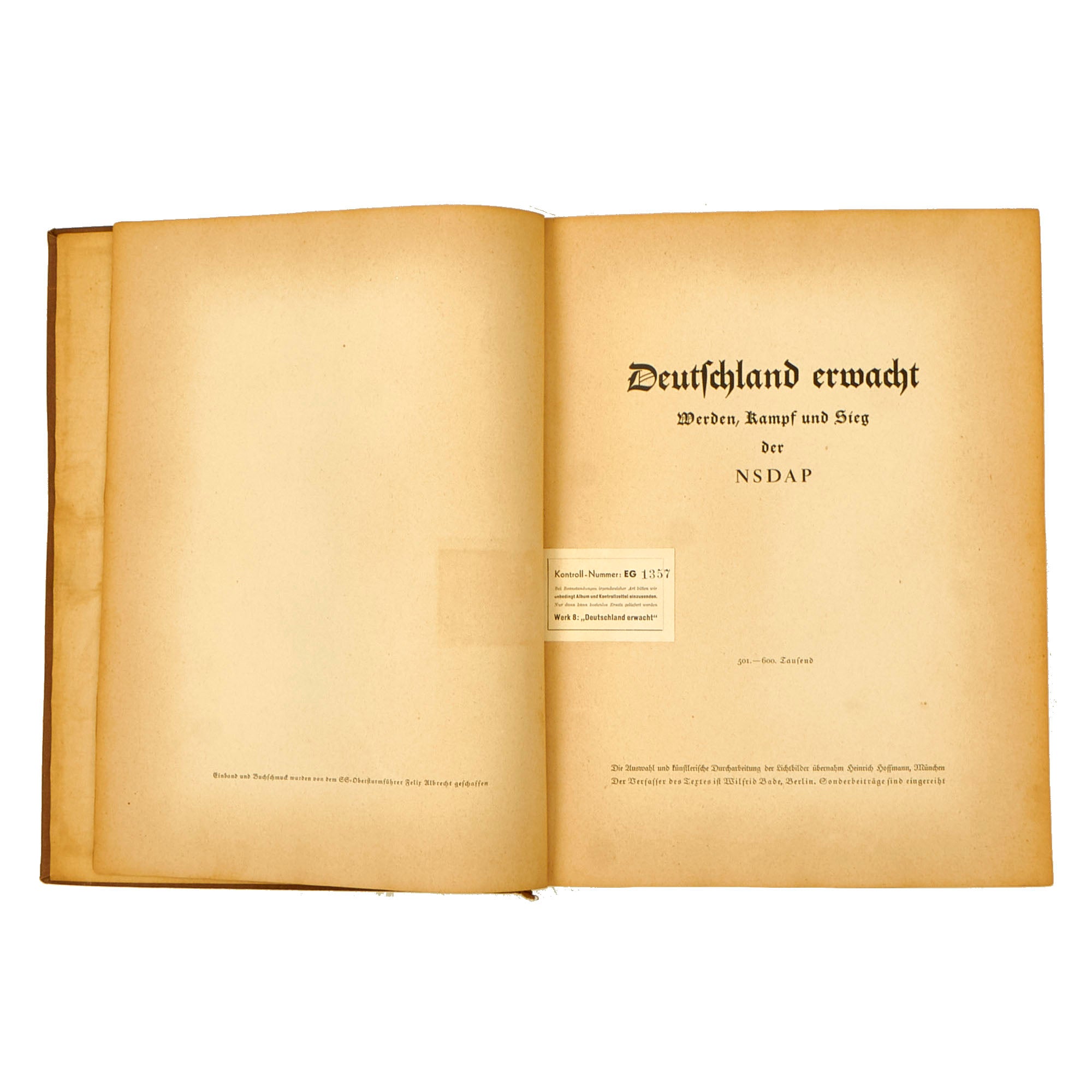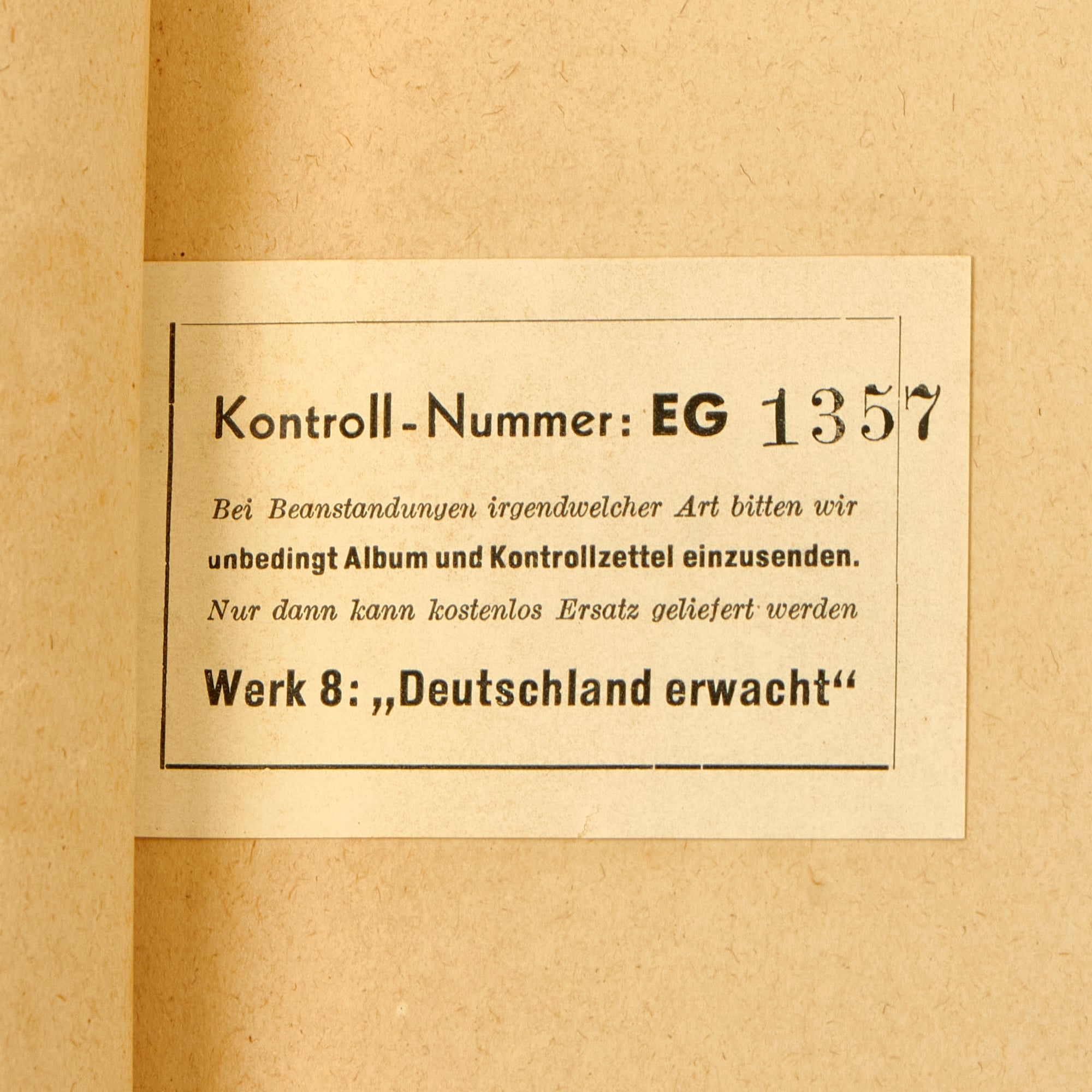 Original Item: Only One Available. This is a rare Deutschland erwacht: Werden, Kampf und Sieg der NSDAP (Germany Awakes: The formation, battle and victory of the NSDAP) hardcover "cigarette card" album. These were a companion to the NSDAP produced "documentary" propaganda film, Deutschland erwacht – Ein Dokument von der Wiedergeburt Deutschlands (Germany Awakes - A documentary of the Rebirth of Germany). This example is edition 501-600. Tausend (501-600 Thousand), so it was probably printed in the mid 1930s by Cigaretten=Bilderdienst (Cigarette Picture Service) of Altona-Bahrenfeld. Very early editions of this still retained pictures of Ernst Röhm, before he was executed during the "Night of the Long Knives", however this has a picture of Viktor Lutze, his replacement.