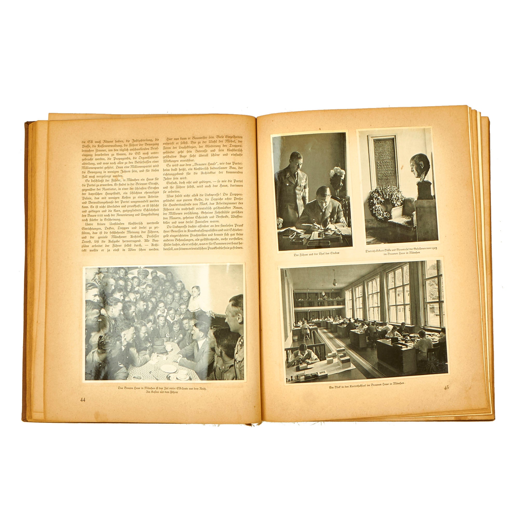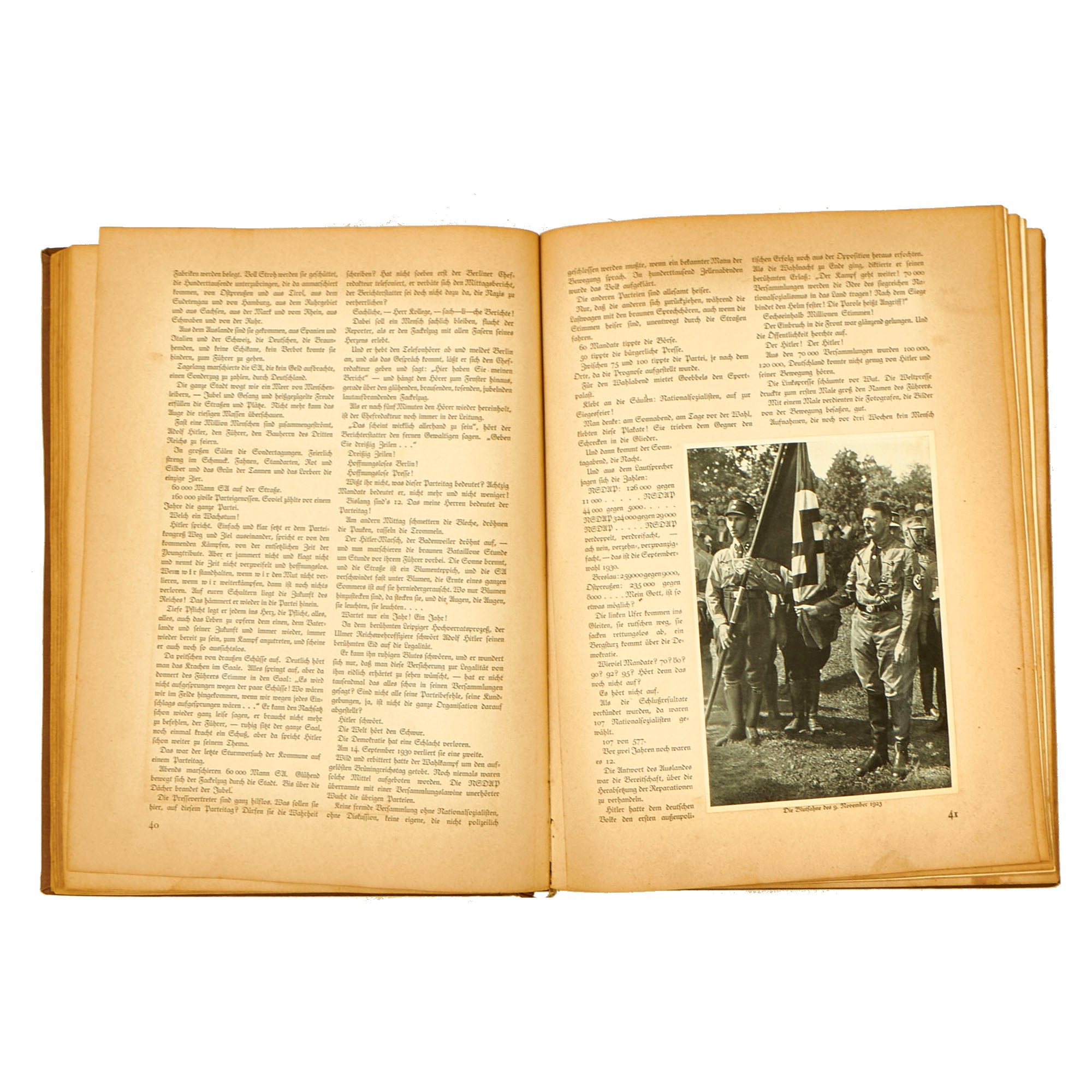 It is approximately 150 pages long, hardcover, and features a huge number of glued in pictures, as well as some very impressive portraits of the top level NSDAP leadership. It even still has the MASSIVE foldout picture of the 1933 NSDAP rally in Nürnberg, which is 12 inches wide and over 4 FEET long! It measures approximately 9 1/2"W x 12 1/2"H x 1", and is offered in very good condition. This is one of many collectible books released after the NSDAP rise to power in 1933, and is both a collector's book as well as a history book. It does look to have seen moisture exposure over a long period, which has resulted in overall ripping, as well as some staining. It also has resulted in the adhesive holding the cards on to weaken in areas.