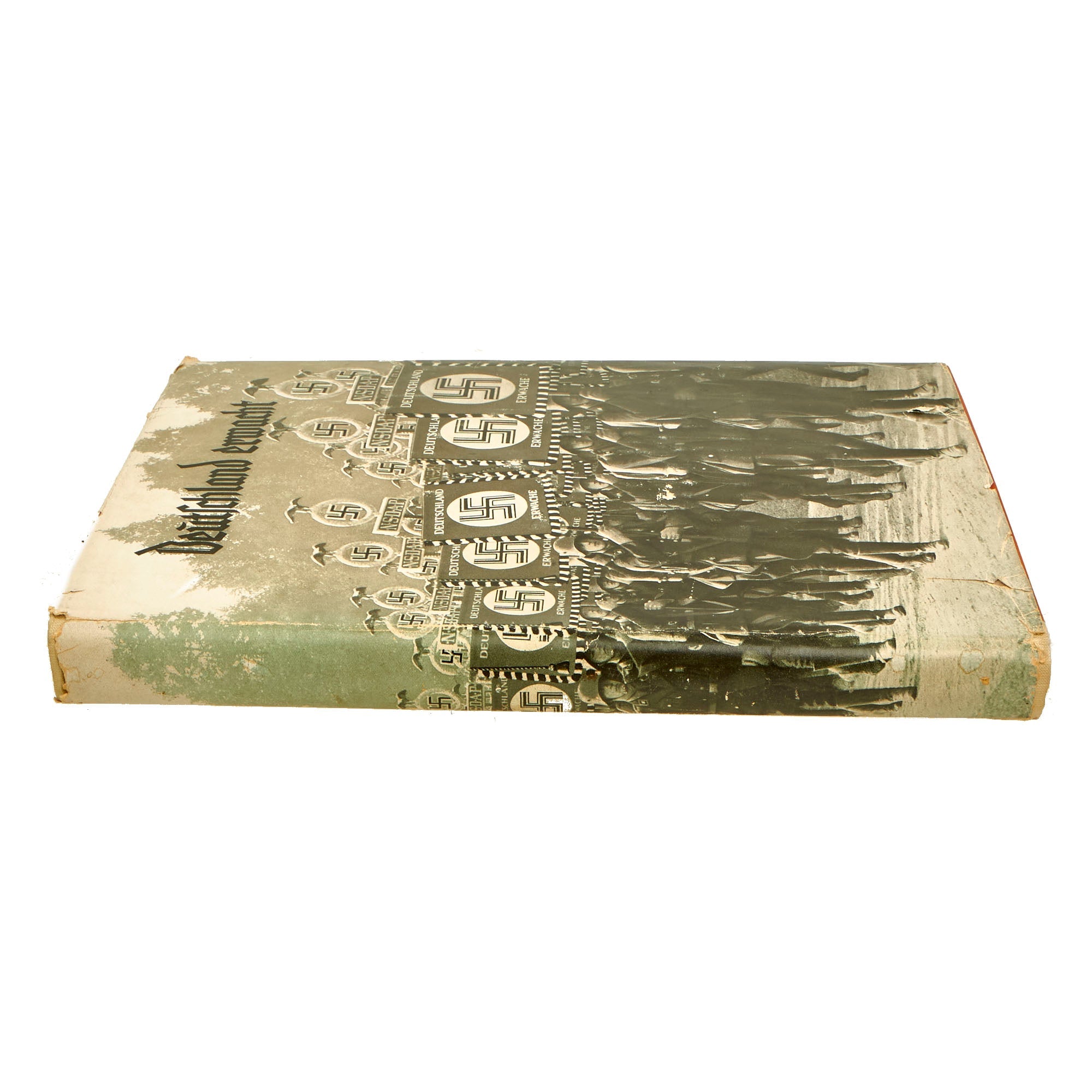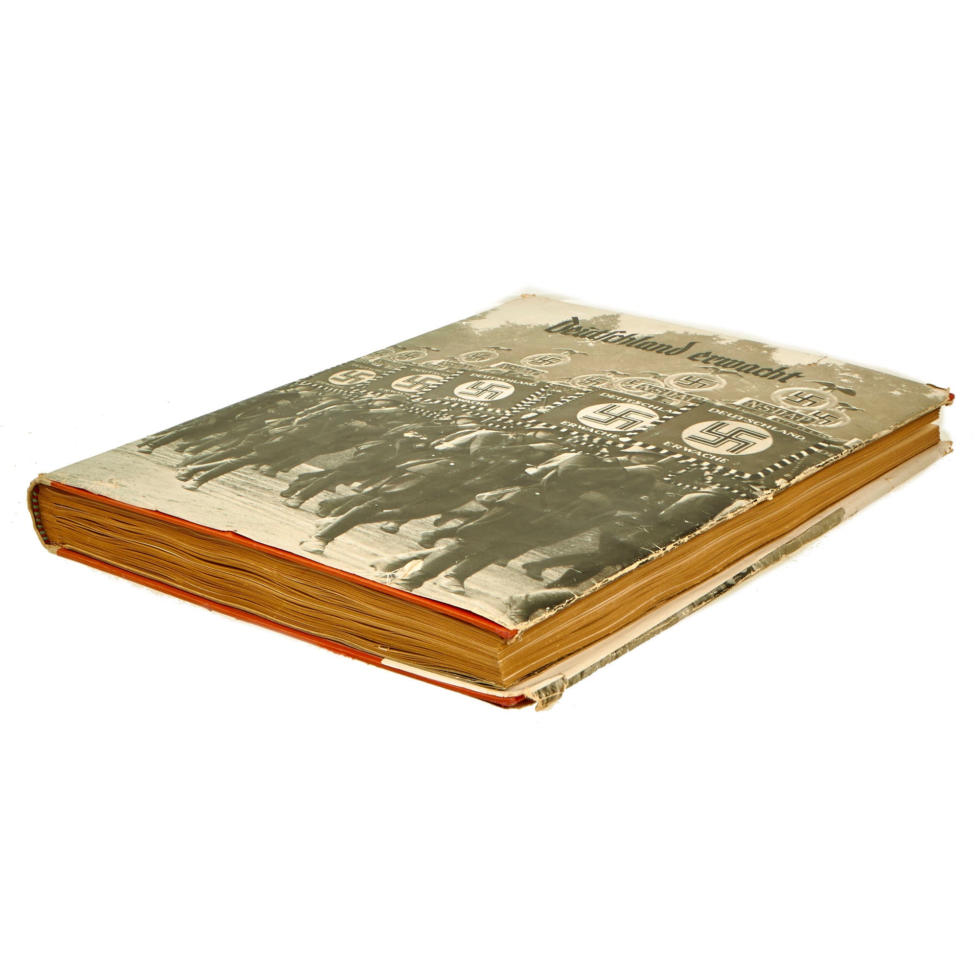 Original Item: Only One Available. This is a rare Deutschland erwacht: Werden, Kampf und Sieg der NSDAP (Germany Awakes: The formation, battle and victory of the NSDAP) hardcover "cigarette card" album, complete with the rare original slip cover, almost always lost. These were a companion to the NSDAP produced "documentary" propaganda film, Deutschland erwacht – Ein Dokument von der Wiedergeburt Deutschlands (Germany Awakes - A documentary of the Rebirth of Germany). This example is edition 1176-1275. Tausend (1176-1275 Thousand), so it was probably printed in the late 1930s by Cigaretten=Bilderdienst (Cigarette Picture Service) of Altona-Bahrenfeld.