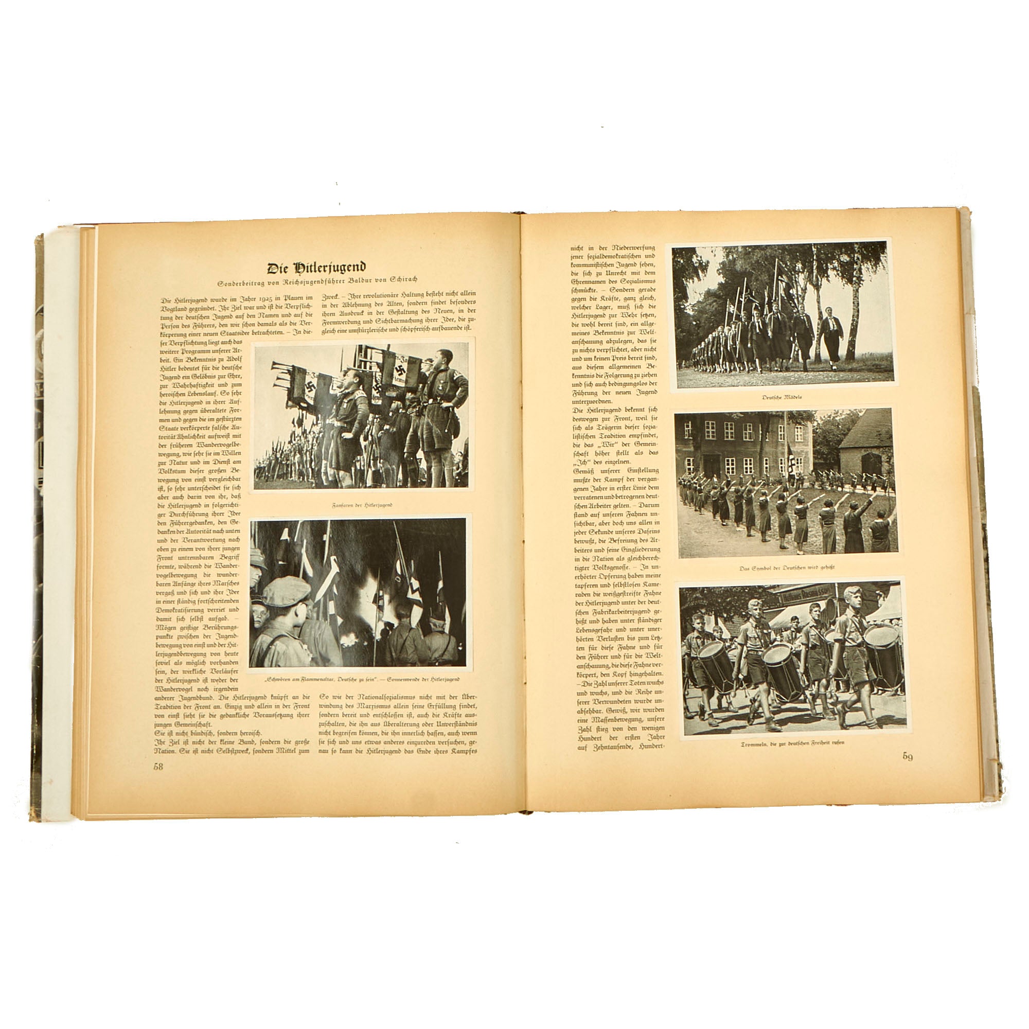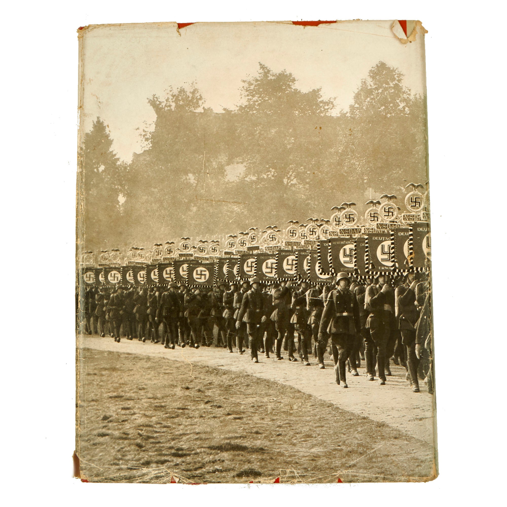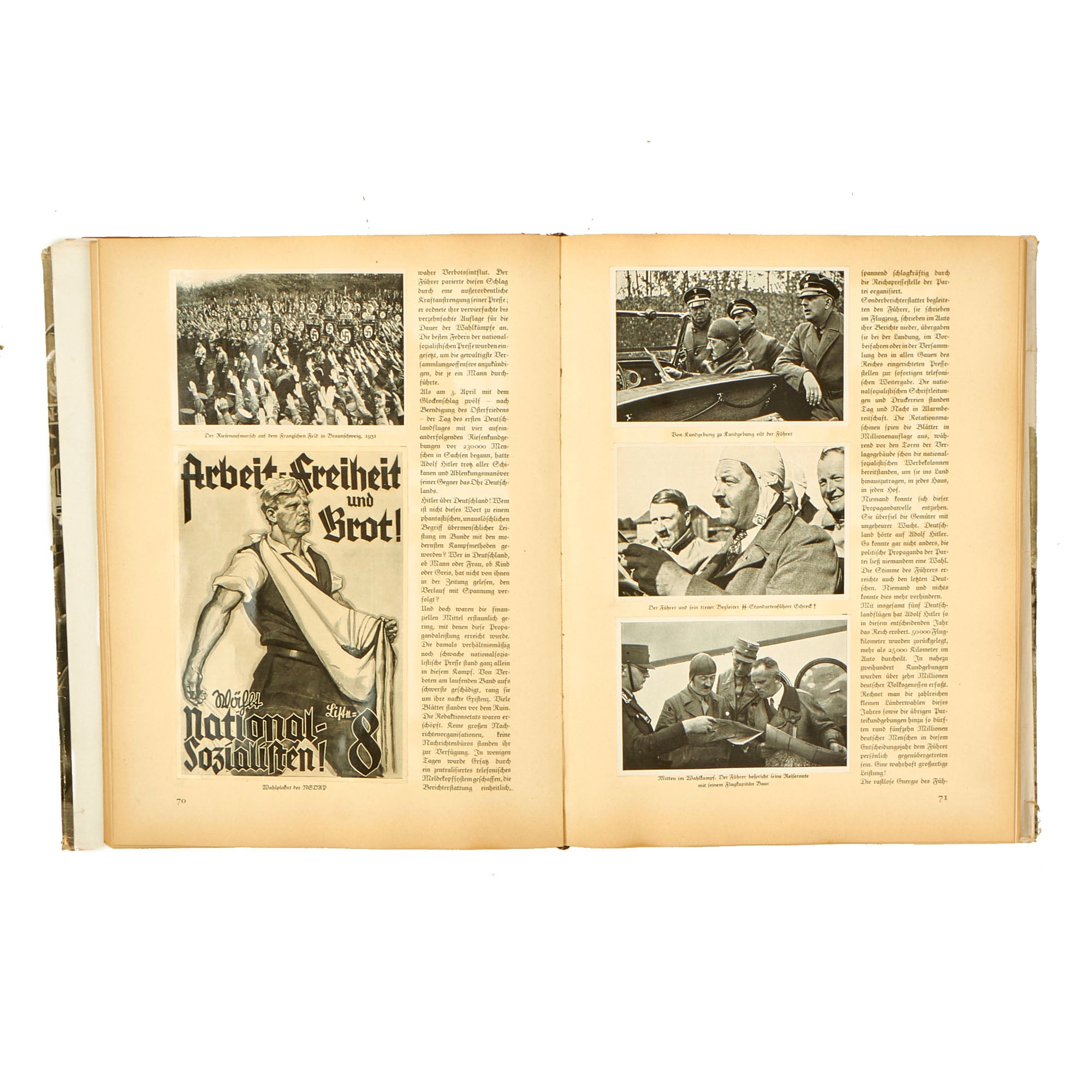 It is approximately 150 pages long, softcover, and features a huge number of glued in pictures, as well as some very impressive portraits of the top level NSDAP leadership. It even still has the MASSIVE foldout picture of the 1933 NSDAP rally in Nürnberg, which is 12 inches wide and over 4 FEET long! It measures approximately 9 1/2"W x 12 1/2"H x 1", and is offered in very good condition. This is one of many collectible books released after the NSDAP rise to power in 1933, and is both a collector's book as well as a history book.
