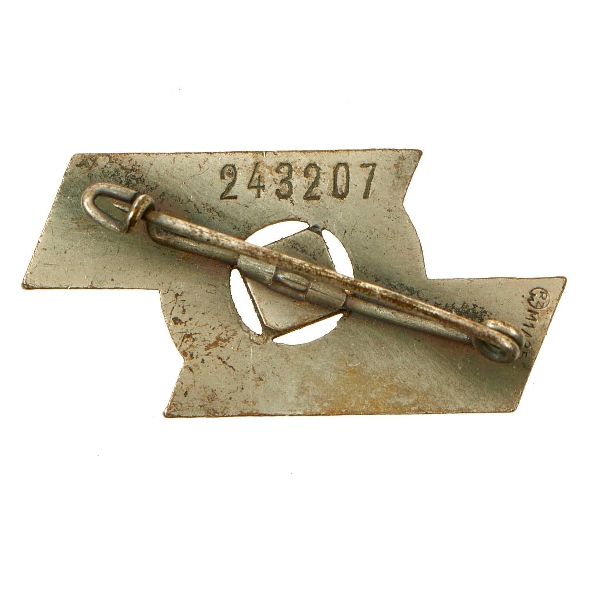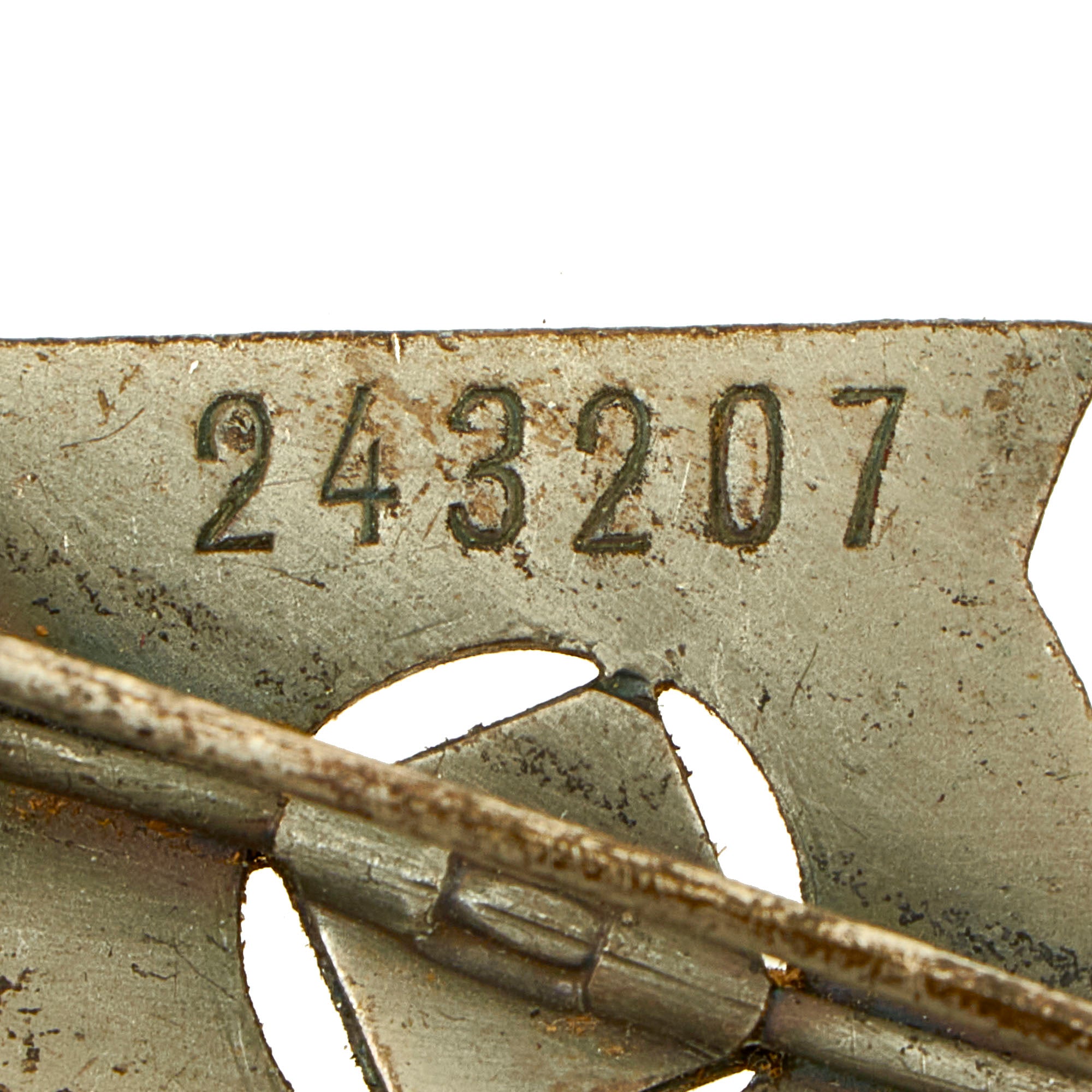 The reverse of the badge features a large safety pin type attachment, which is fully functional. Just above this is a tiny (RZM) M1/35 maker code, for Wachtler & Lange of Mittweida, a known maker of this badge. There is also issue serial number 243207 stamped on the left side.