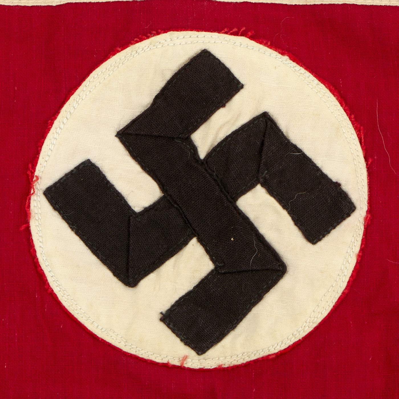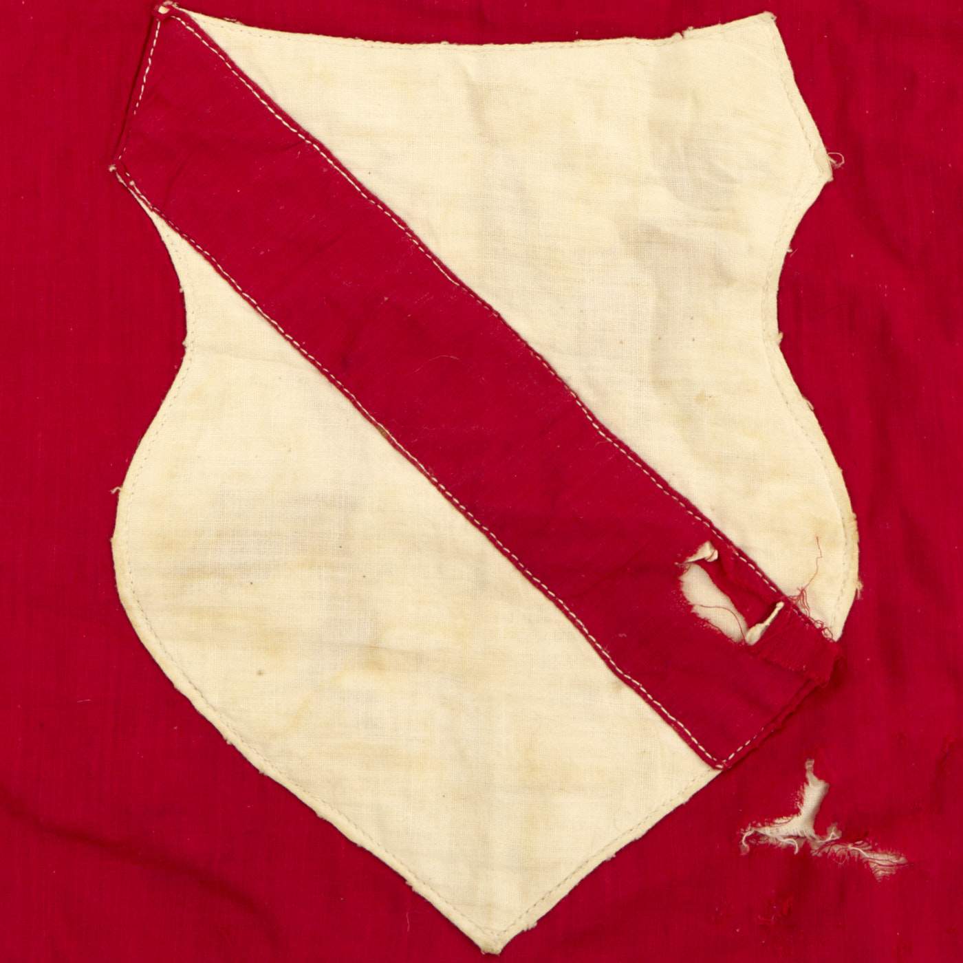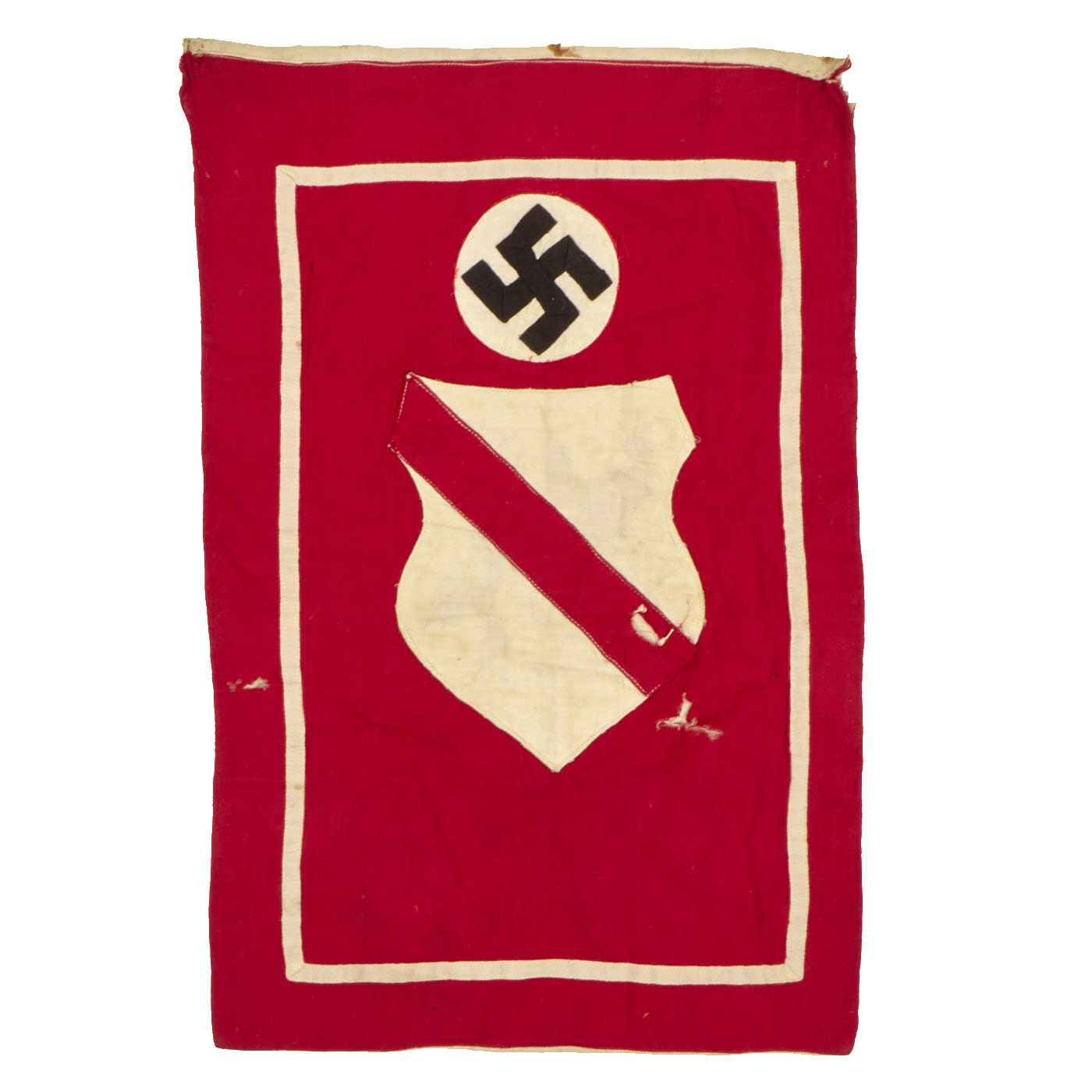 One side has a red background, with a white border inside, and a central white shield with a red stripe across it. We unfortunately have not been able to identify which city or state this emblem is from. Towards the top there is a stitched on multipiece swas (hook cross) emblem, which looks to have been cut out of an armband and attached, as some of the red background can be seen protruding out from the edges. The stitching also goes through both sides, so it definitely looks to have been added later during the NSDAP period.