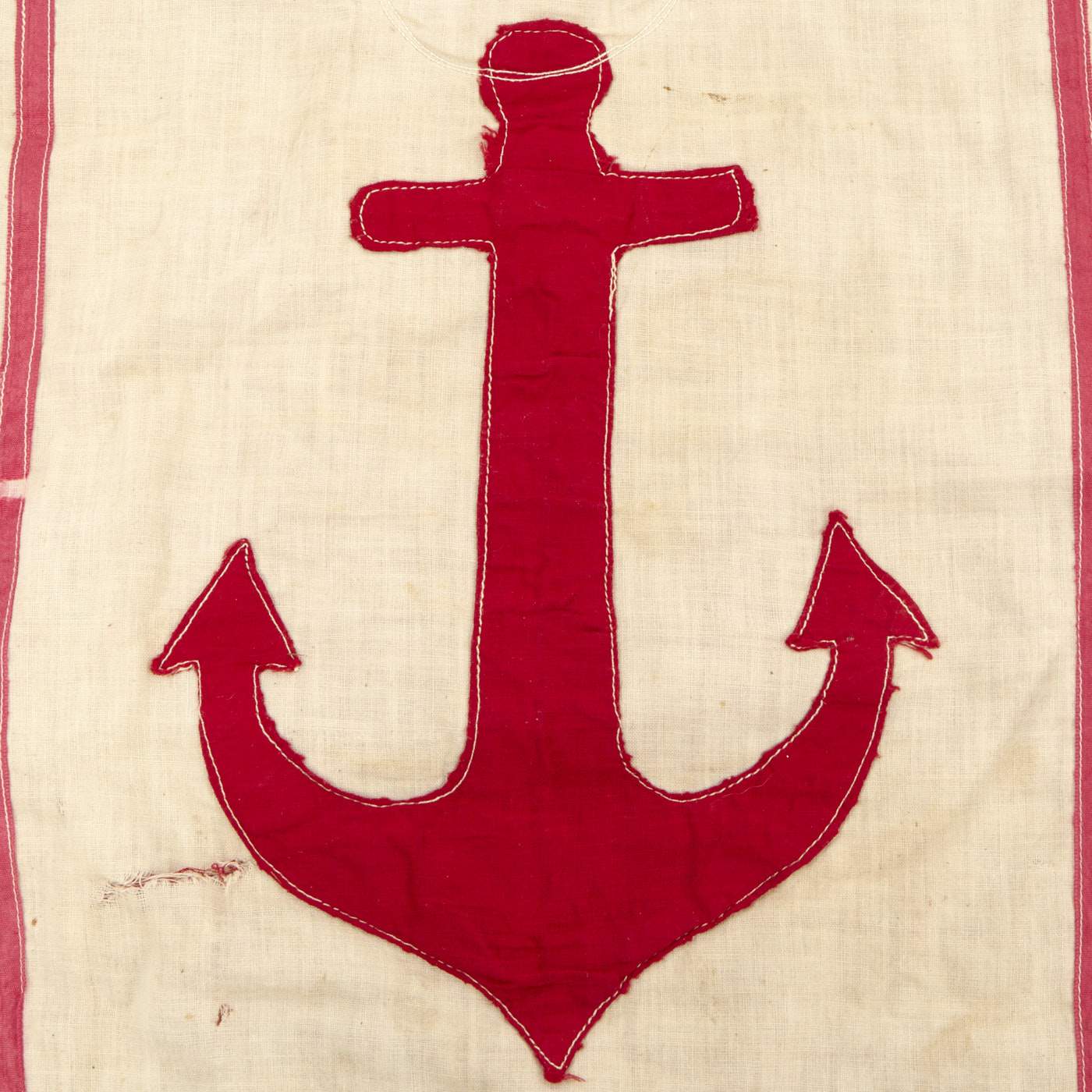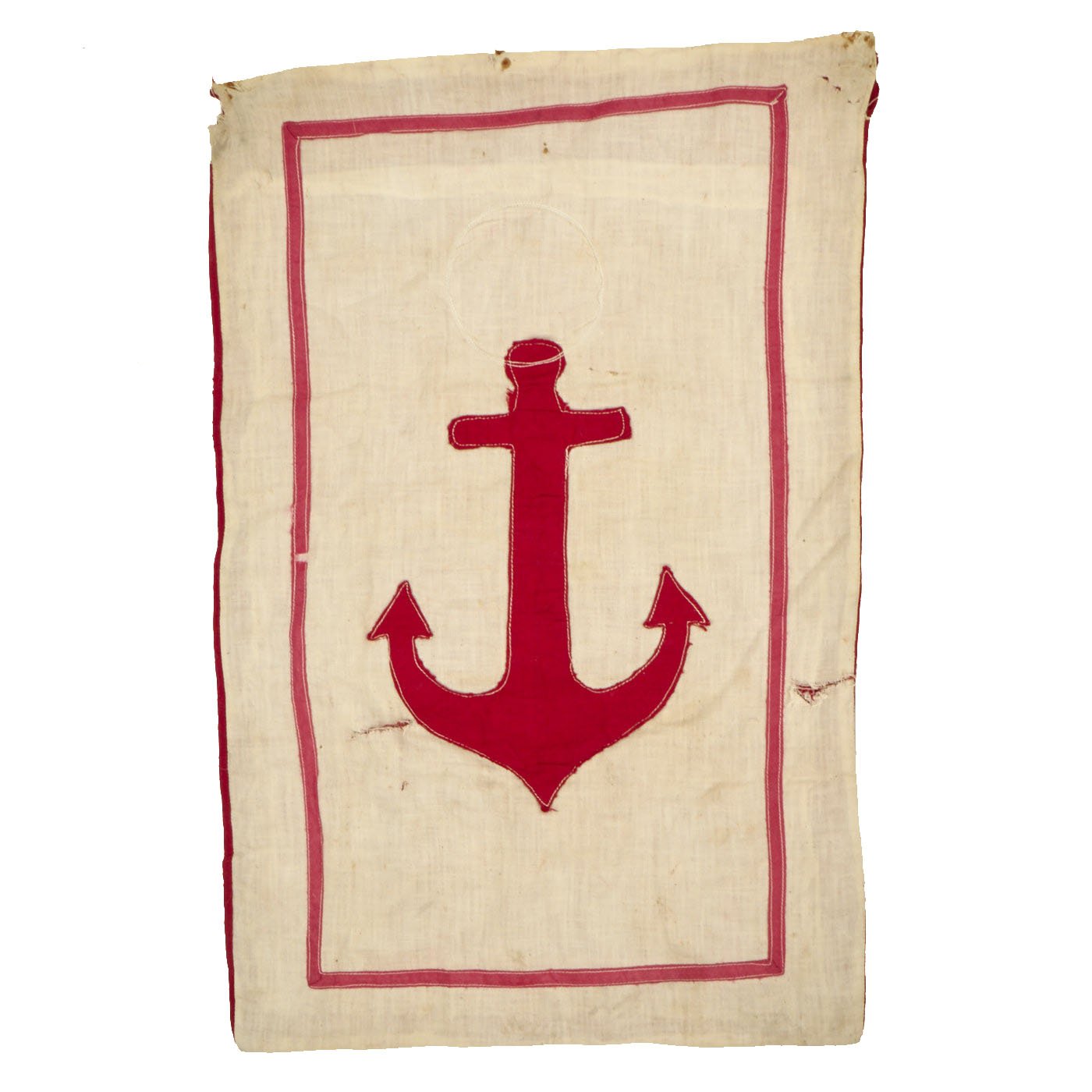 The other side has a white background, with a pink rayon border inside, and a central red anchor.