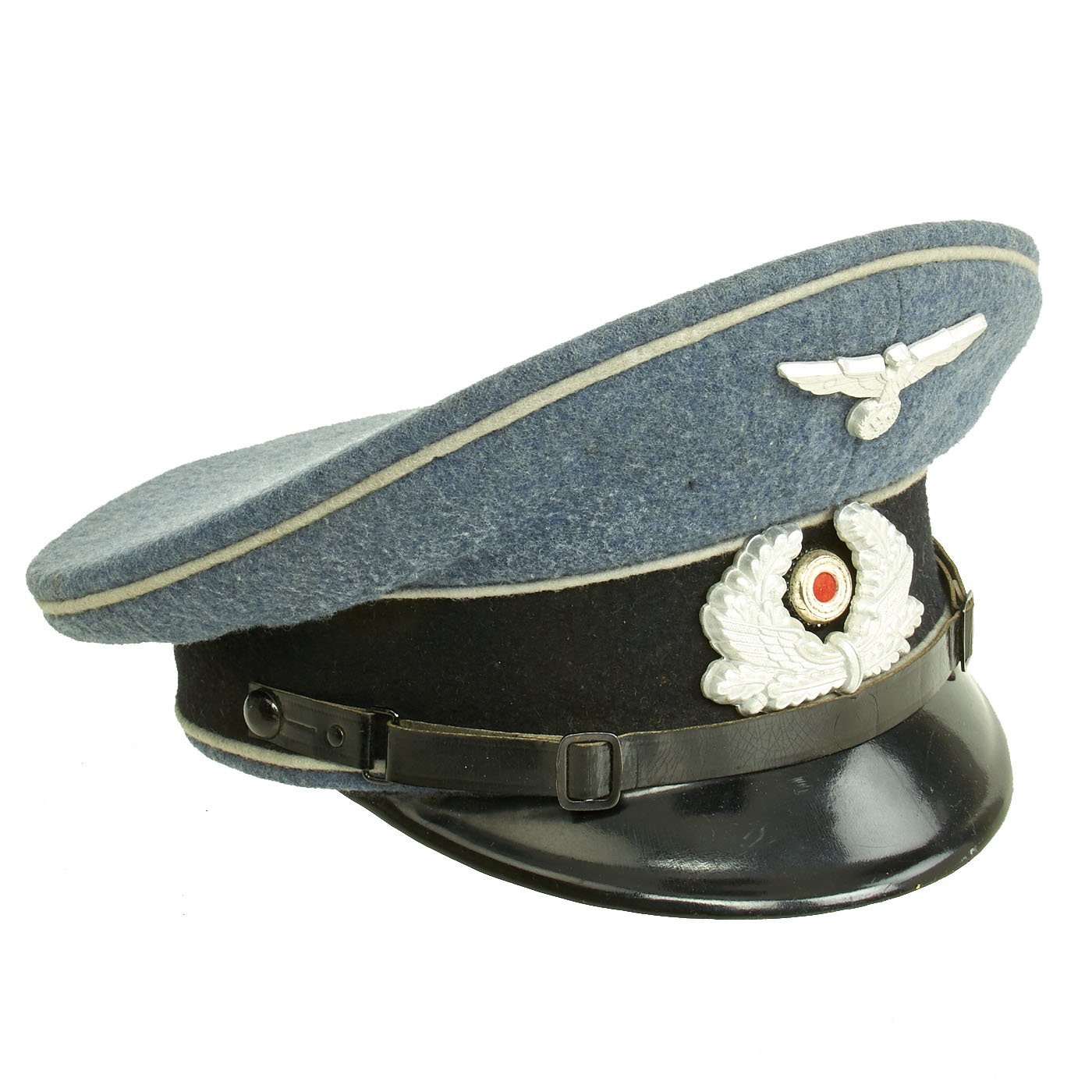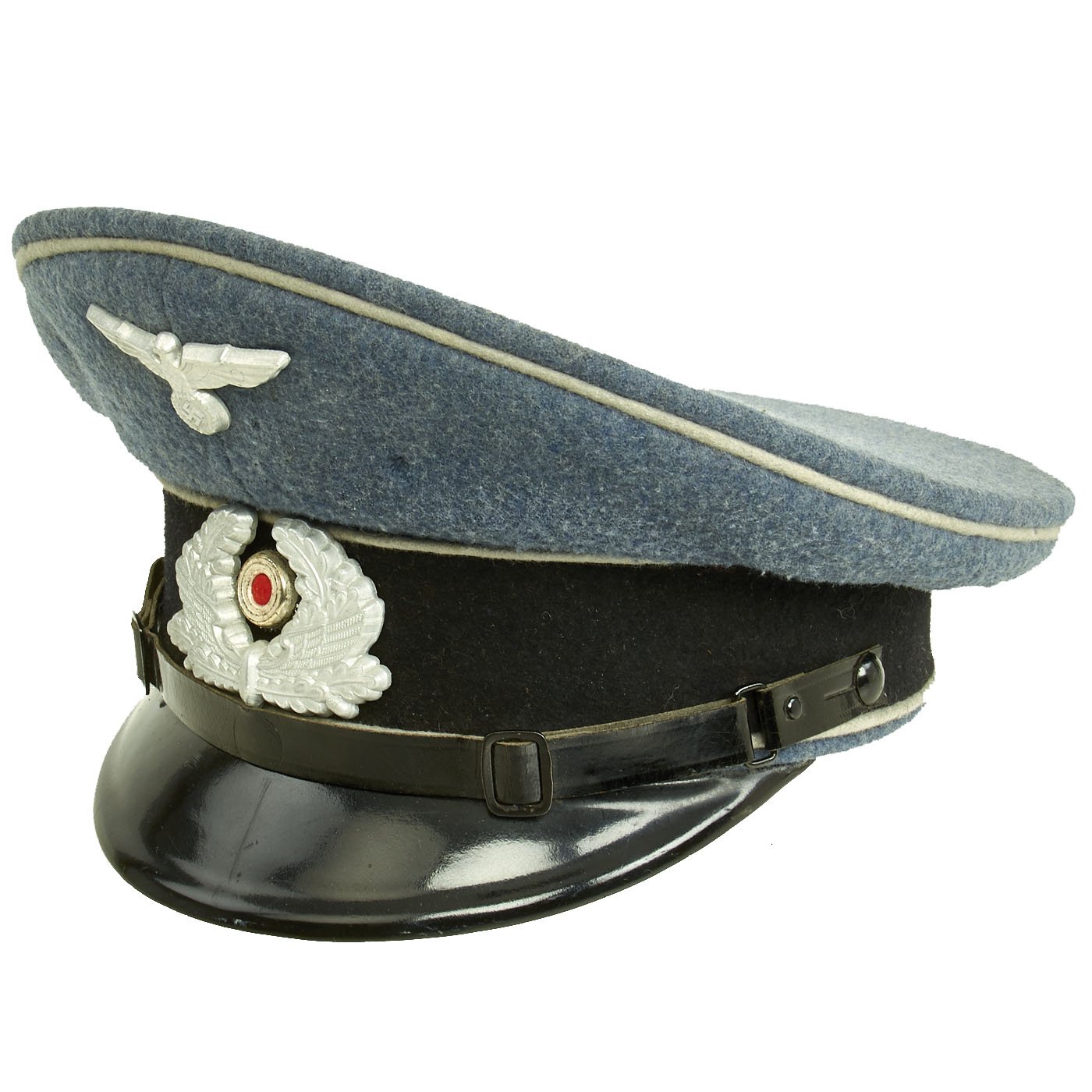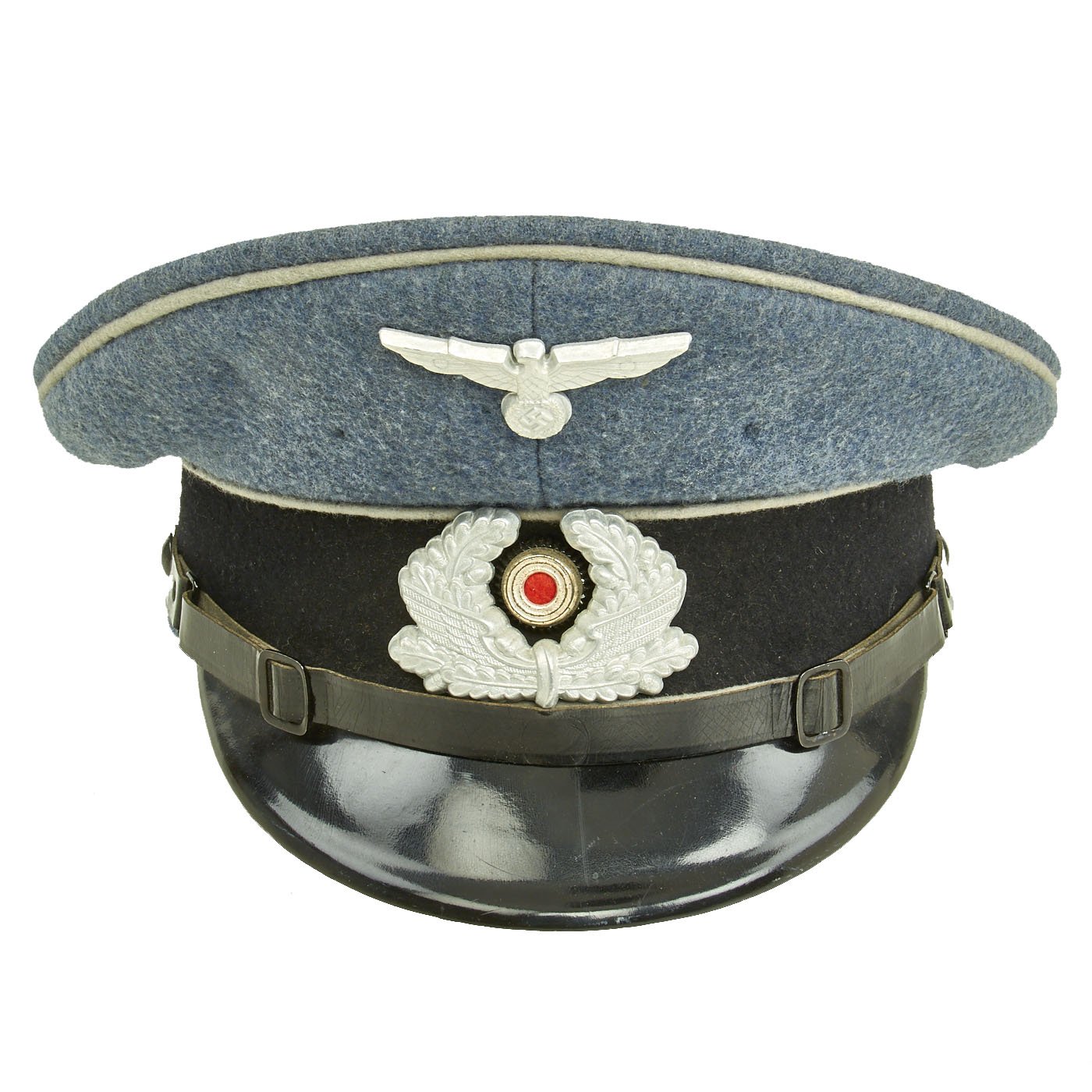 The visor cap (Schirmmütze) was an important part of the headgear worn by German uniformed military, civil, paramilitary and political organizations during the Third Reich. This was the standard cloth headgear worn as a part of the service uniform. Visor caps were worn outdoors as well as indoors, and were often required to be worn by all personnel on duty. Visor caps were made in versions specific to each organization and were often further differentiated through the use of insignia, colored piping, or style of chin cord, to indicate rank, role or branch. The insignia used on these caps ranged from simple stamped metal emblems, to elaborate hand embroidery. Visor caps were issued to enlisted soldiers and NCOs in the military and in some other organizations. Officers had to purchase their own hats, and lower ranks could choose to purchase caps that were of a higher quality than the rather basic, issue examples. The private purchase caps were generally made in very high quality, with fine materials. A wide variety of fabrics were used, from Trikot and doeskin, to heavy wool, or even lightweight white fabric for summer wear. In the military, issue of these caps was generally suspended shortly after the outbreak of the war, but they continued to be worn by some troops until the end of the war.