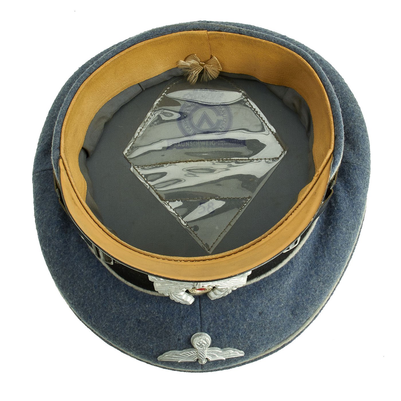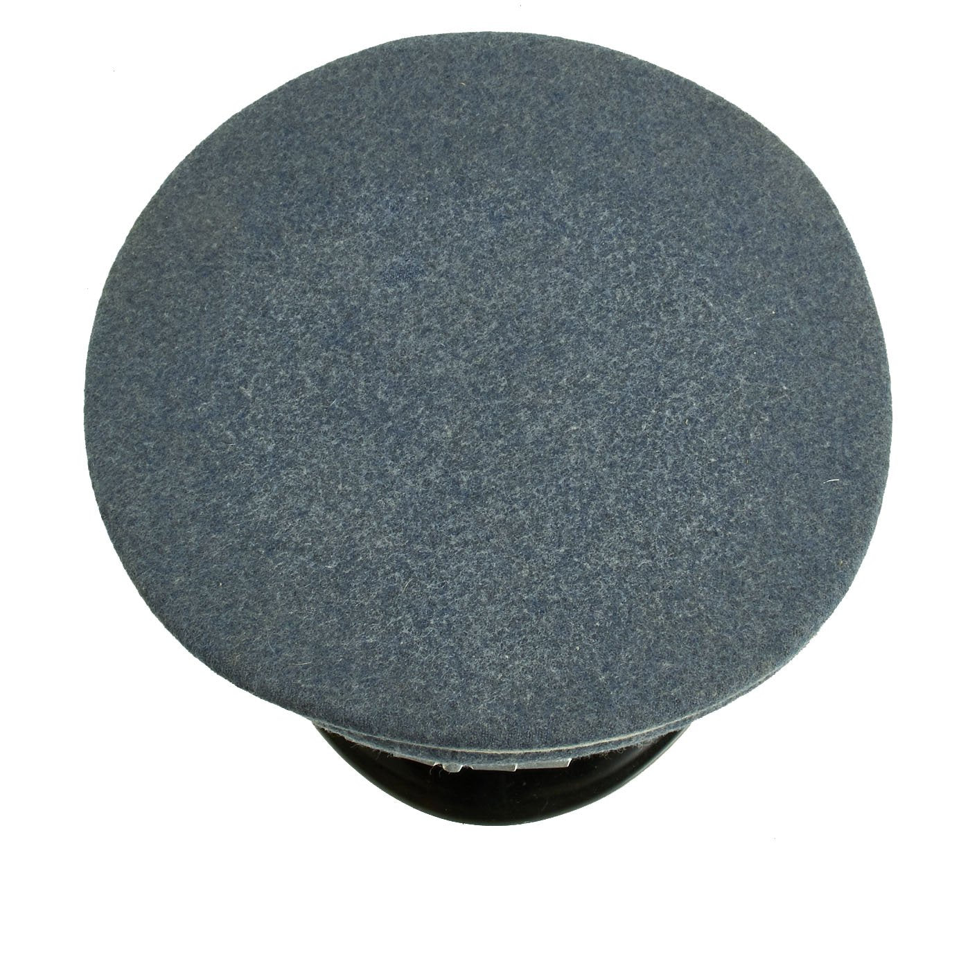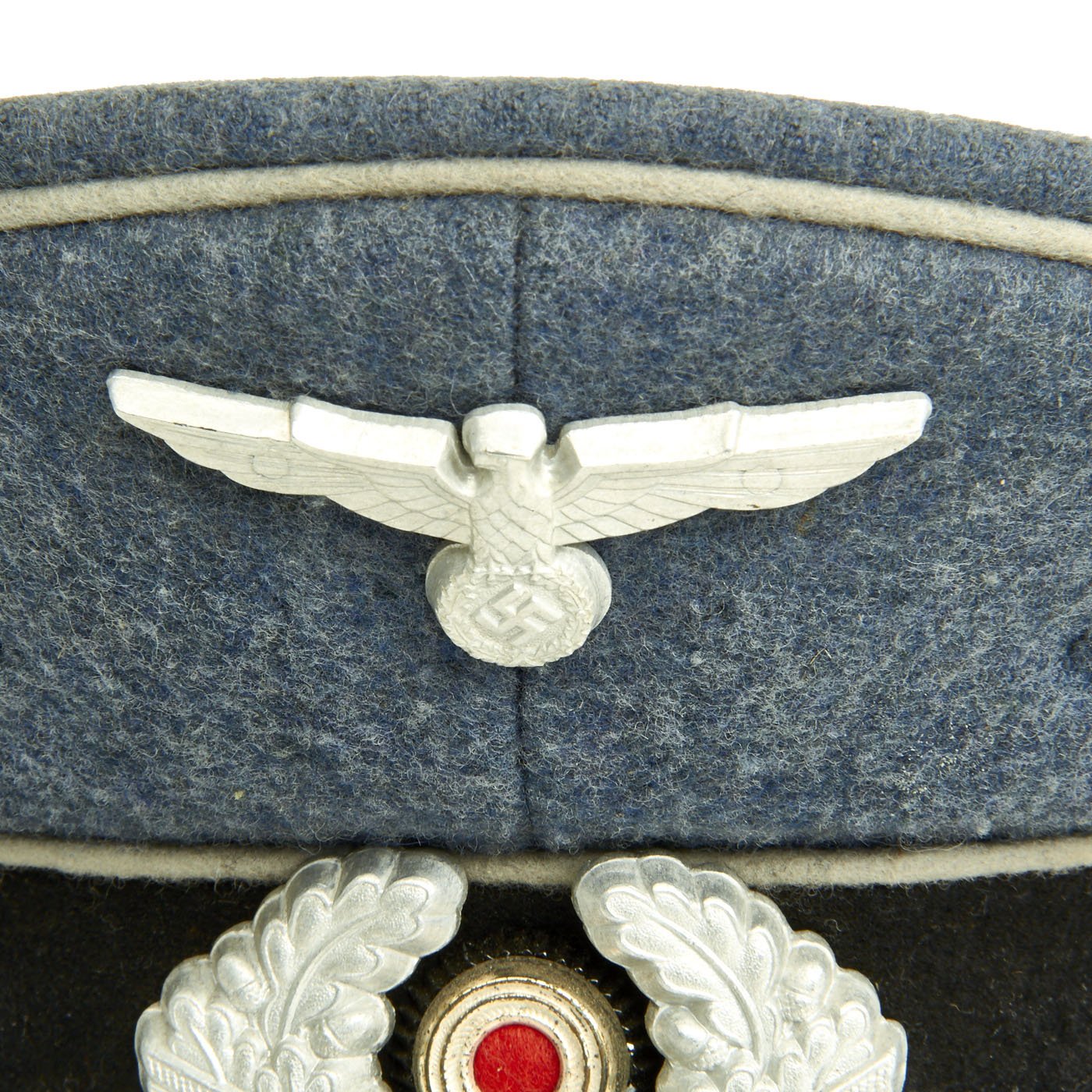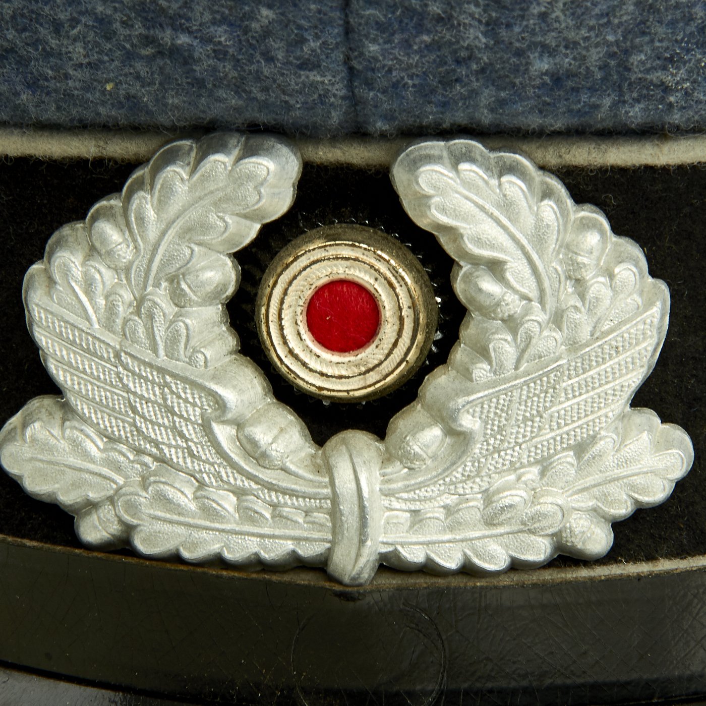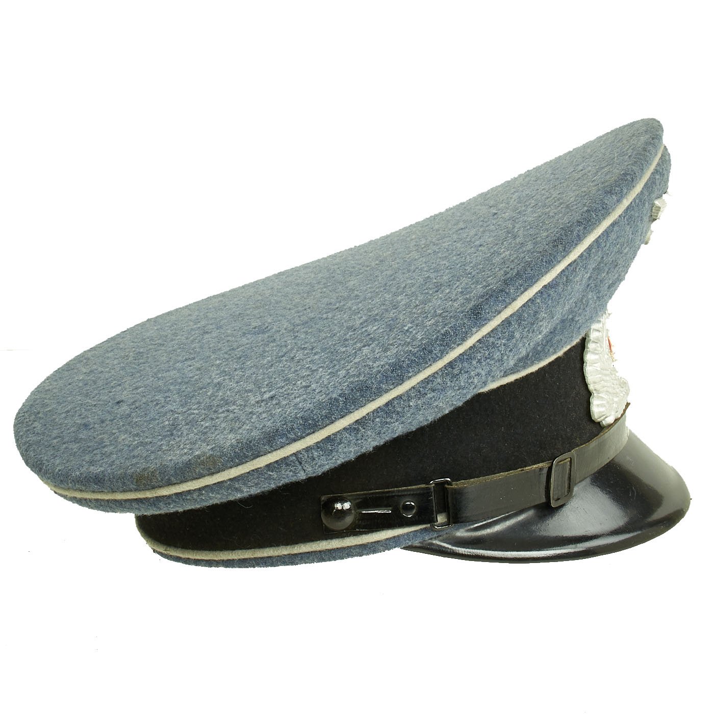Original Item: Only One Available. This is an excellent condition example of a German WWII DRB Bahnschutzpolizei (Railway protection police) Schirmmütze (visor cap). This example shows high quality fabrication, made with the correct light blue-gray worsed wool with a black wool cap band and a traditional high front. The cap has light gray Waffenfarbe (corps color) piping along the top edge and flanking either side of the band, indicating the branch to be Railway.
