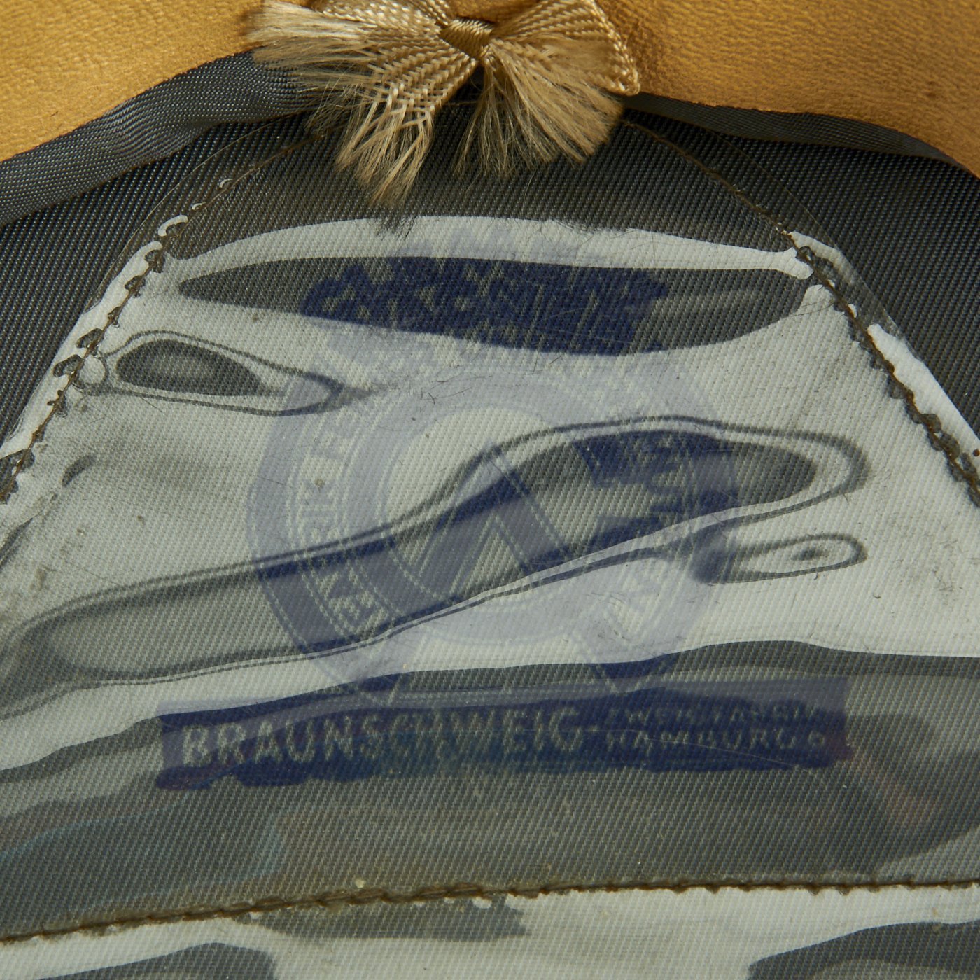 It is decorated with a well detailed silvered aluminum eagle insignia on the peak and and an open silvered aluminum oak leaf and acorn wreath surrounding a metal tri-color cockade with a red felt insert on the band. The wreath also incorporates the "Winged Wheel" DRB emblem on the bottom, which is specific to the Railway Protection Police. The dual-buckled black leather chinstrap, designating the wearer to be an enlisted man, is attached to black lacquered buttons on either side. The vulcanfibre visor has a smooth black leather-look upper, exhibiting slight wear along the edge and is tan on the underside. The tan leather sweatband is in good supple condition, with only light wear and no tearing