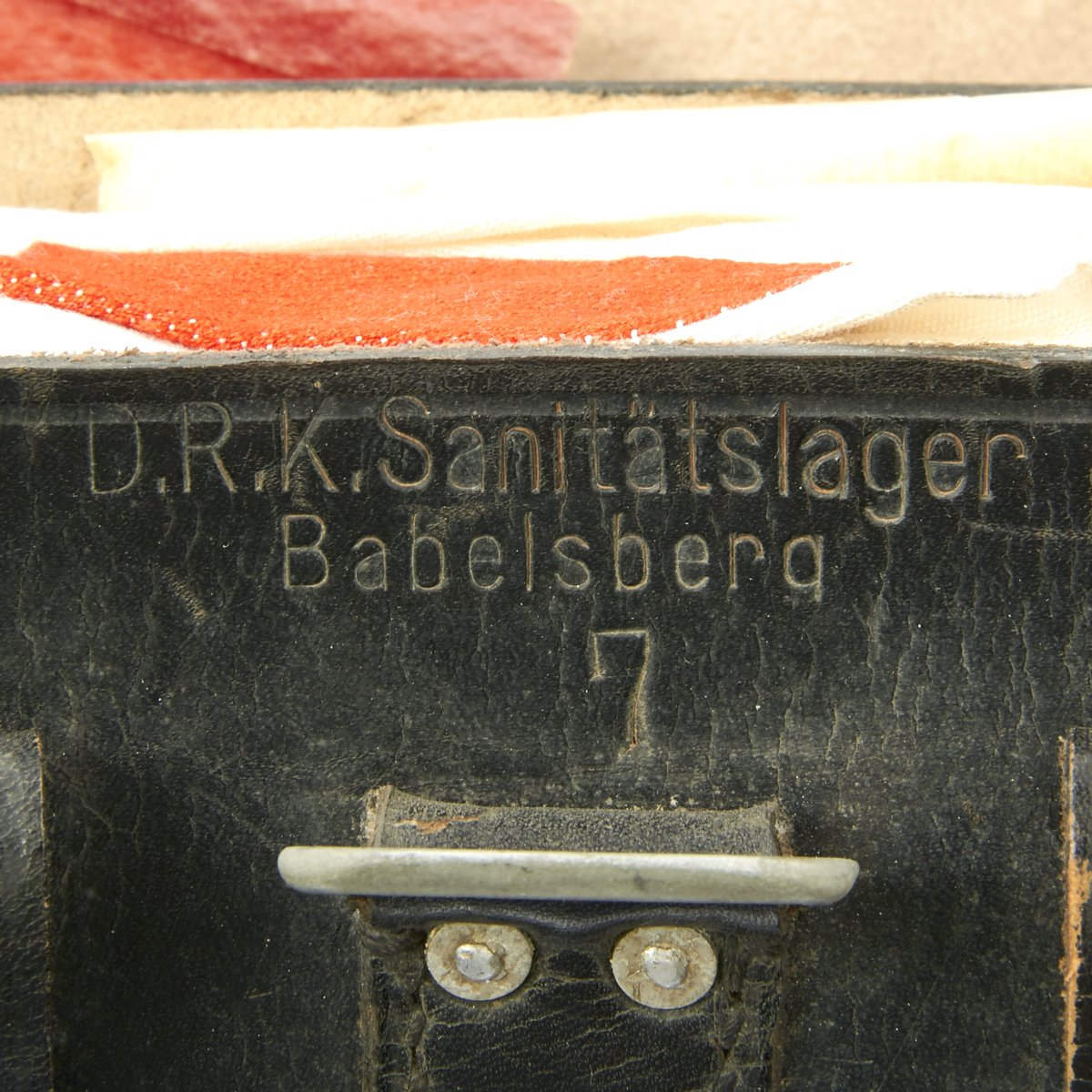 Original Item: Only One Available. This is an original WWII era black leather Deutsches Rotes Kreuz medic pouch. Nicely stamped on the reverse: D.R.K. Sanitätslager Babelsberg 7. Shows some minor scuffing from wear and use but very good condition overall. Also included are the original medical supplies including: