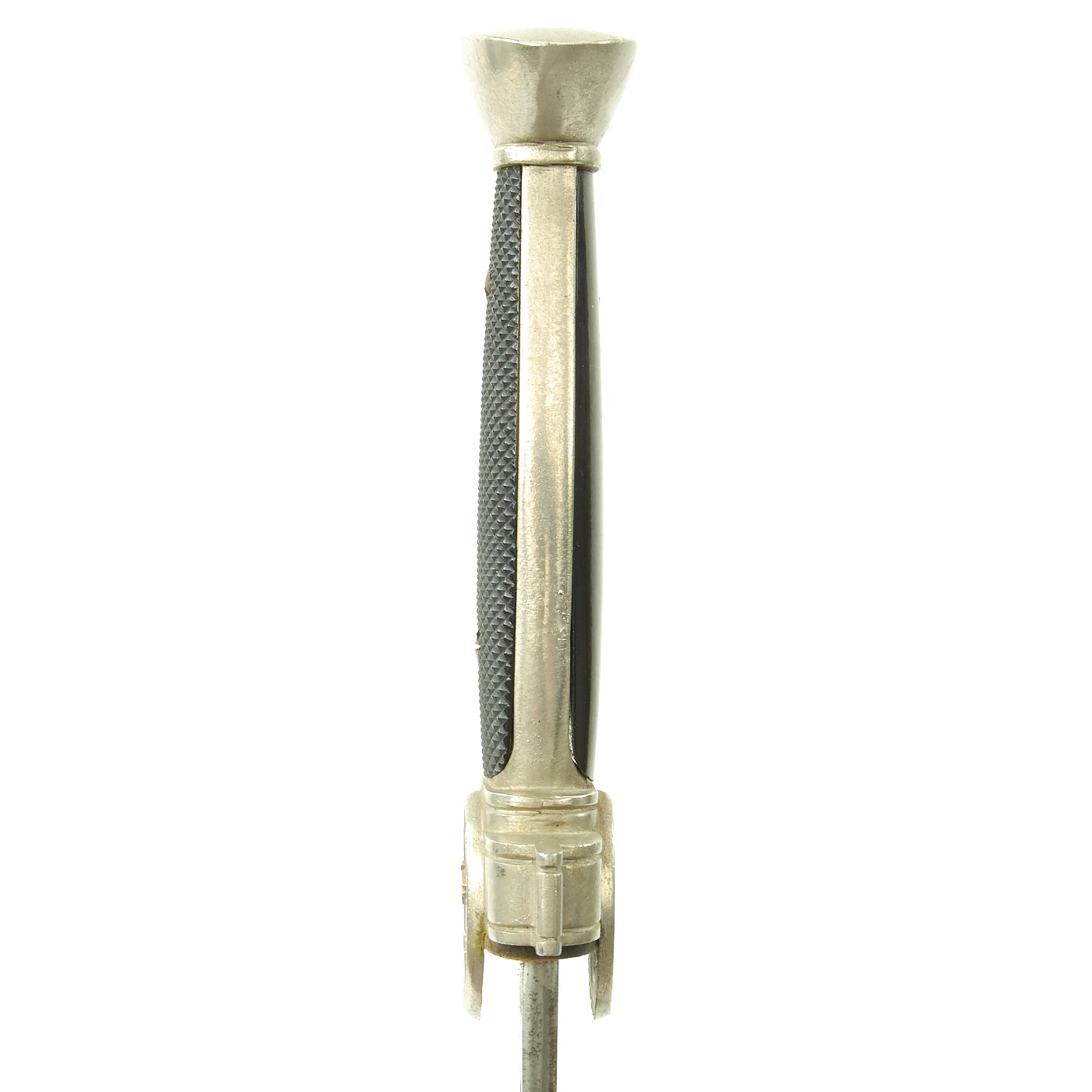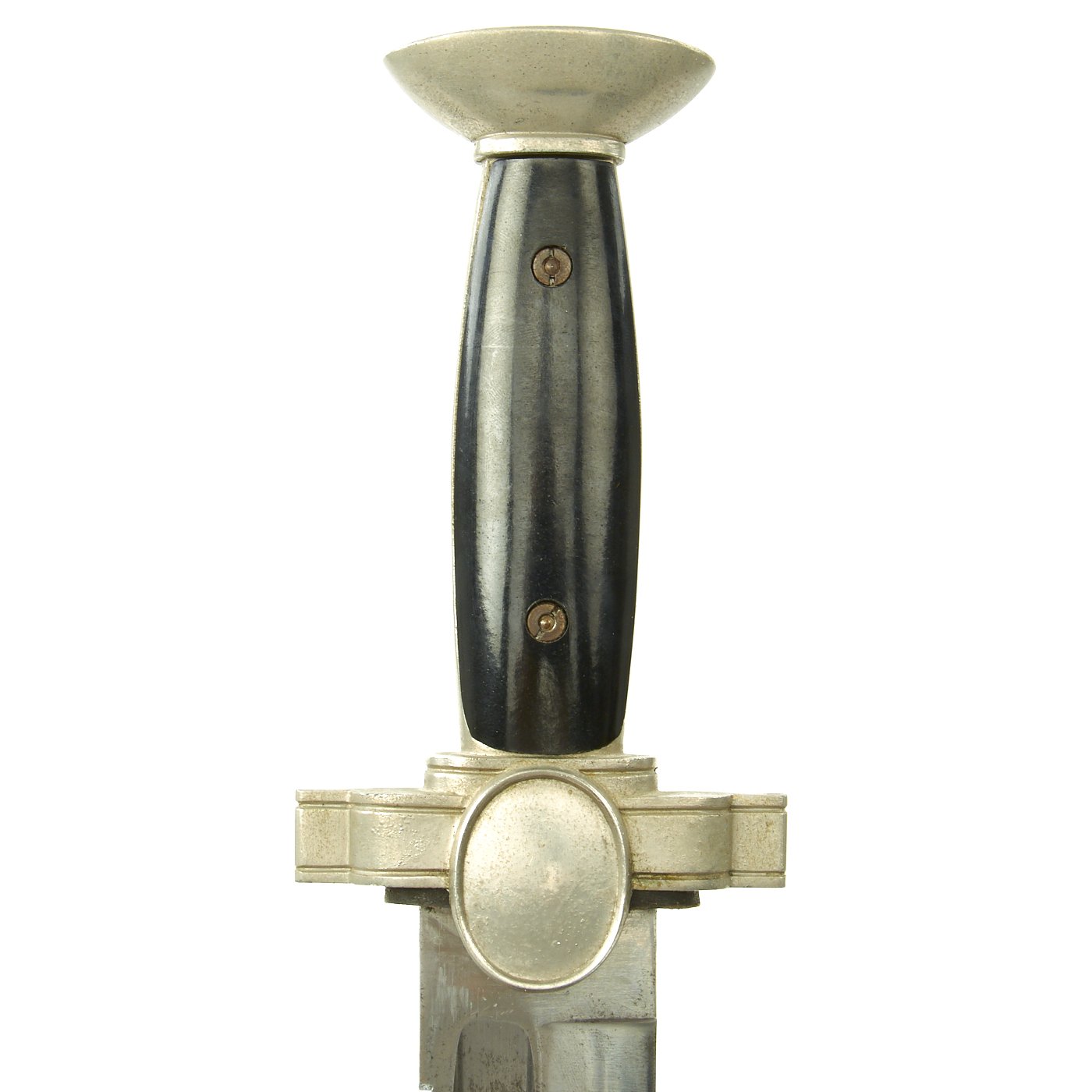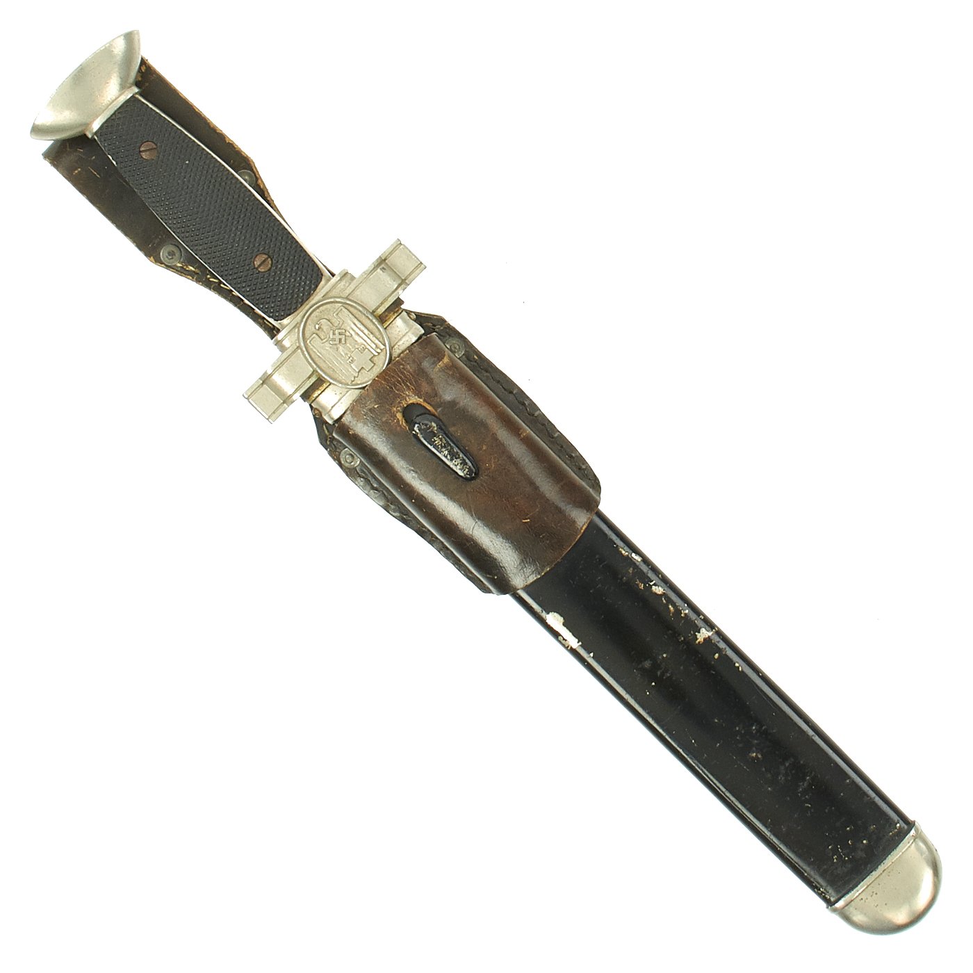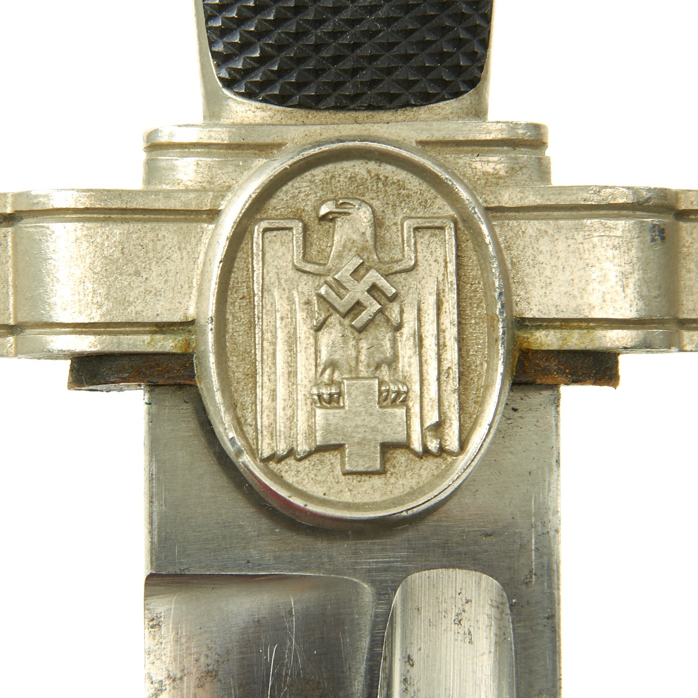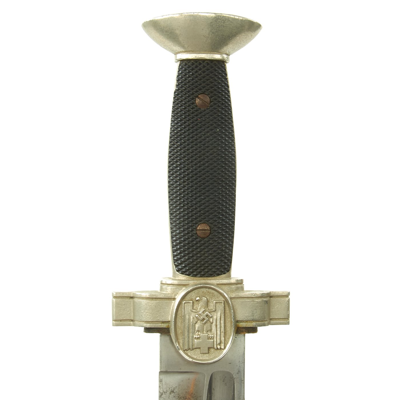 The crossguard features an oval boss on each side, with the obverse featuring an eagle with half-opened wings and a raised out mobile swas on his breast. The bird clutches a cross in his talons. The grip plates are bakelite, with the top plate being checkered, and the bottom plate being smooth. They are retained by the original screws and slotted bolts. The crossguard also still has the original leather buffer washer around the blade.