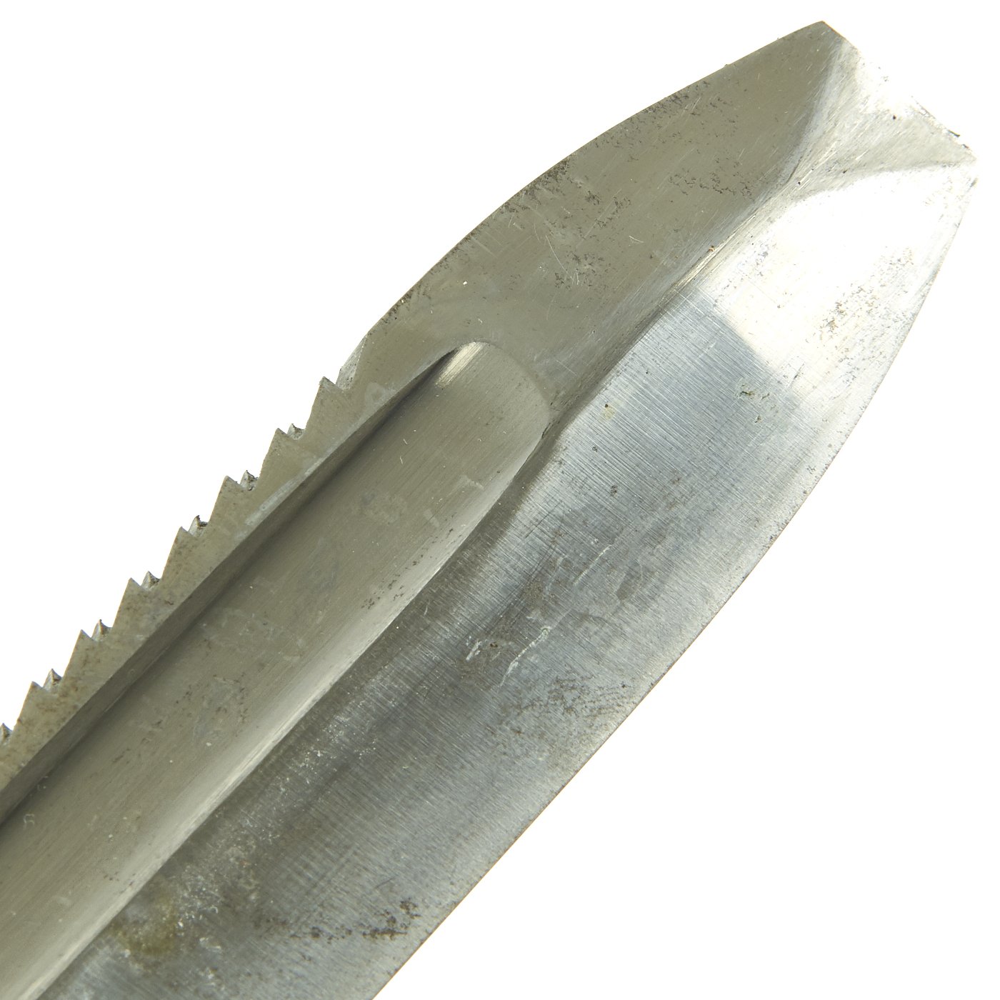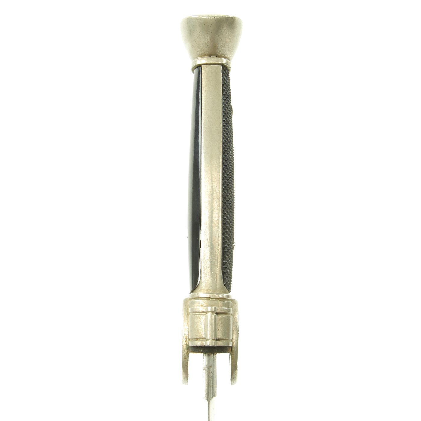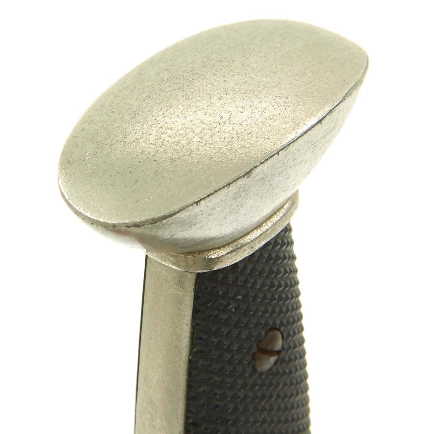 The hilt mounts have over 90% of the original nickel-plating still intact, with some overall speckling, but very little of the base metal alloy visible. This hewer does not seem to have been used much, as the wear to the plating is overall, and seems to be more from age than use.