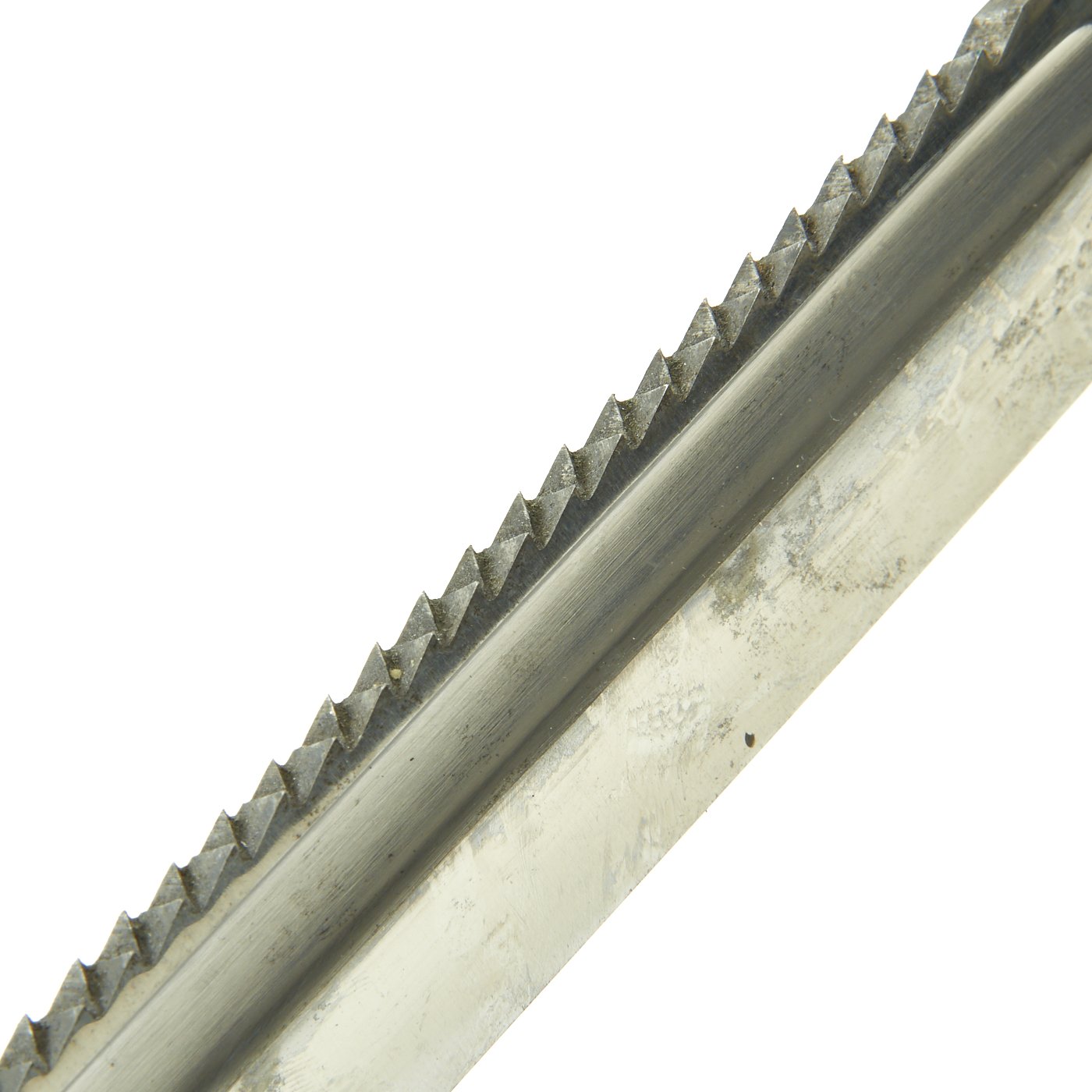 The blade of this hewer is the classic saw back type, and is really in great shape. It has just a bit of light staining, and a great factory crossgrain throughout. It has just a bit of runner wear, and was never sharpened on the edge, so it is blunt over all. Under the cross guard the blade is marked GES. / GESCHÜTZT, for Gesetzlich Geschutzt (Protected By Law), indicating that this knife was a trademarked design.