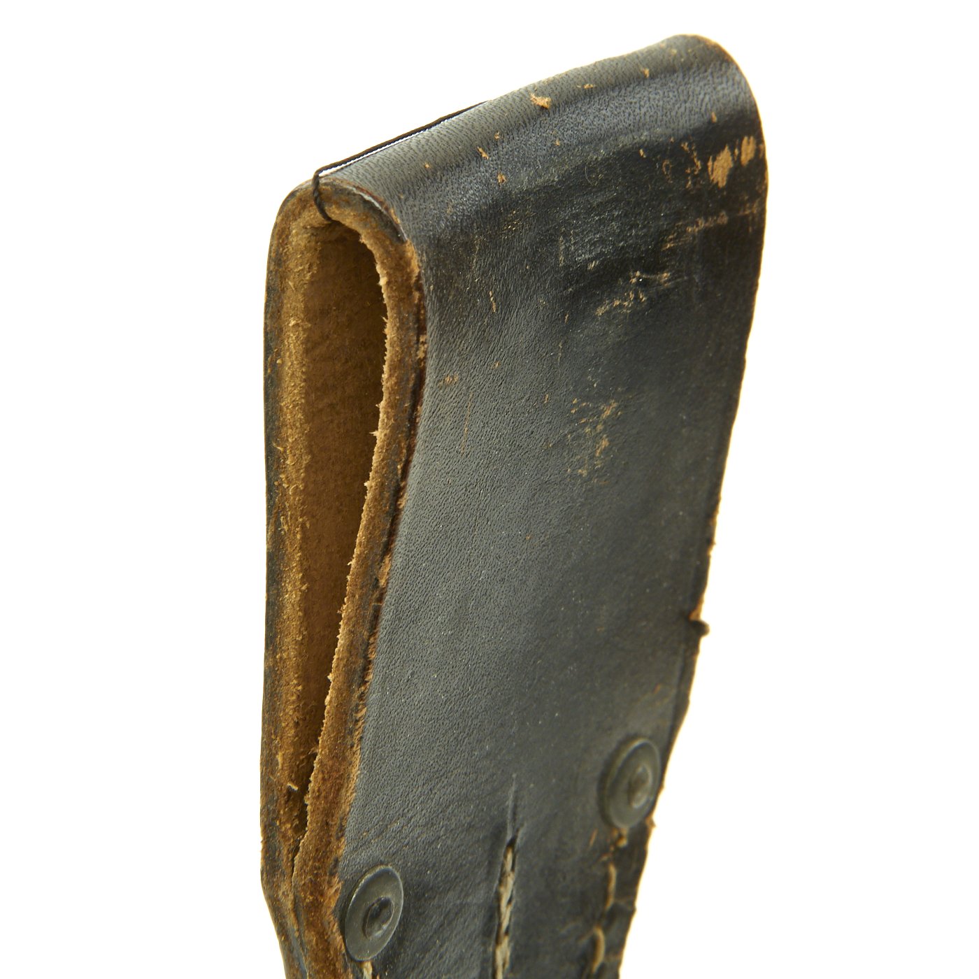 The included frog is in great shape, with fully intact white stitching, and intact galvanized steel rivets. The leather was original finished black, though it has worn a bit in places. The back of the flag has an oval maker marking, reading W. FR. BAUER / 1941 / OFFENBACH, which is mostly legible.