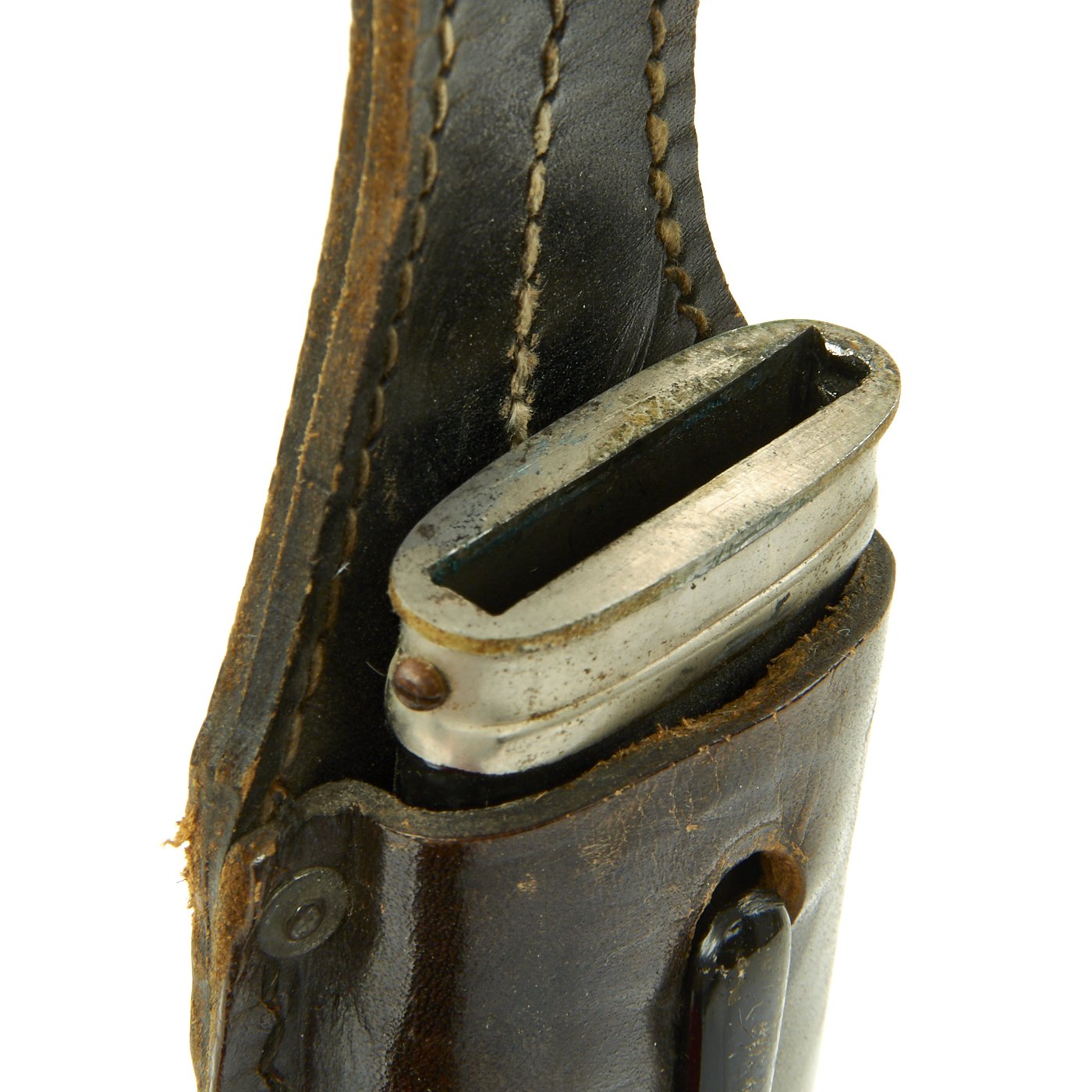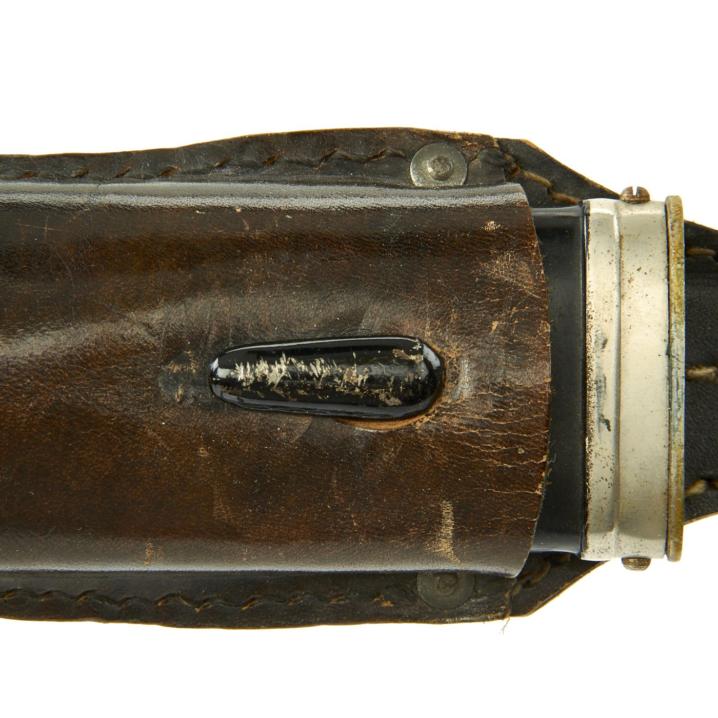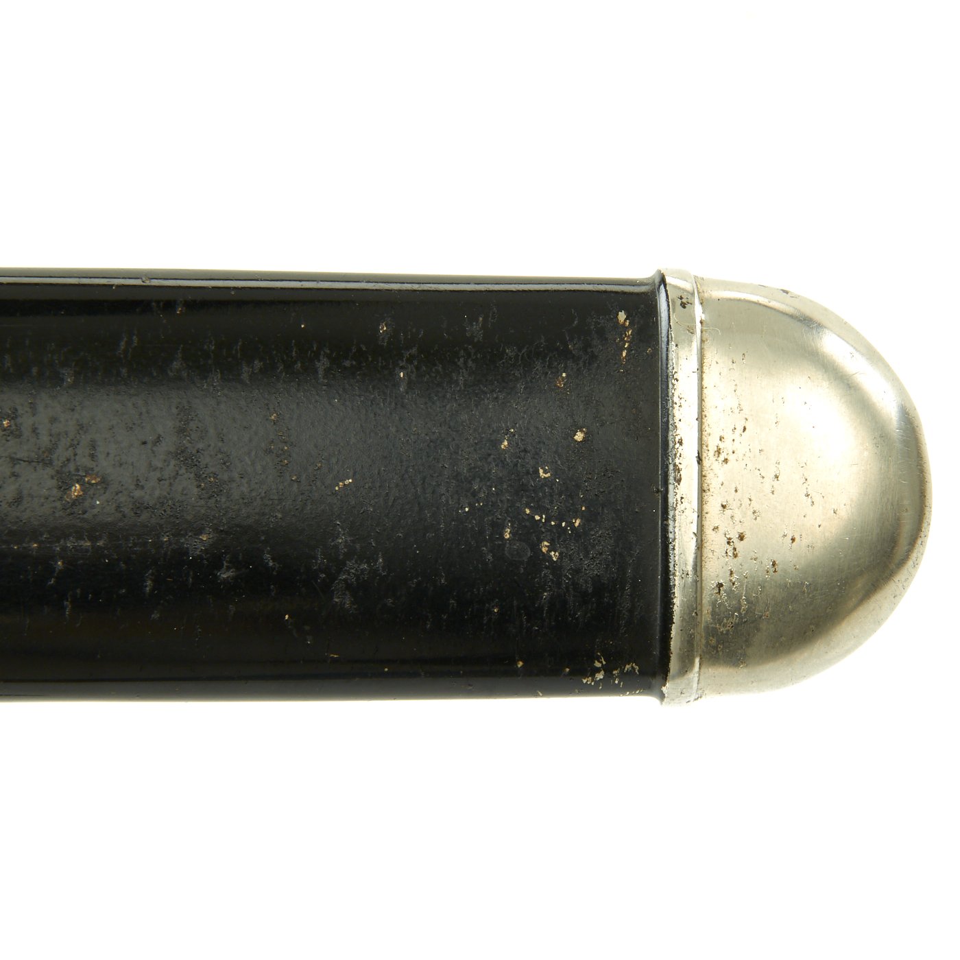 The scabbard is in very good condition, though it does show its age. It does not have dents we can see, but the enamel shows some crazing and checking due to age, with some flaking. The nickel plated steel fittings are still present, each retained by two screws. The plating is retained very well, with some overall speckling, but no major wear or oxidation of the base metal.