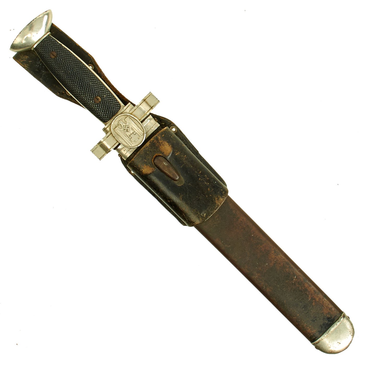 Original Item: Only One Available. This is an excellent example of the German Red Cross (DRK) Enlisted Man / Non-Commissioned Officer Hewer, complete with scabbard and 1941-dated leather frog. The hewer has a blunt tip, and edge, as it was intended for combat medics, who would make more use of the Sawback blade, which could be used to cut wood for splints. The heavy blade could be used for chopping, similar to the U.S. Hospital corps "bolo" knives of WWI.