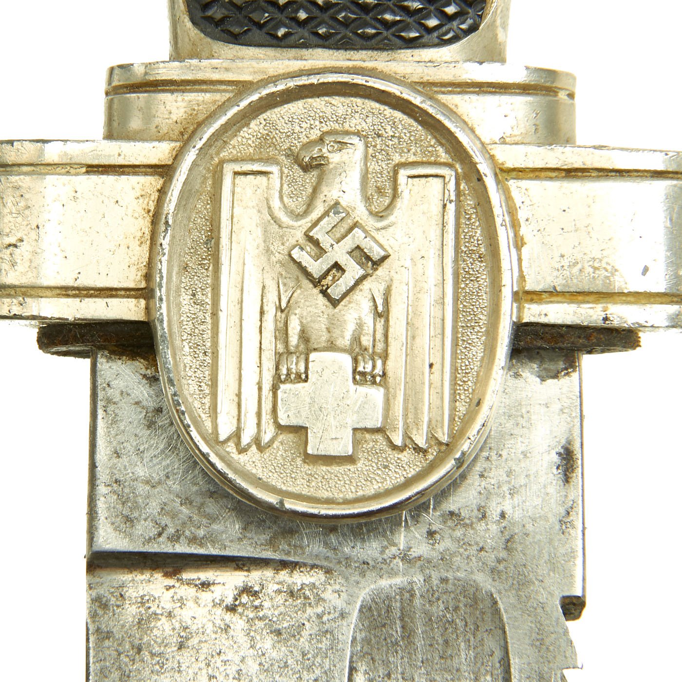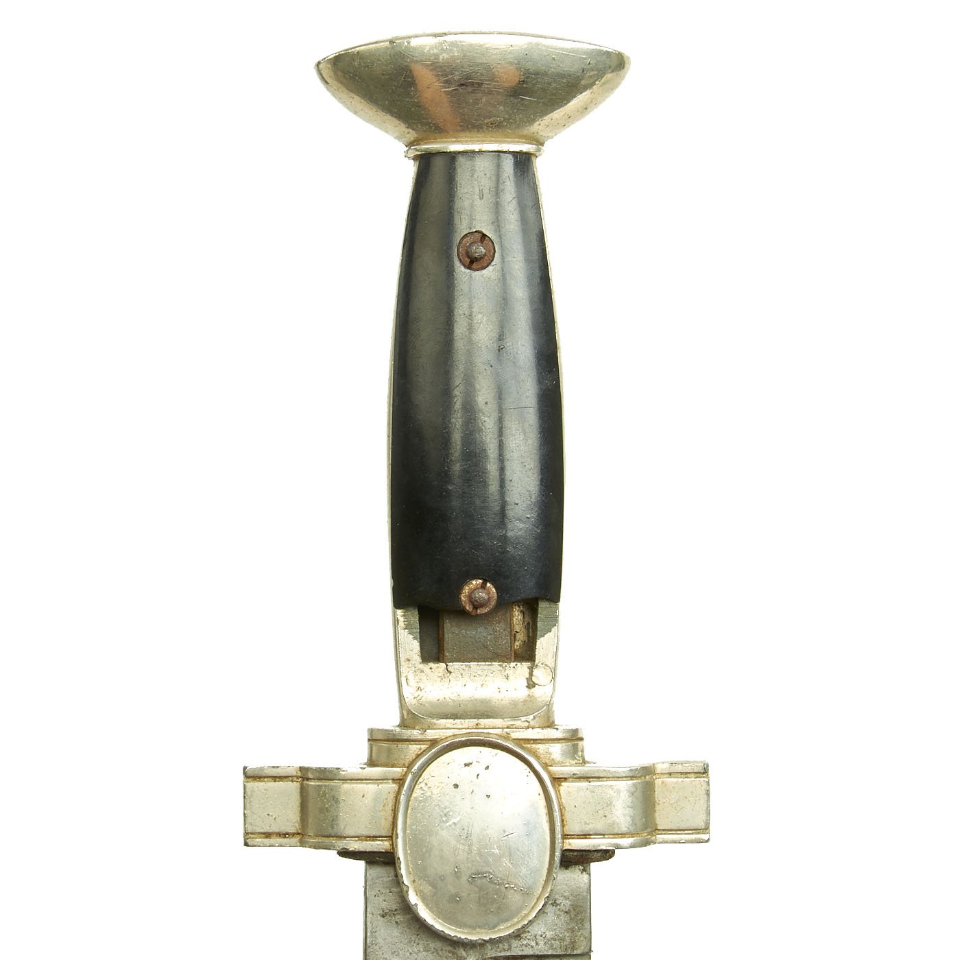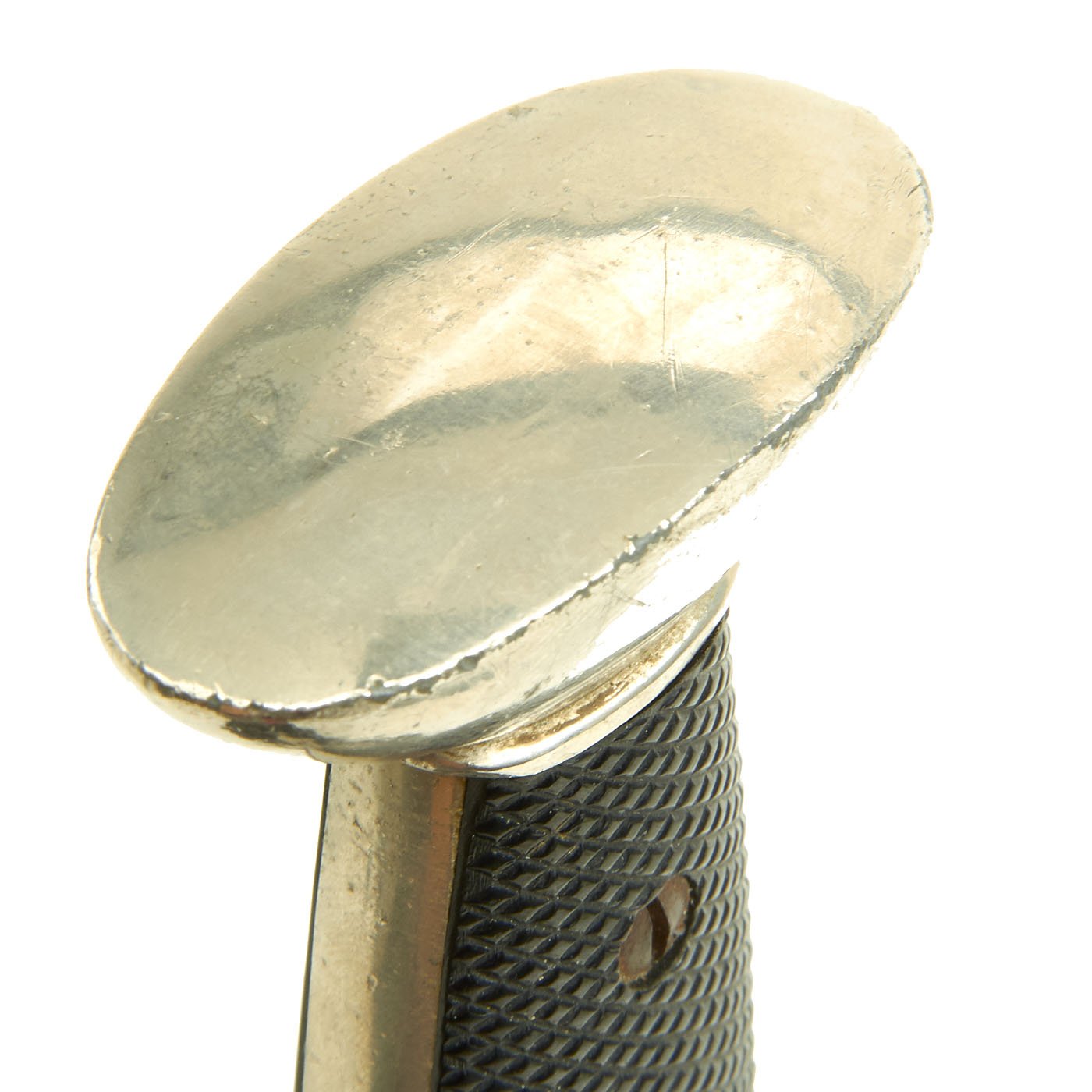 The crossguard features an oval boss on each side, with the obverse featuring an eagle with half-opened wings and a raised out mobile swas on his breast. The bird clutches a cross in his talons. The grip plates are bakelite, with the top plate being checkered, and the bottom plate being smooth. They are retained by the original screws and slotted bolts. The crossguard also still has the original leather buffer washer around the blade.