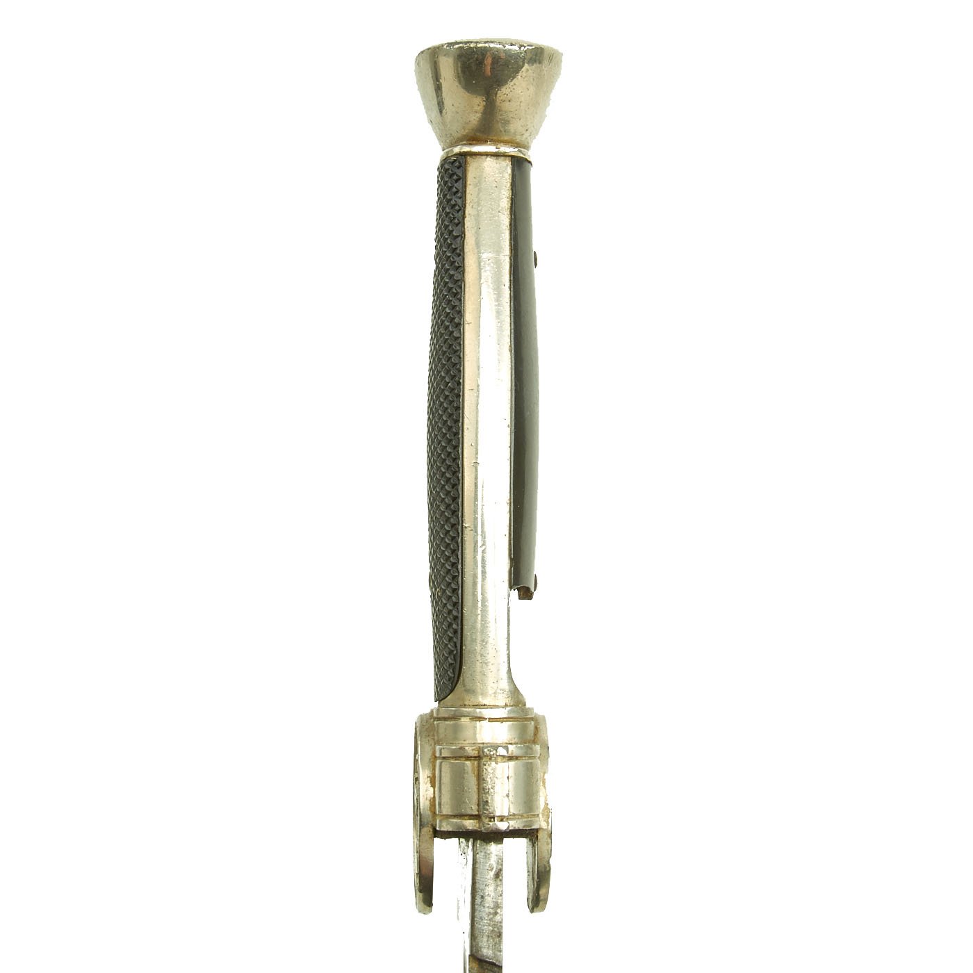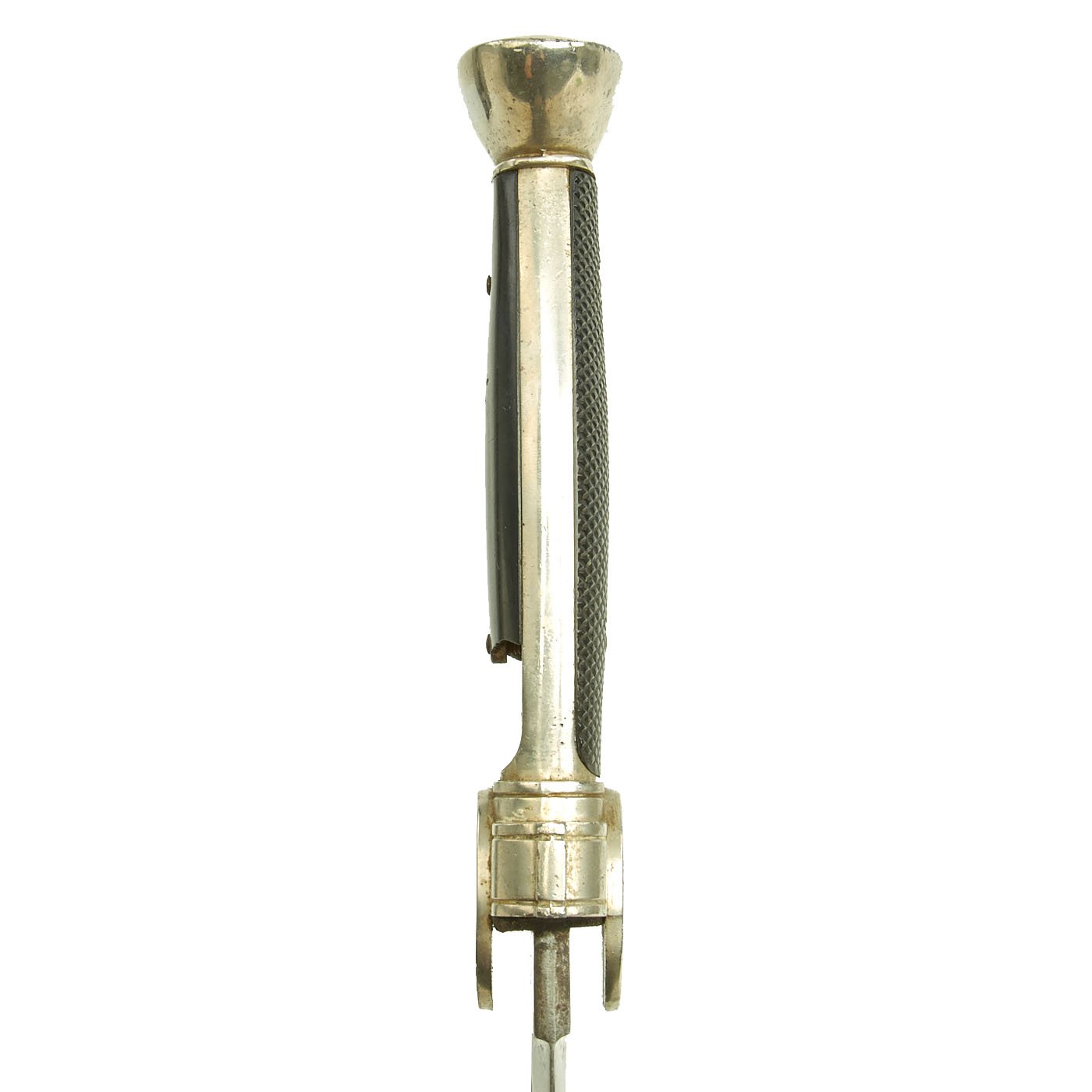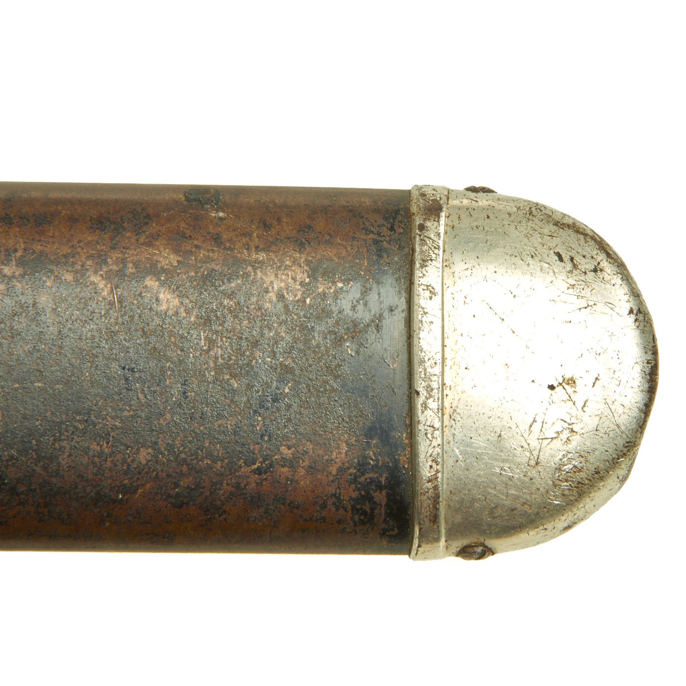 The scabbard is in good condition, though it does show its age. It does not have any dents we can see, but the enamel finish has mostly worn away, leaving a lovely oxidized steel patina. The nickel plated steel fittings are still present, each retained by two screws. The plating is retained very well, with some overall speckling, but no major wear or oxidation of the base metal. The chape does have some dents into the bottom.