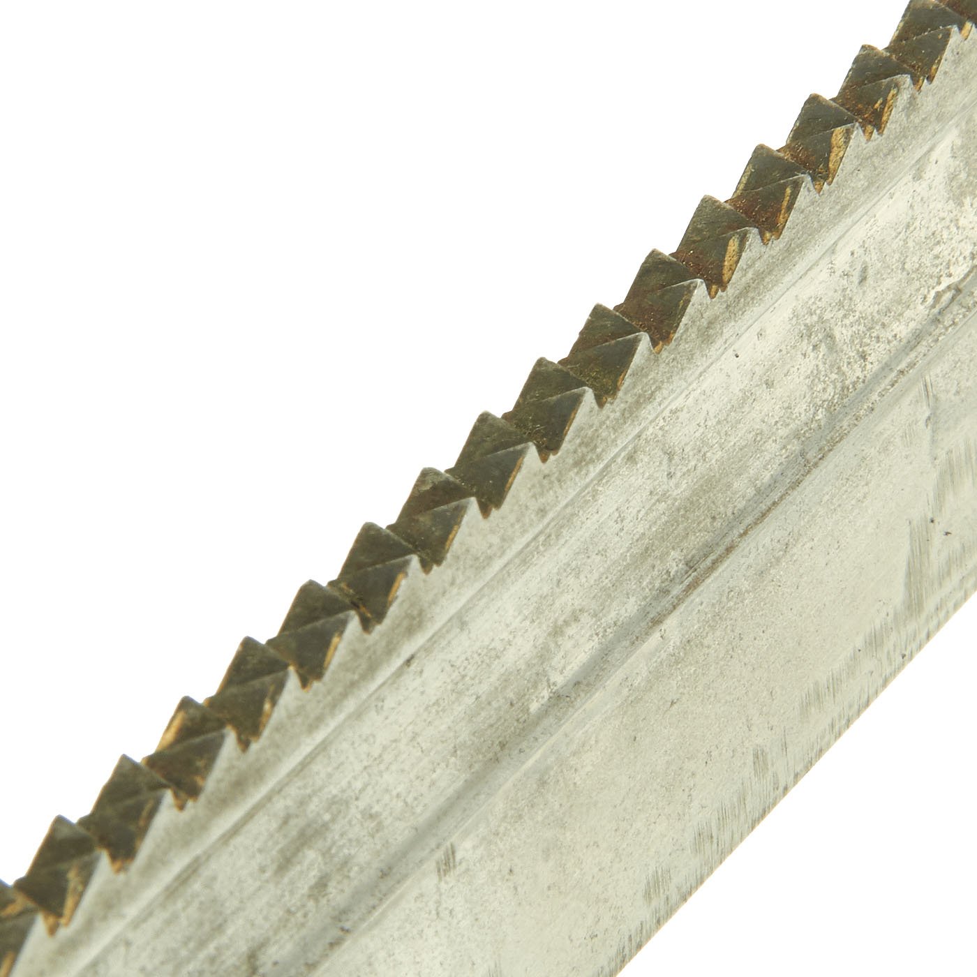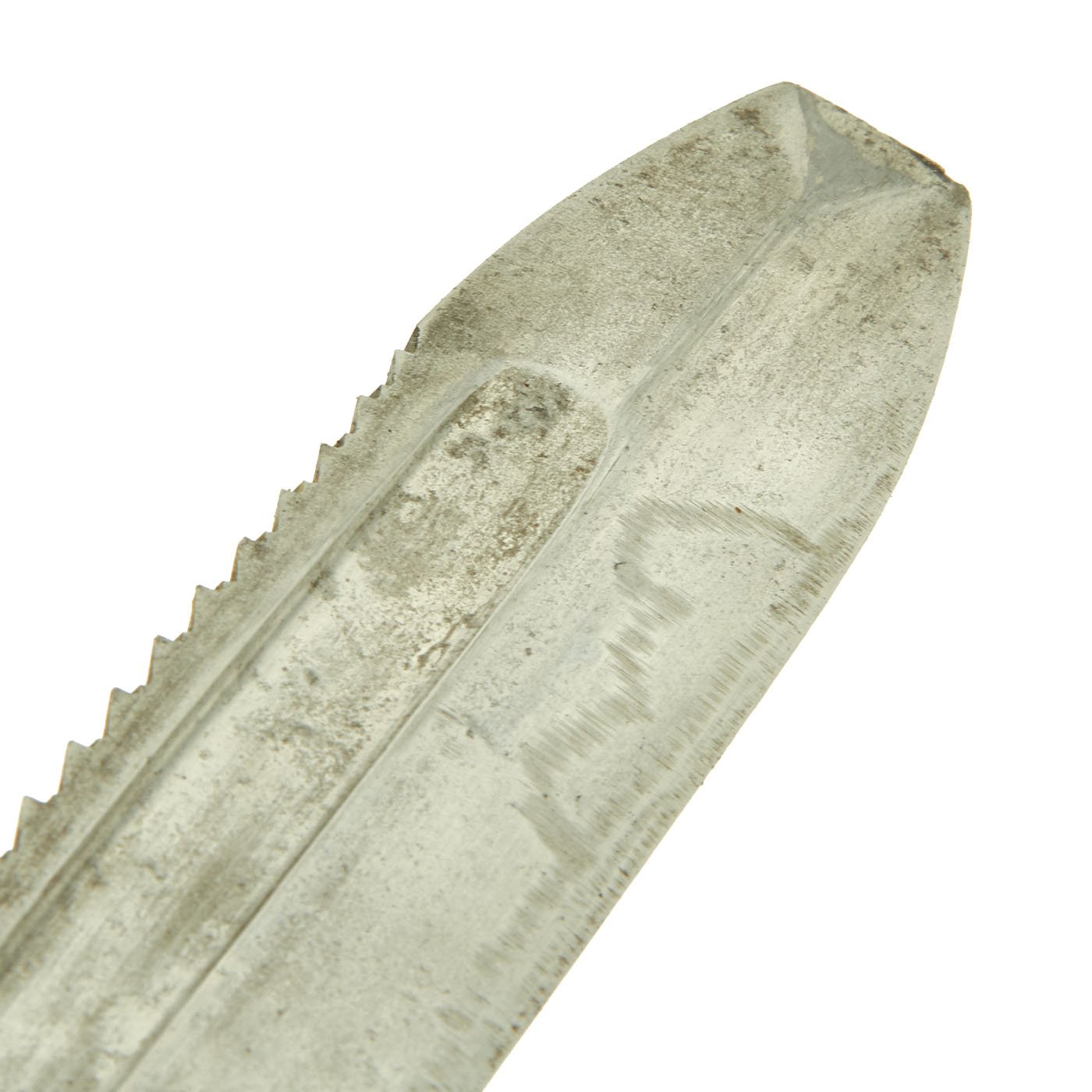 The blade of this hewer is the classic saw back type, and is in good condition. It does show use as well as staining, and it looks like some attempt was made to sharpen the main edge, but these were abandoned. The factory cross grain is no longer visible. Under the cross guard the blade is marked GES. / GESCHÜTZT, for Gesetzlich Geschutzt (Protected By Law), indicating that this knife was a trademarked design.
