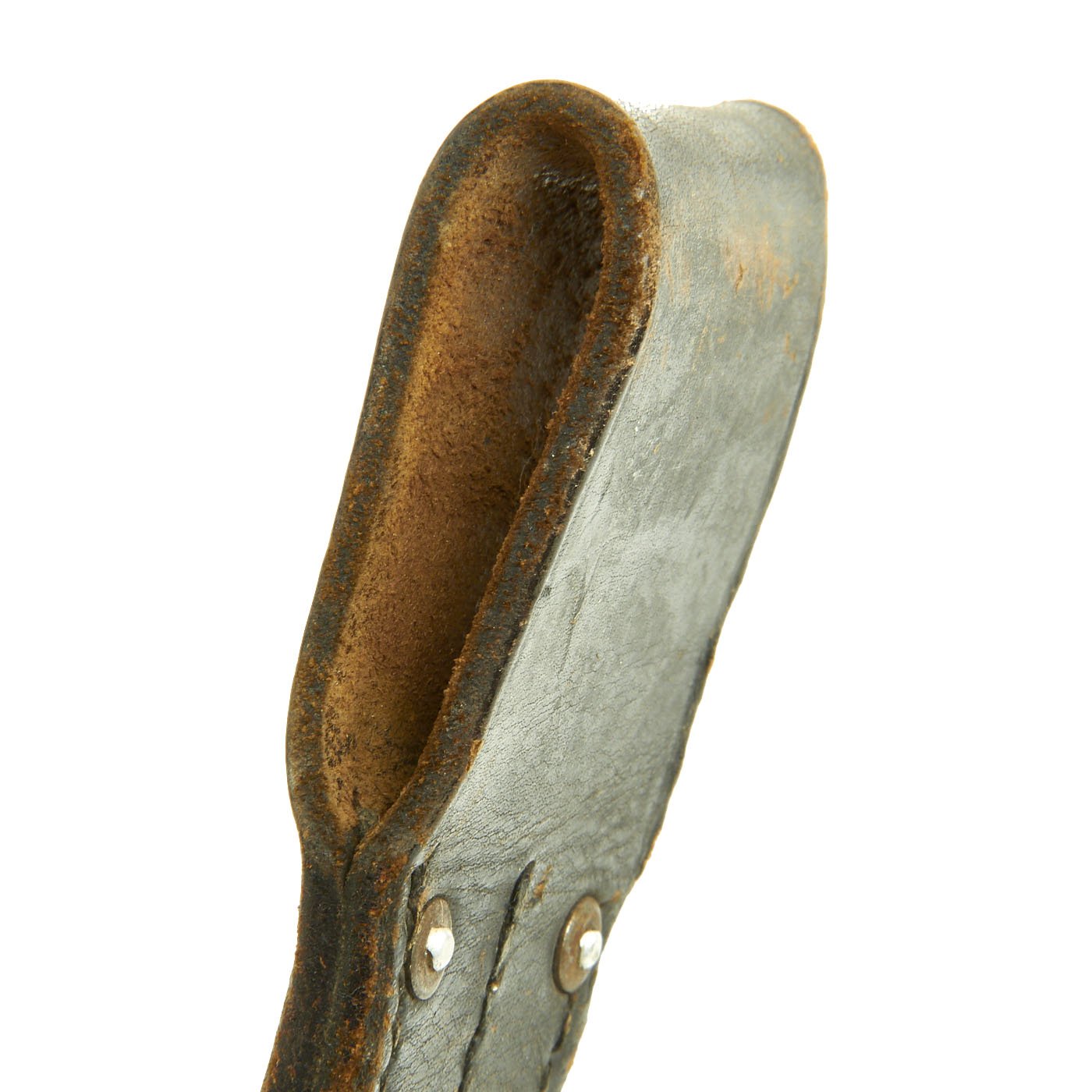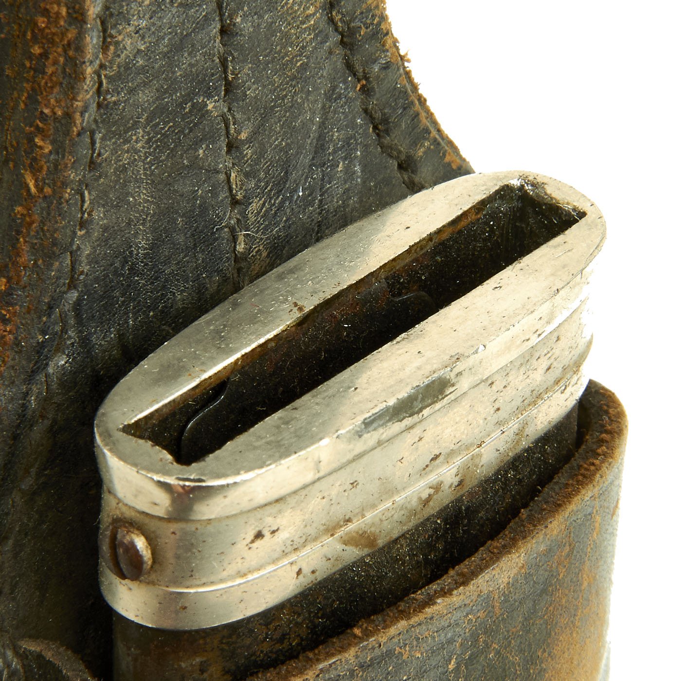 The included frog is in great shape, with fully intact stitching, and intact aluminum and galvanized steel rivets. The leather was original finished black, though it has worn a bit in places. The back of the frog has a marking, reading CARL BUSSE / MAINZ / 1940, which is fully legible.