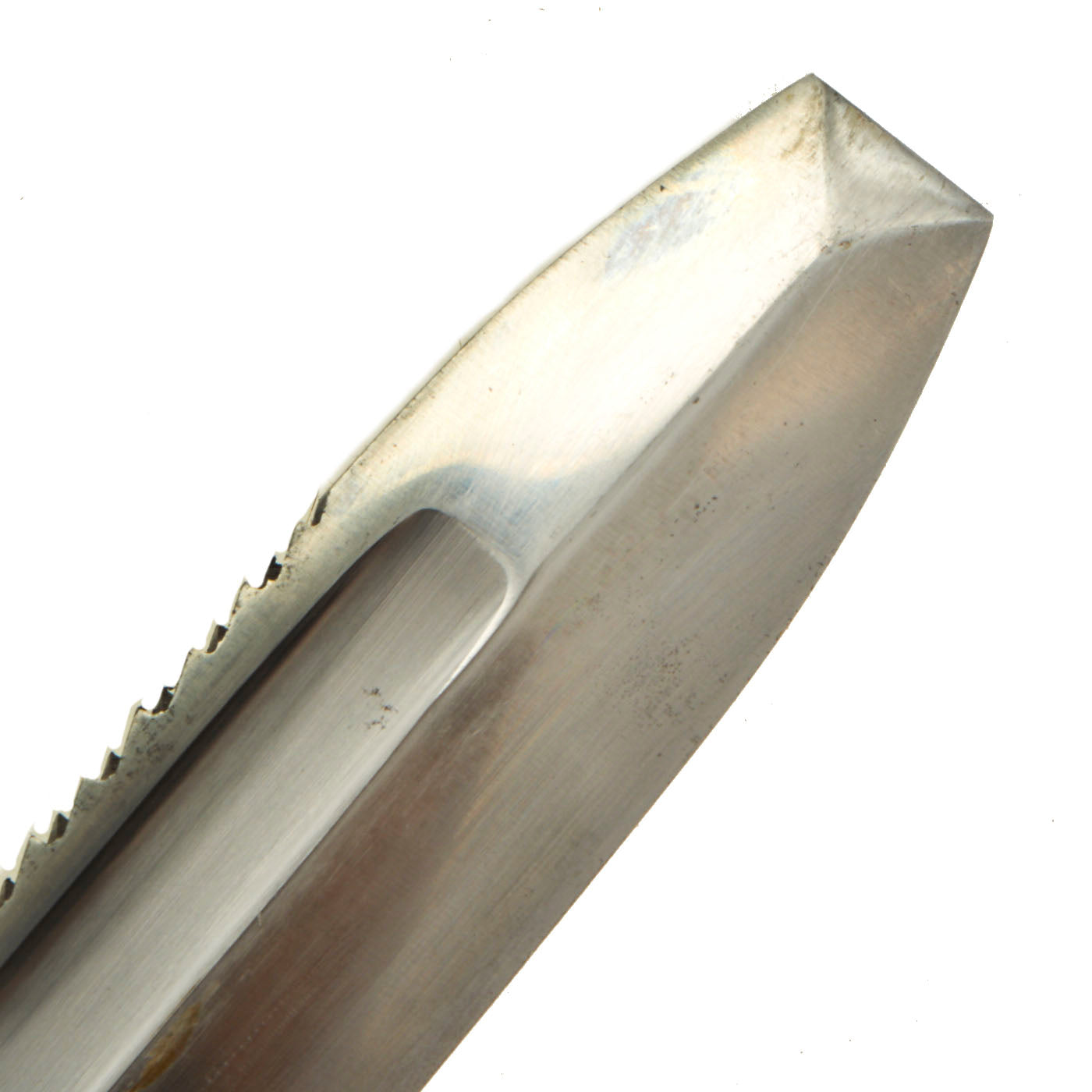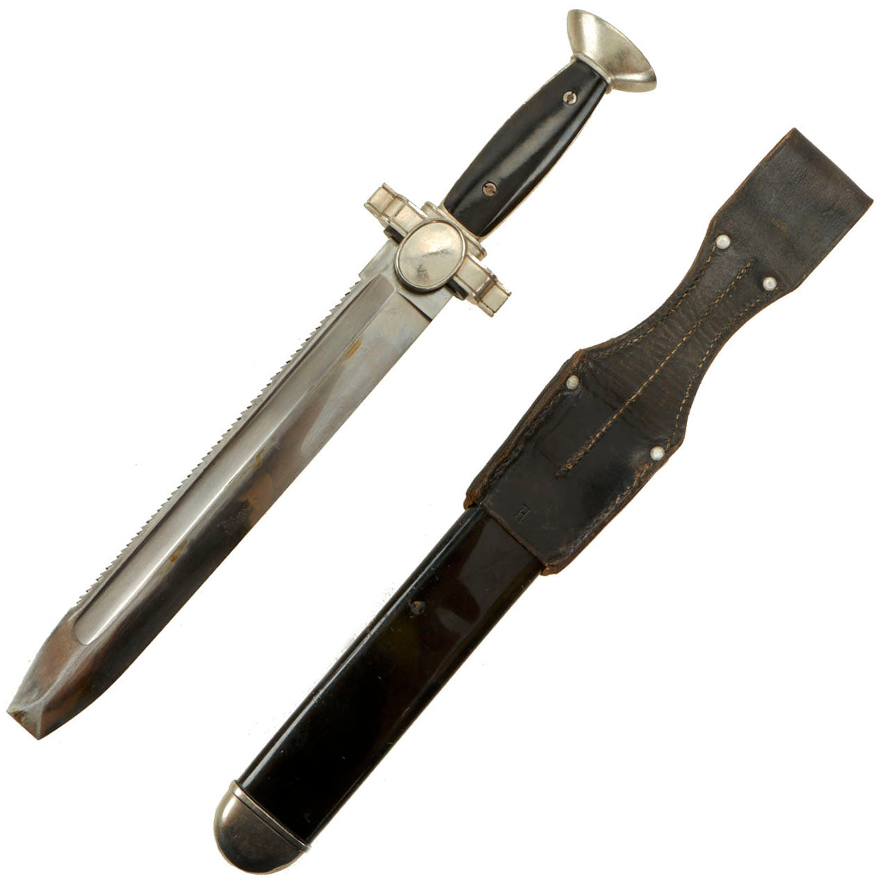 Original Item: Only One Available. This is an excellent example of the German Red Cross (DRK) Enlisted Man / Non-Commissioned Officer Hewer, complete with its original scabbard. The hewer has a blunt tip, and edge, as it was intended for combat medics, who would make more use of the Sawback blade, which could be used to cut wood for splints. The heavy blade could be used for chopping, similar to the U.S. Hospital corps "bolo" knives of WWI.