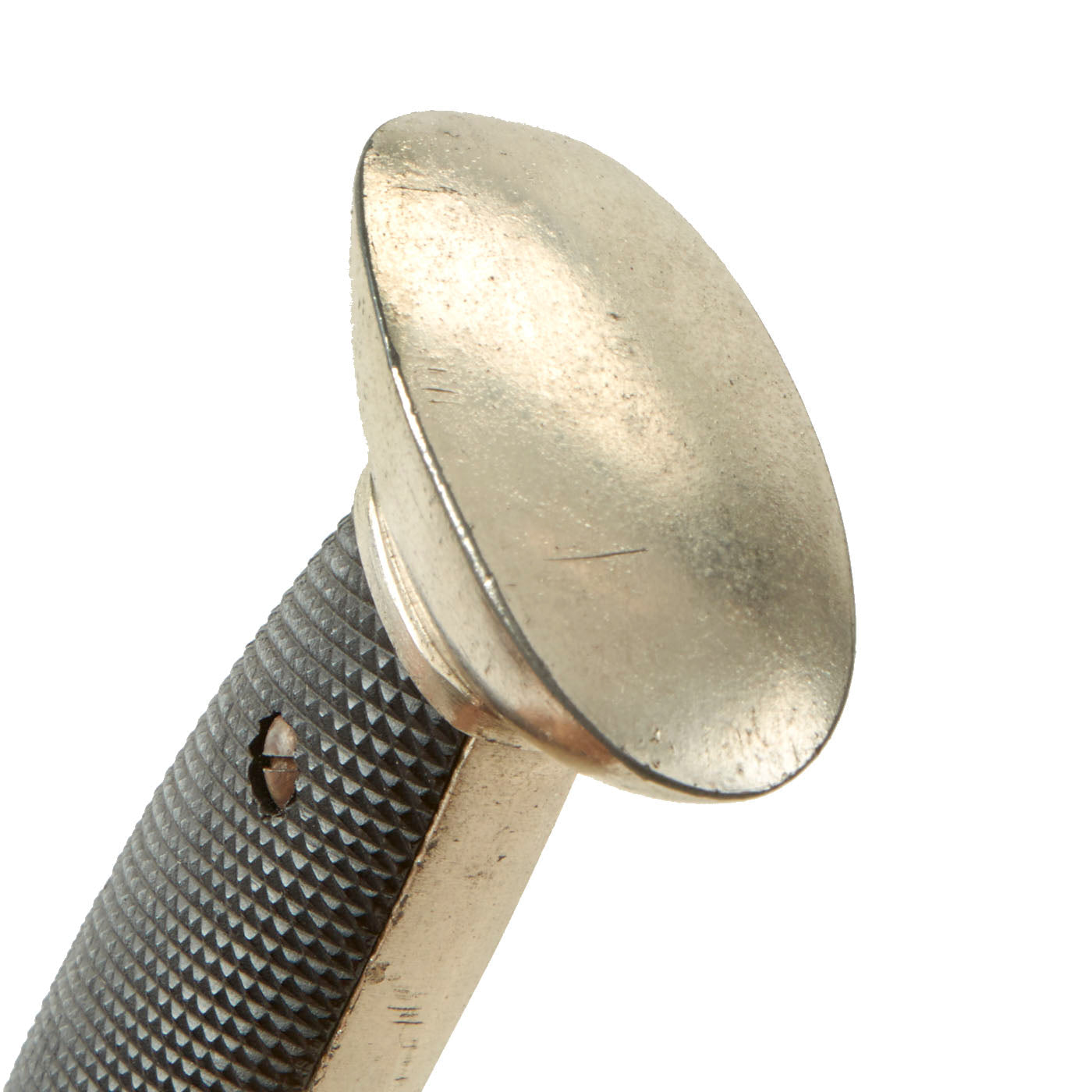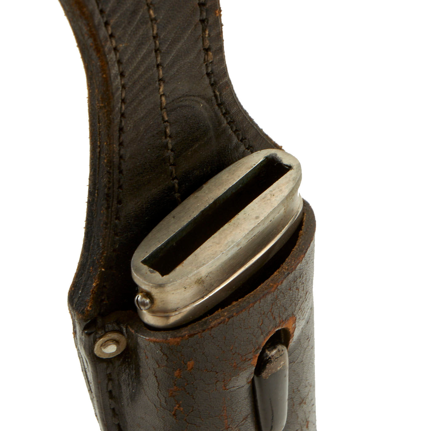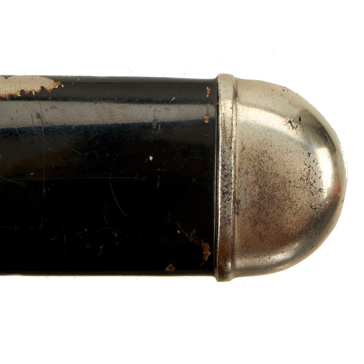 The scabbard is in very good condition, showing just a bit of age and finish loss. It just has a few minor dents, as well as the usual checking and crazing in the enamel due to age. Some flaking has occurred on on the rear side of the body. The nickel plated steel fittings are still present, with the throat retained by two screws. The plating is retained very well, with only light speckling and oxidation on the chape. The included black leather frog is in very good condition, with the stitching and aluminum rivets all intact. There is some wear to the black finish due to age and use, as is typical.
