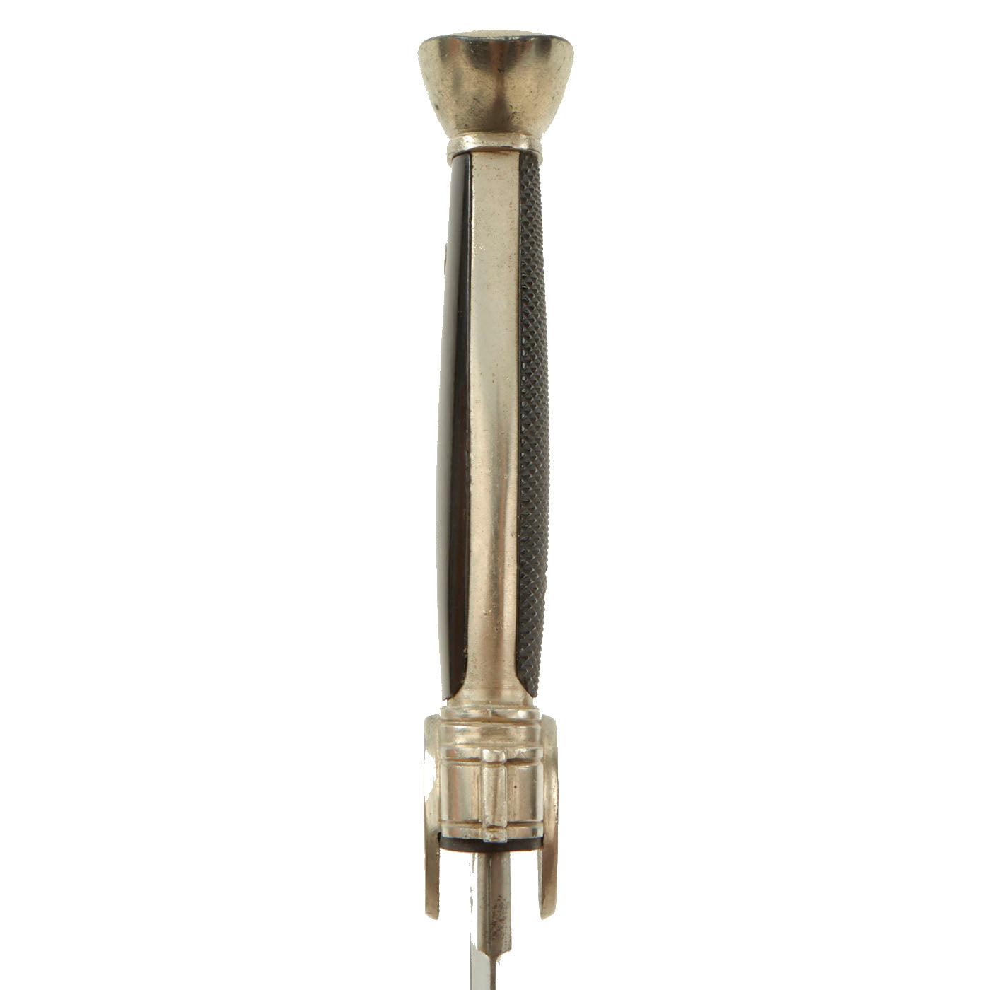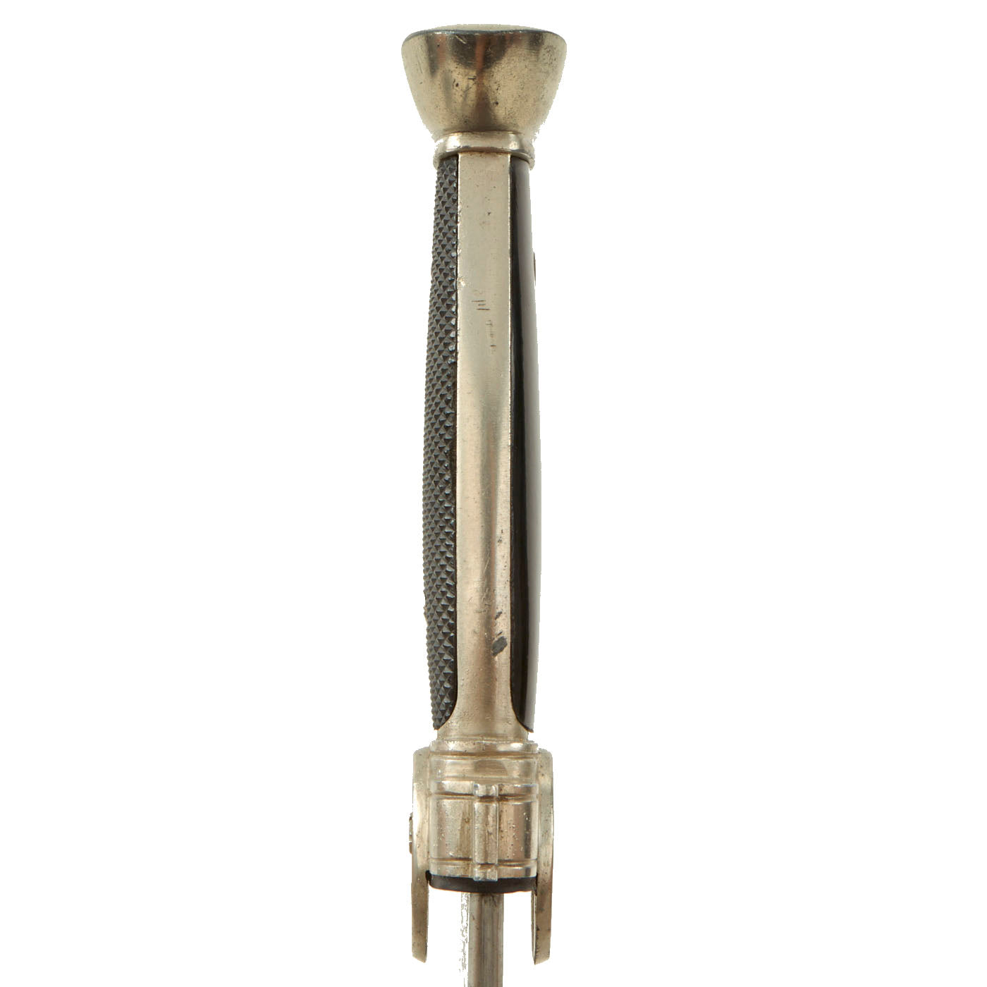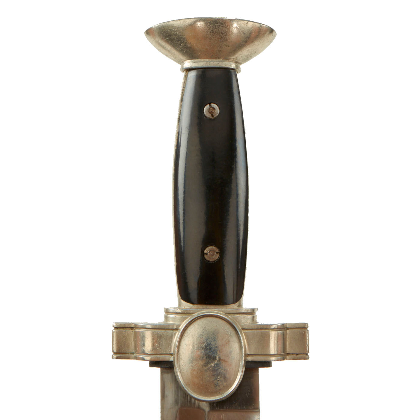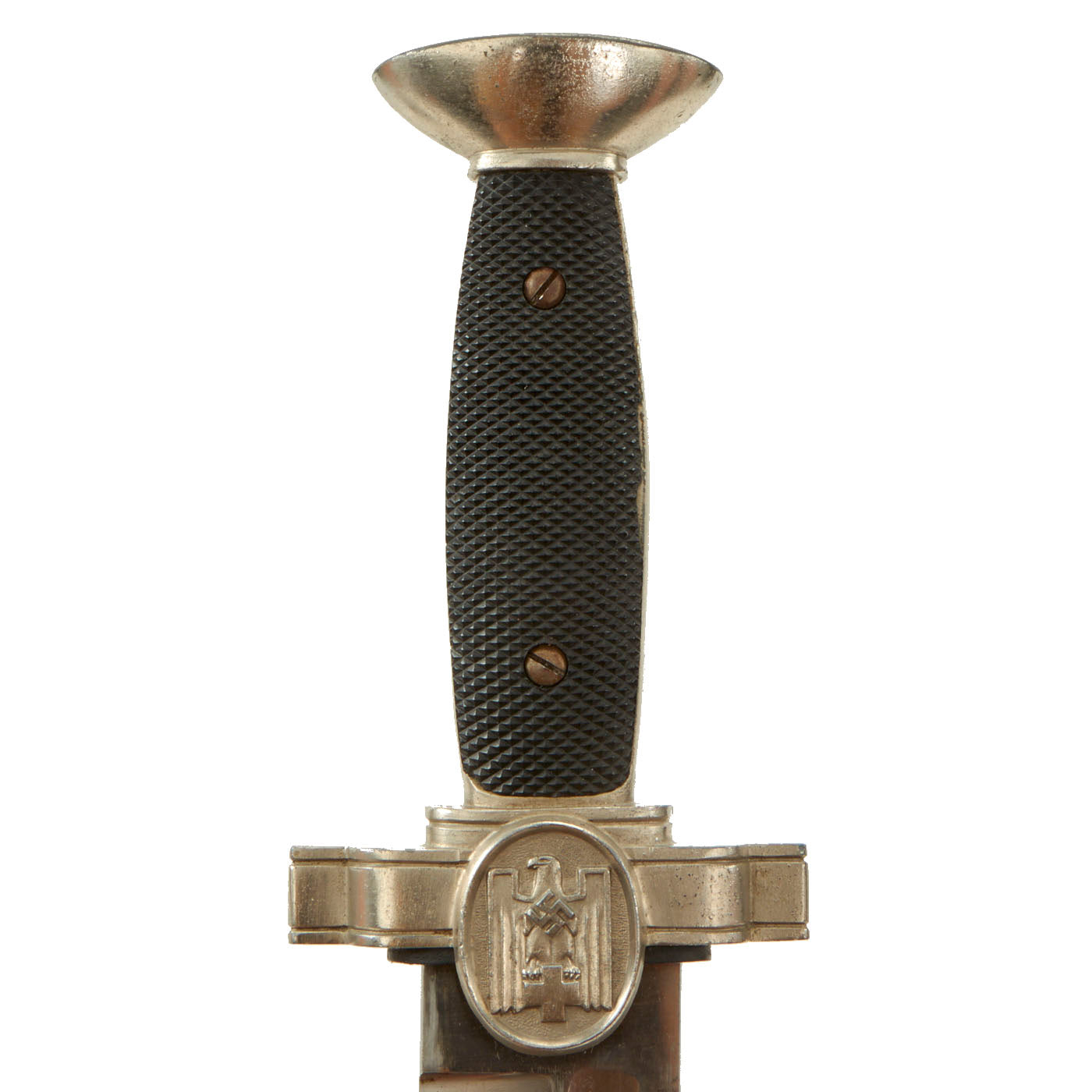 The crossguard features an oval boss on each side, with the obverse featuring an eagle with half-opened wings and a raised out mobile Swas (hook cross) on his breast. The bird clutches a "Geneva cross" in his talons. The grip plates are bakelite, with the top plate being checkered, and the bottom plate being smooth. They are retained by the original screws and slotted bolts. The crossguard still has the original leather buffer washer around the blade.