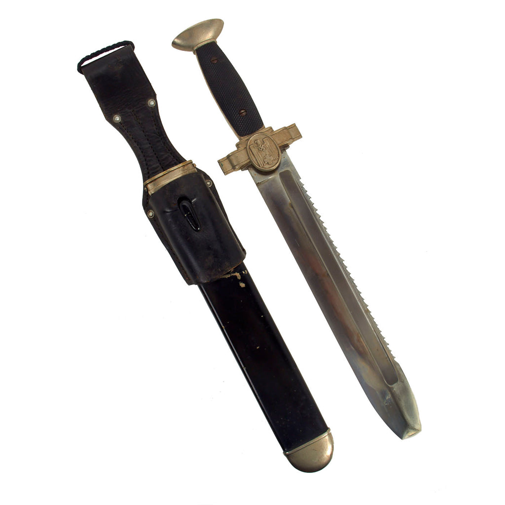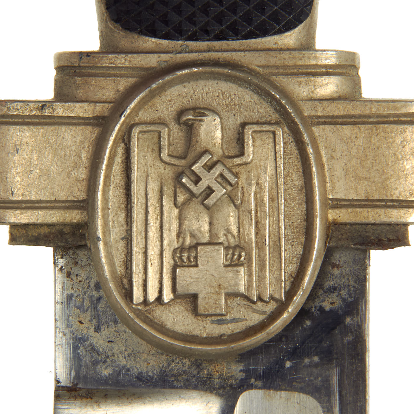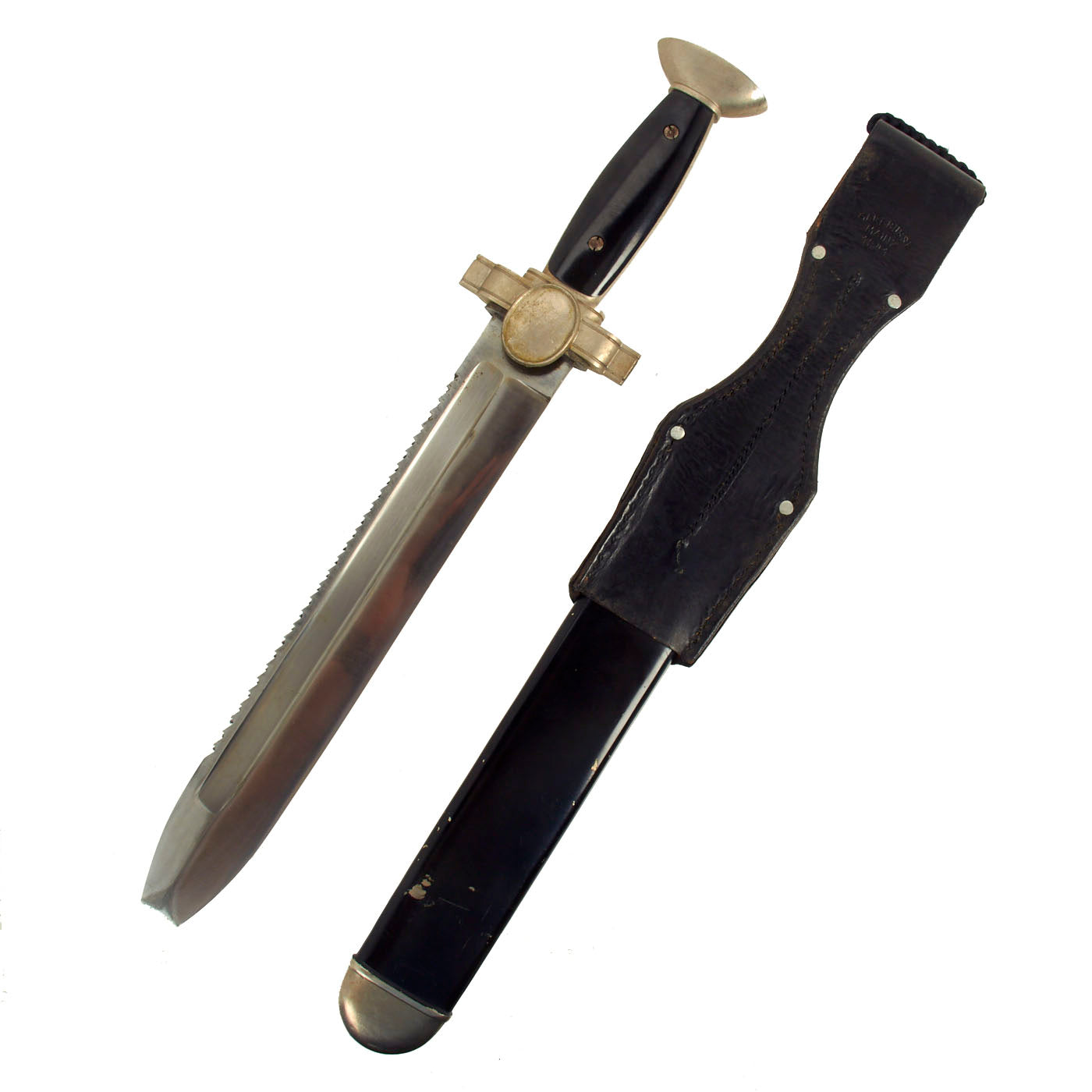 Original Item: Only One Available. This is an excellent example of the German Red Cross (DRK) Enlisted Man / Non-Commissioned Officer Hewer, complete with scabbard and 1941-dated leather frog. The hewer has a blunt tip, and edge, as it was intended for combat medics, who would make more use of the Sawback blade, which could be used to cut wood for splints. The heavy blade could be used for chopping, similar to the U.S. Hospital corps "bolo" knives of WWI.
