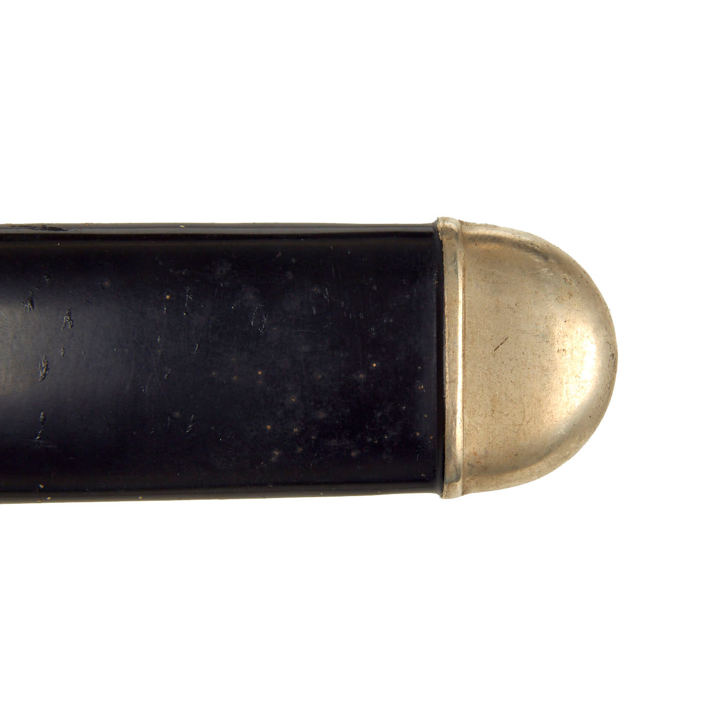 The scabbard is in very good condition, with no dents to the body that we can see, and the original black enamel finish retained at almost 100% It has a lovely pattern of checking and crazing in the finish, showing that it is original, and has not been refinished. The nickel plated steel fittings are still present, each retained by two screws. The plating is retained very well, with some overall speckling, and a few small areas of plating loss and oxidation on the chape.