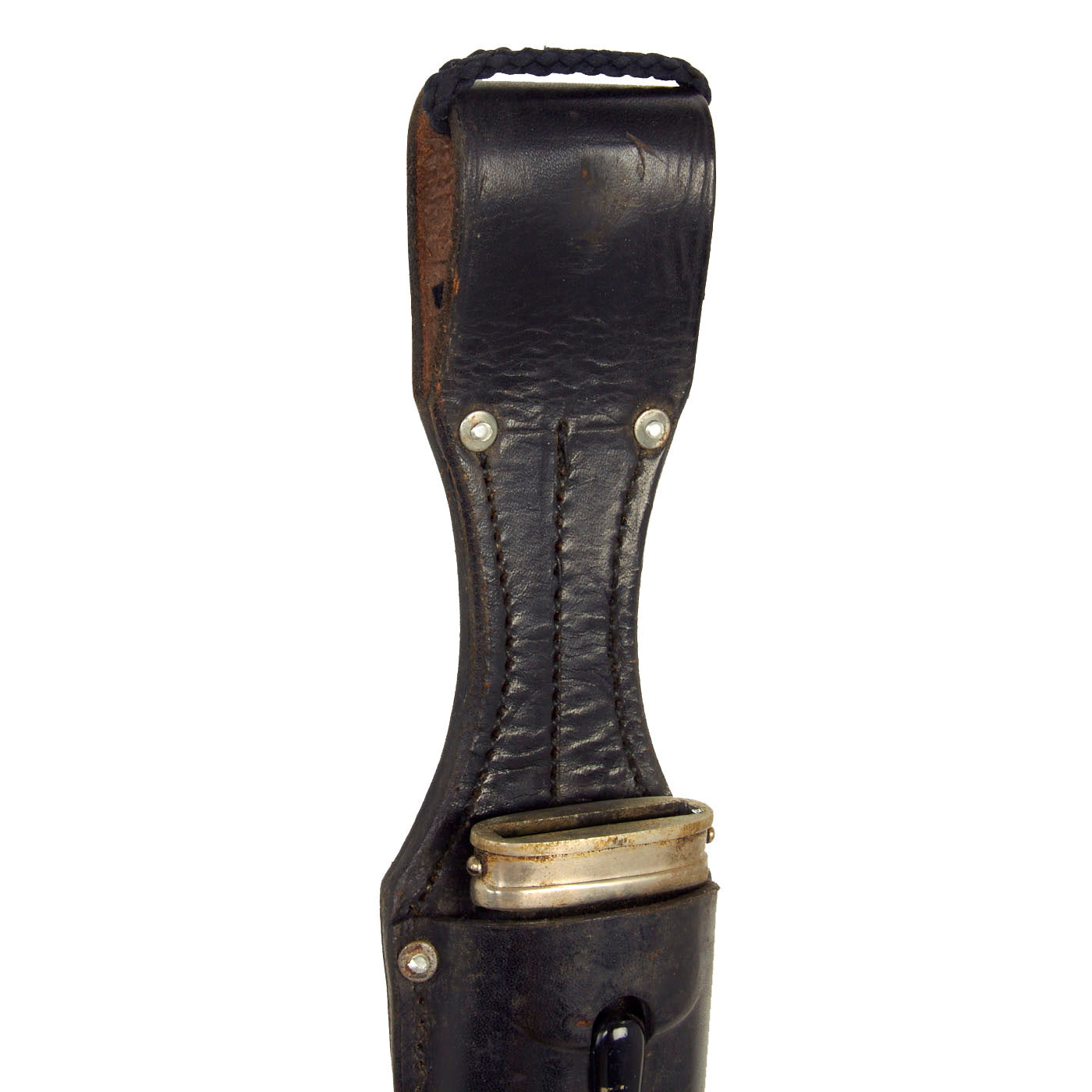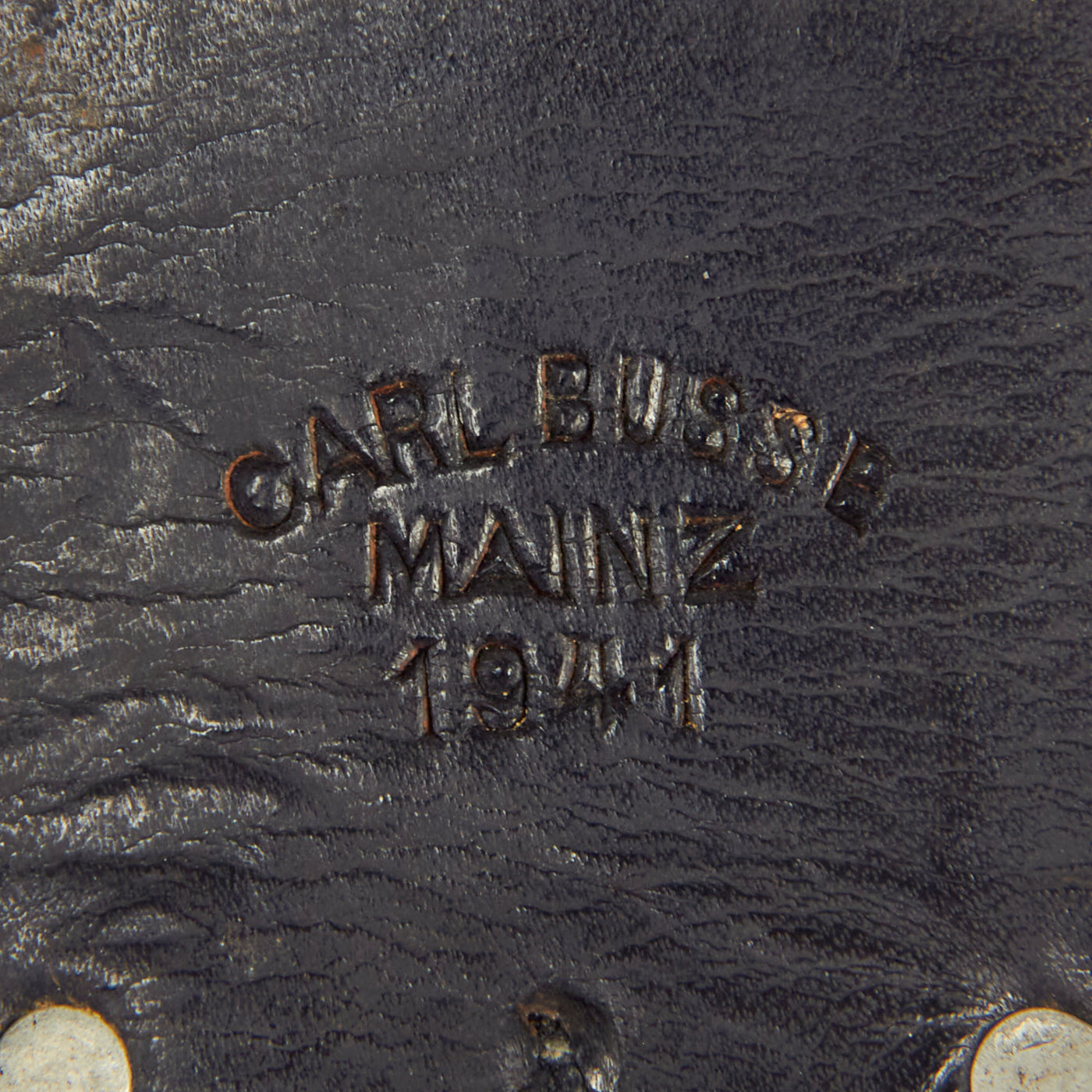 The included frog is in great shape, with fully intact stitching, and intact galvanized steel rivets. The leather still has much of the gloss black finish, with little sign of wear, and no tearing or major damage. It is even maker marked and dated on the back: CARL BUSSE / MAINZ / 1941.