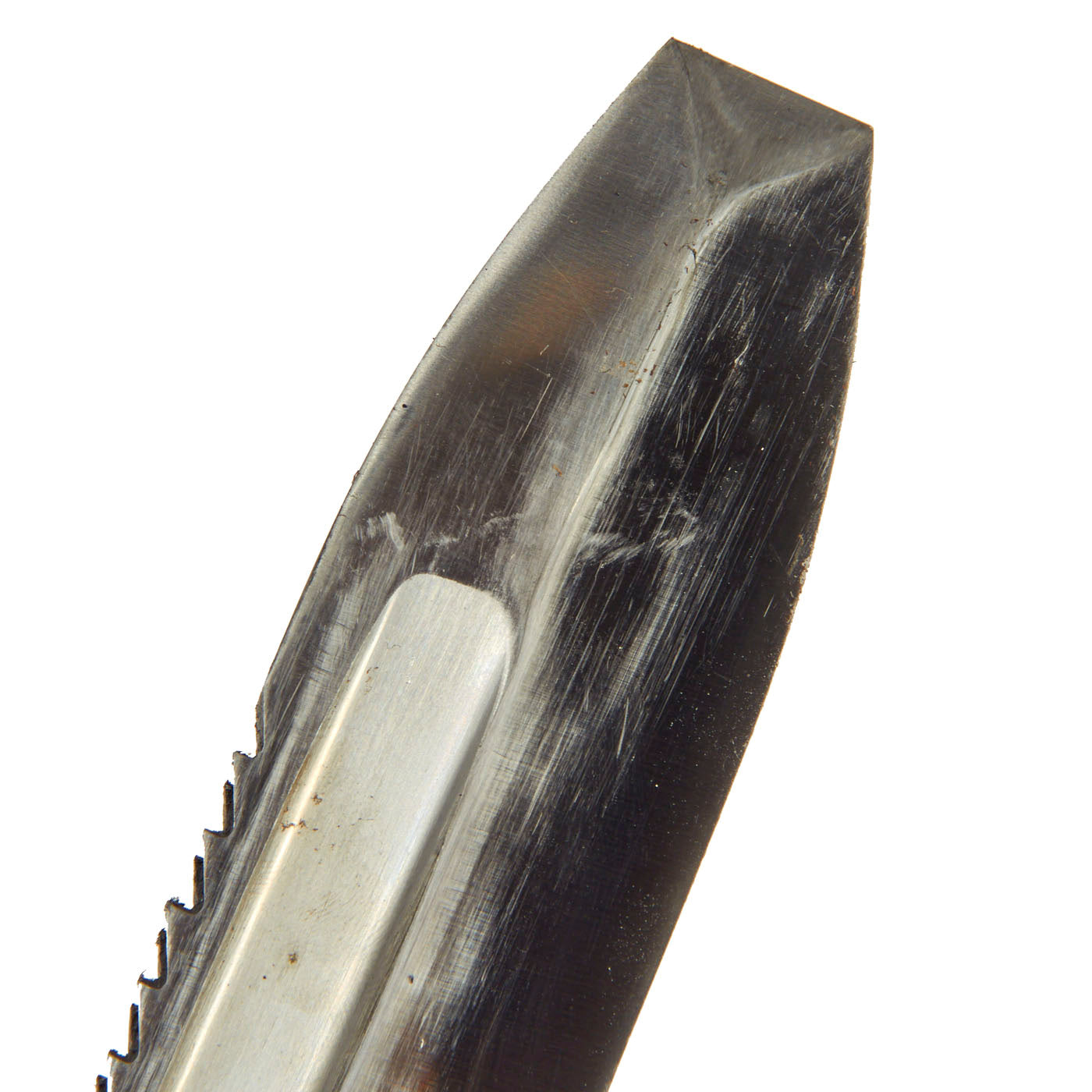 The blade of this hewer is the classic saw back type, and is in excellent condition, showing little to no sign of use. There are just a few areas of light staining, as well as runner wear on the center spine of the blade. There is still almost all of the original factory final grind cross grain on both sides. This texture is iconic, and is the definitive identifying characteristic for a real WWII German Blade. Under the cross guard the blade is marked GES. / GESCHÜTZT, for Gesetzlich Geschutzt (Protected By Law), indicating that this knife was a trademarked design.
