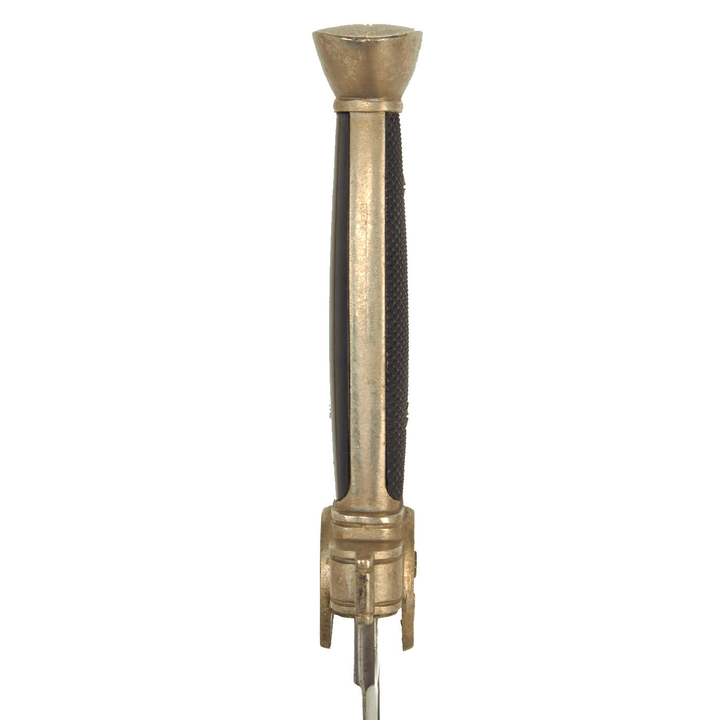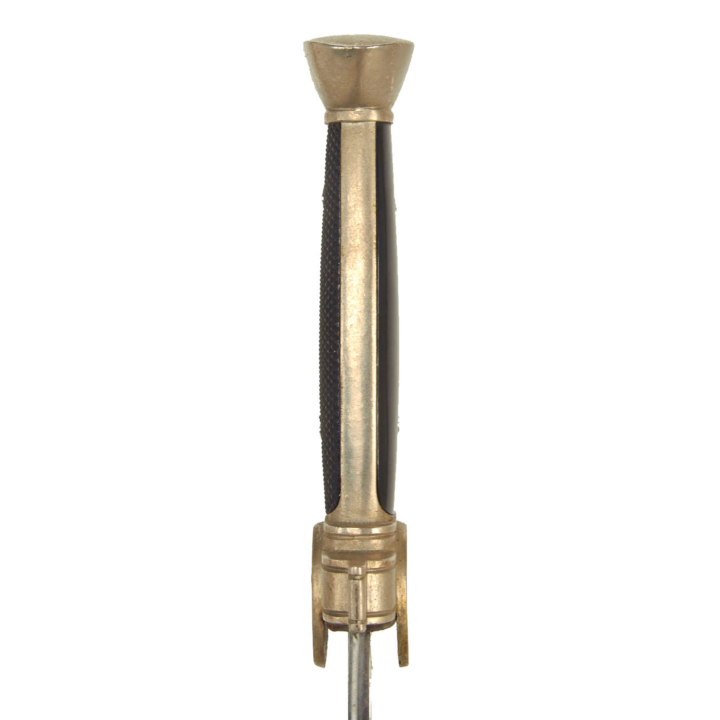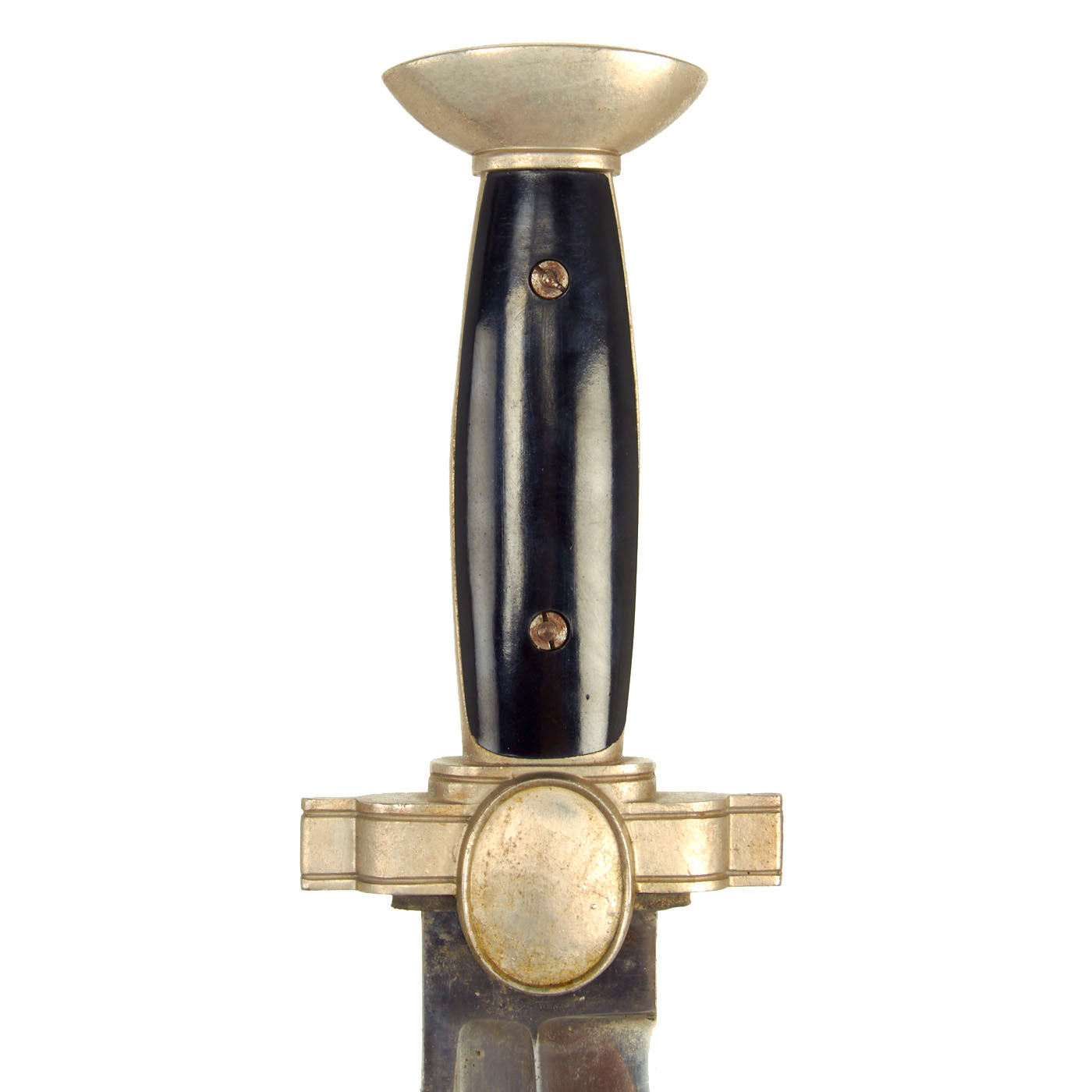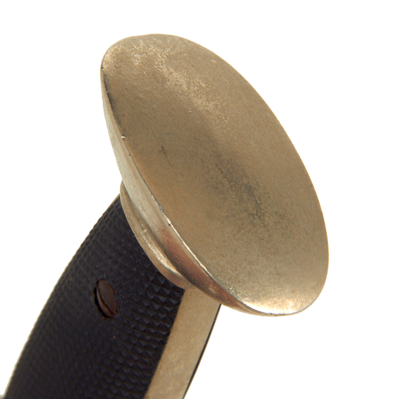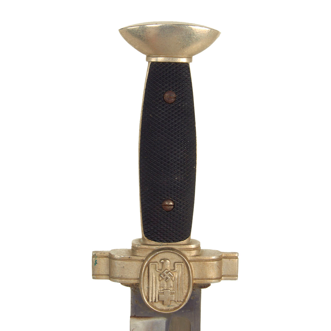 The crossguard features an oval boss on each side, with the obverse featuring an eagle with half-opened wings and a raised out mobile swas on his breast. The bird clutches a cross in his talons. The grip plates are bakelite, with the top plate being checkered, and the bottom plate being smooth. They are retained by the galvanized steel original screws and slotted bolts. The crossguard also still has the original leather buffer washer around the blade.