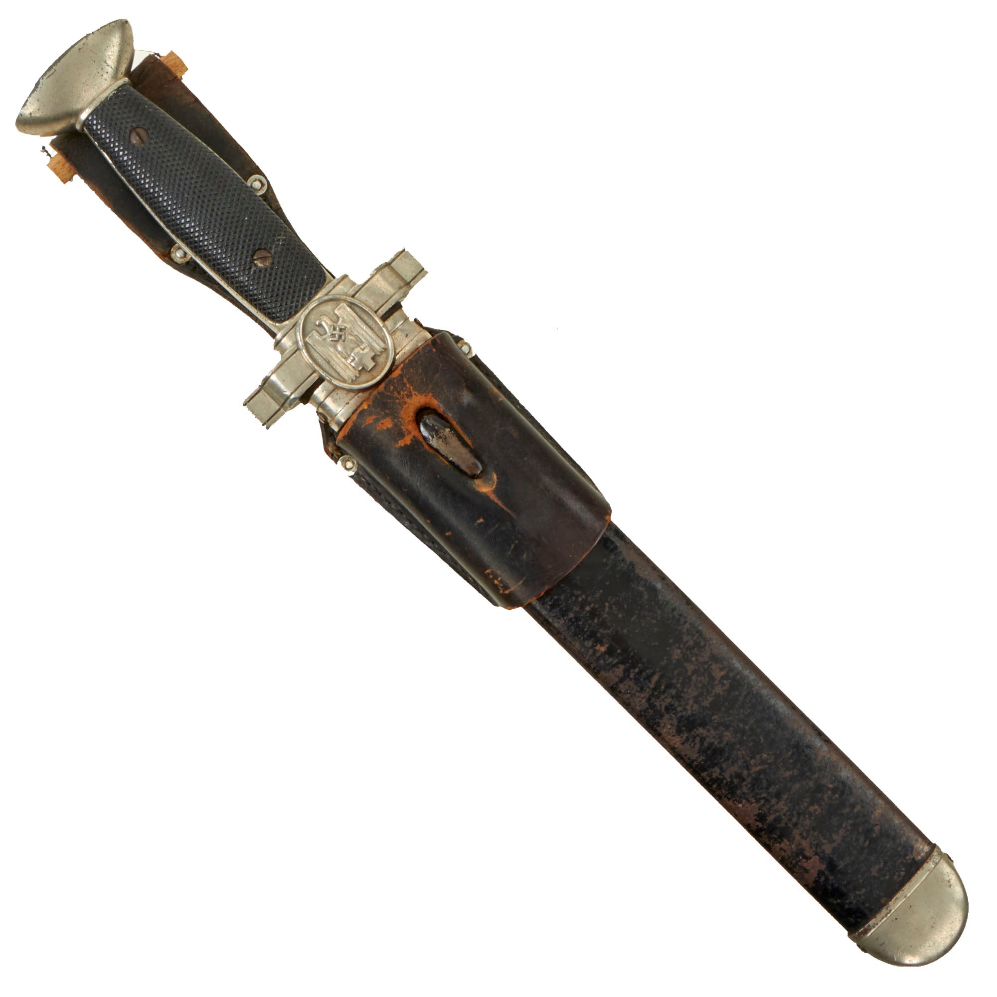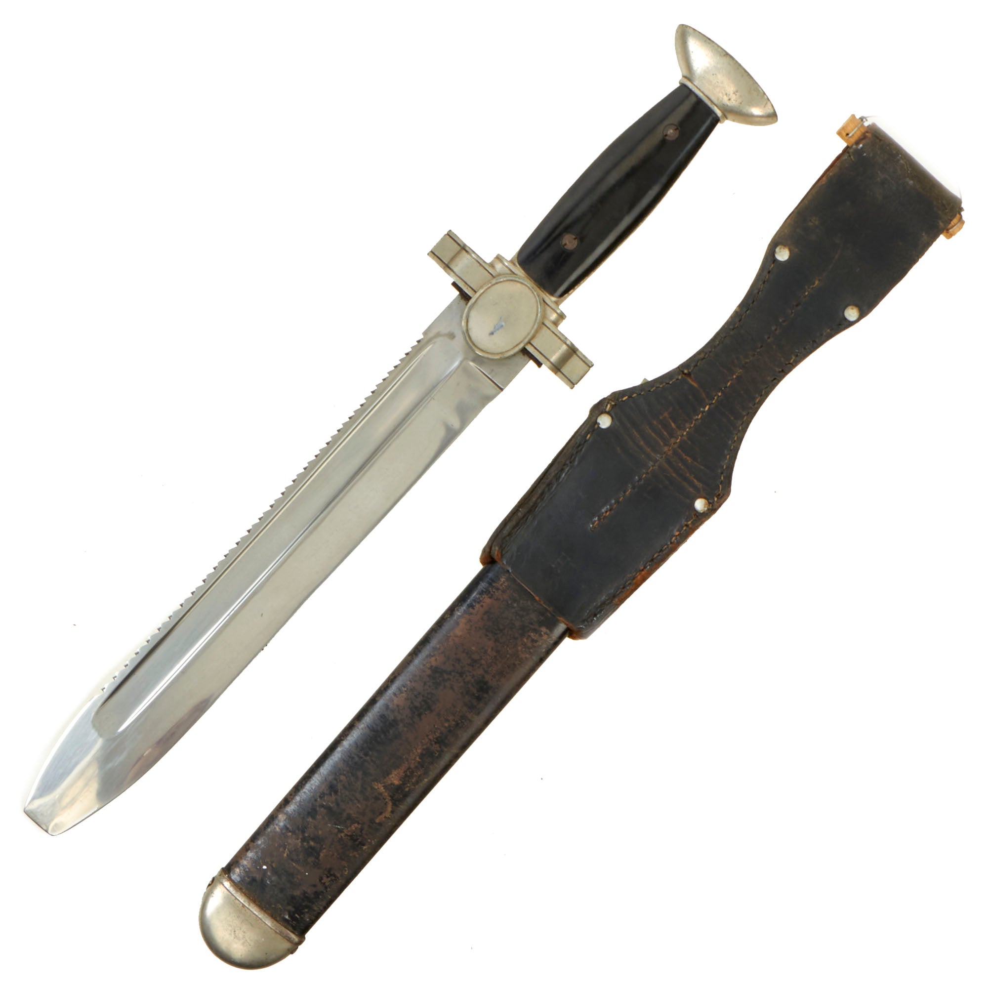 • Original Item: Only One Available. This is an very good condition example of the German Red Cross (DRK) Enlisted Man / Non-Commissioned Officer Hewer, complete with its original scabbard and leather belt frog. The hewer has a blunt tip and edge, as it was intended for combat medics, who would make more use of the Sawback blade, which could be used to cut wood for splints. The heavy blade could however be used for chopping if sharpened, similar to the U.S. Hospital corps "bolo" knives of WWI.