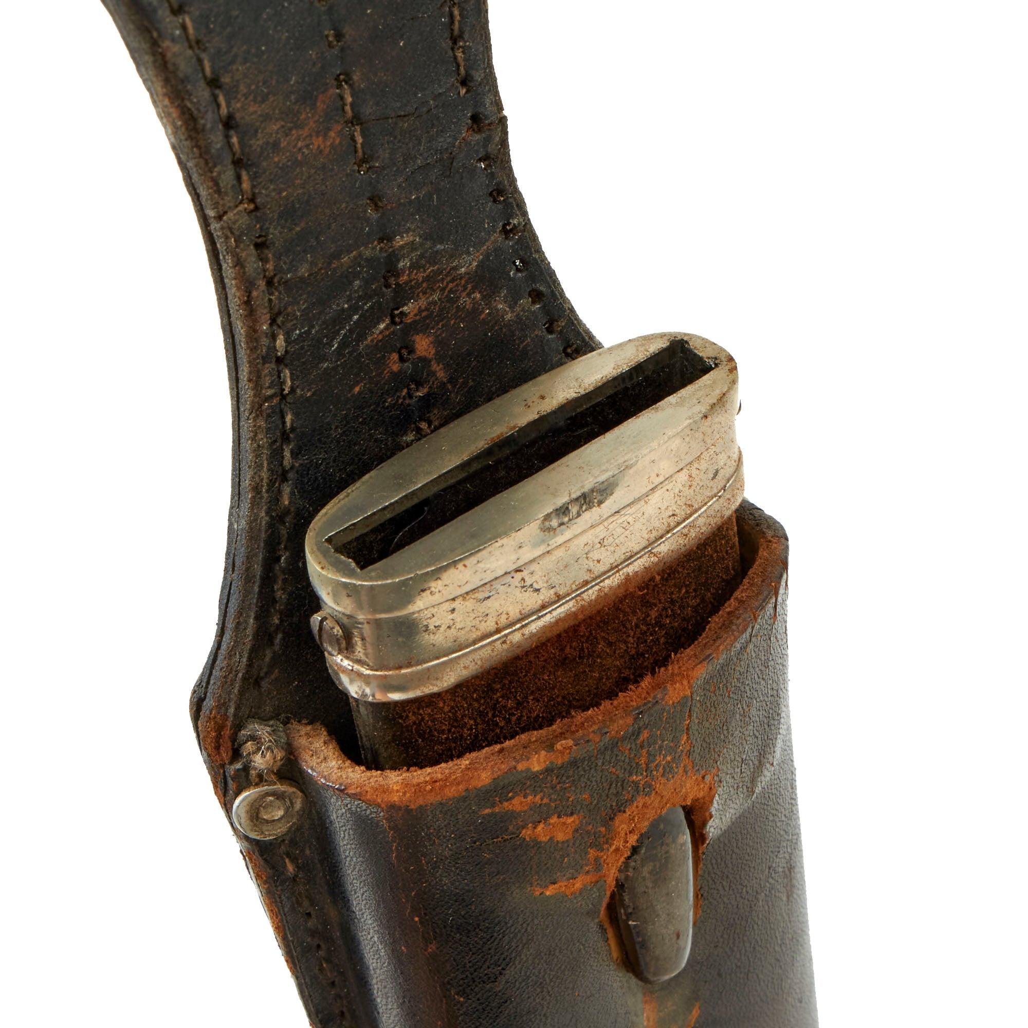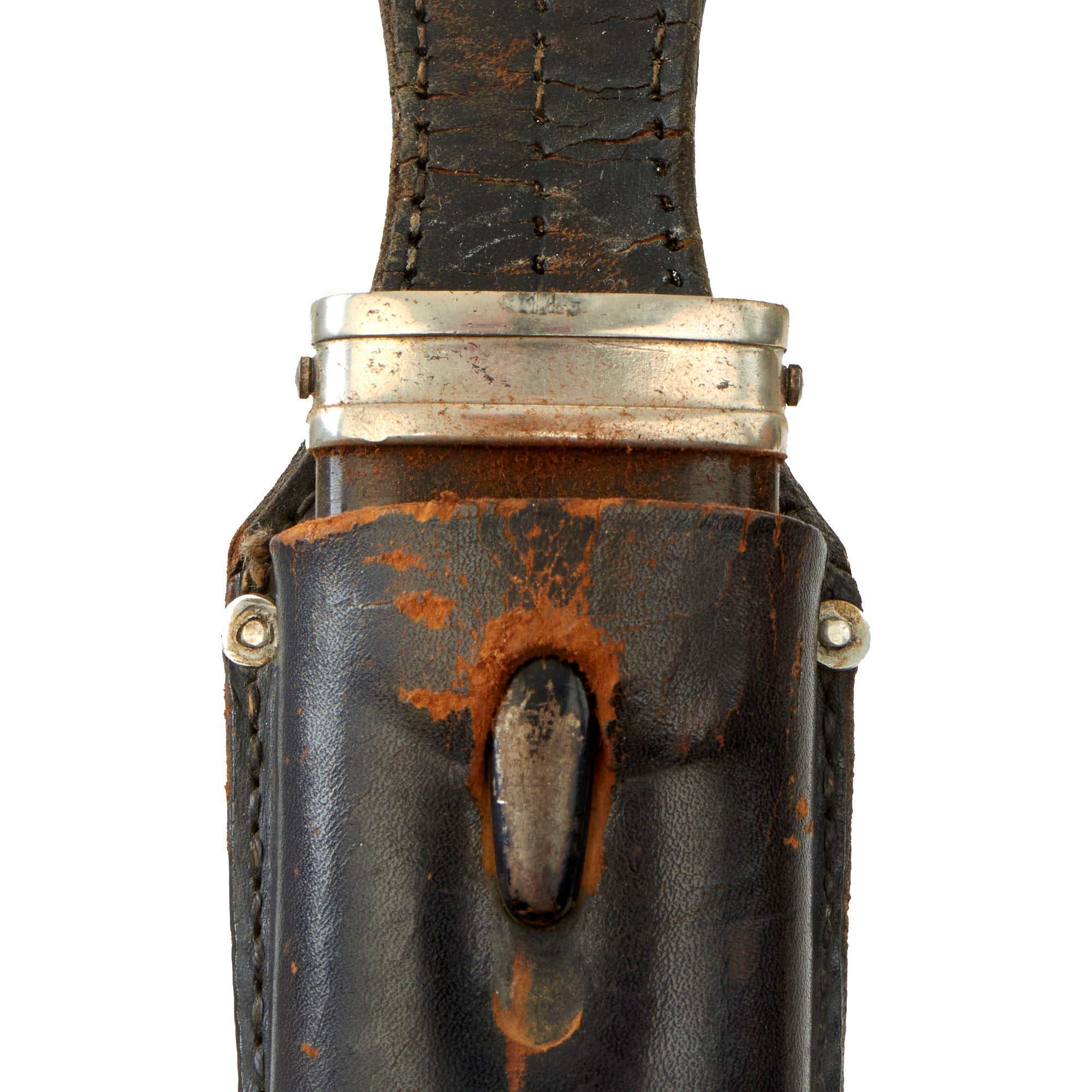 The nickel plated steel fittings are still present, each retained by two screws that show no sign of turning. They show light overall oxidation, with some areas of plating loss. The scabbard is held in a very good condition black leather frog, which features aluminum rivets. The stitching in the body of the frog under the belkt loop has puleld and rotted out, and there is some cracking to the leather in that area, as well as in the belt loop area. A wooden dowel with a wire hanger has been fitted into the belt loop for display.
