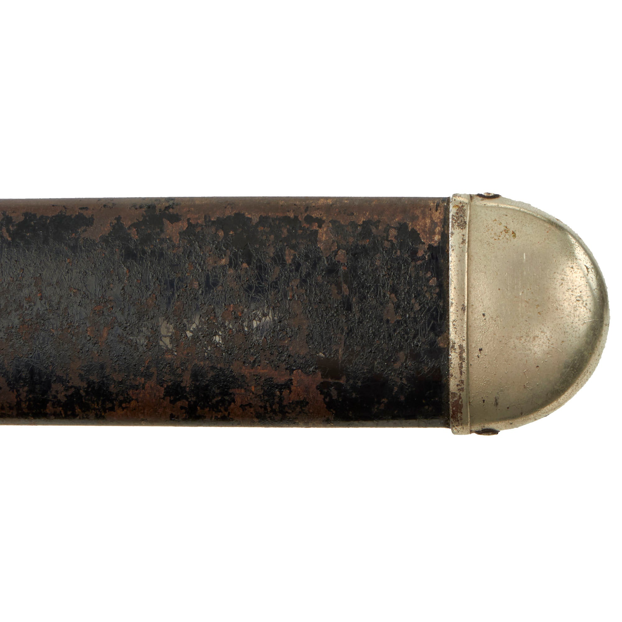 The scabbard is in good condition, showing just a few small dents to the steel body that we can see, with no bending The original black enamel finish has degraded over time due to wear and age, probably retained now at around 60% with the rest having flaked off. The remaining paint shows crazing and checking, and the areas of the scabbard body missing the finish have oxidized a bit.