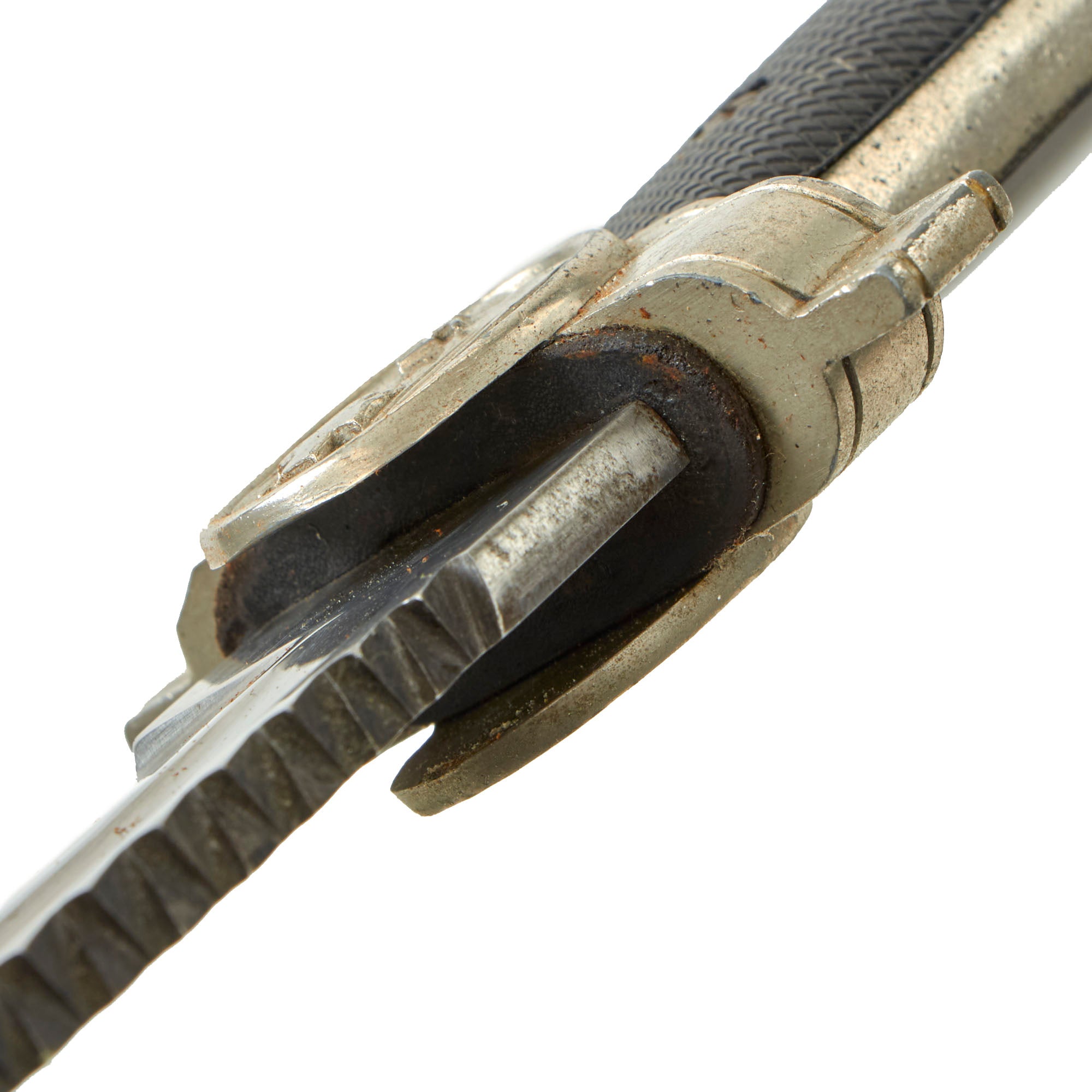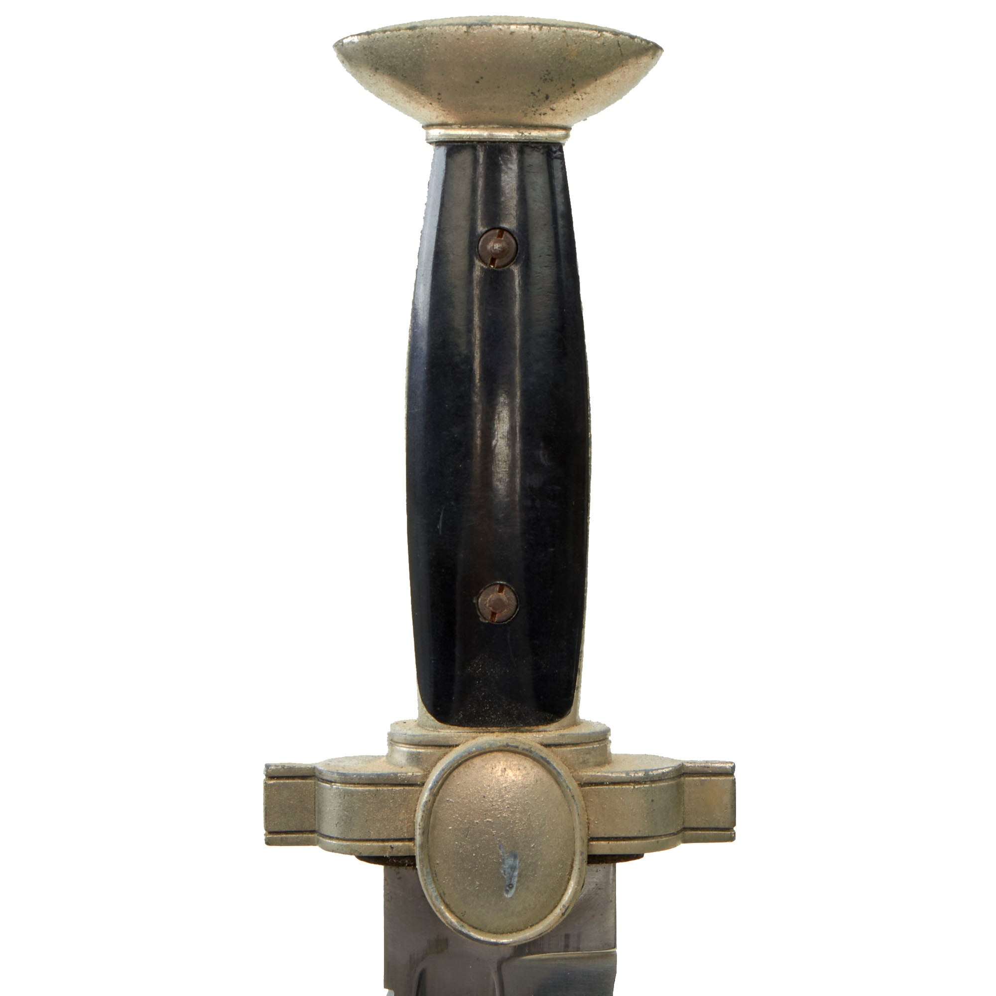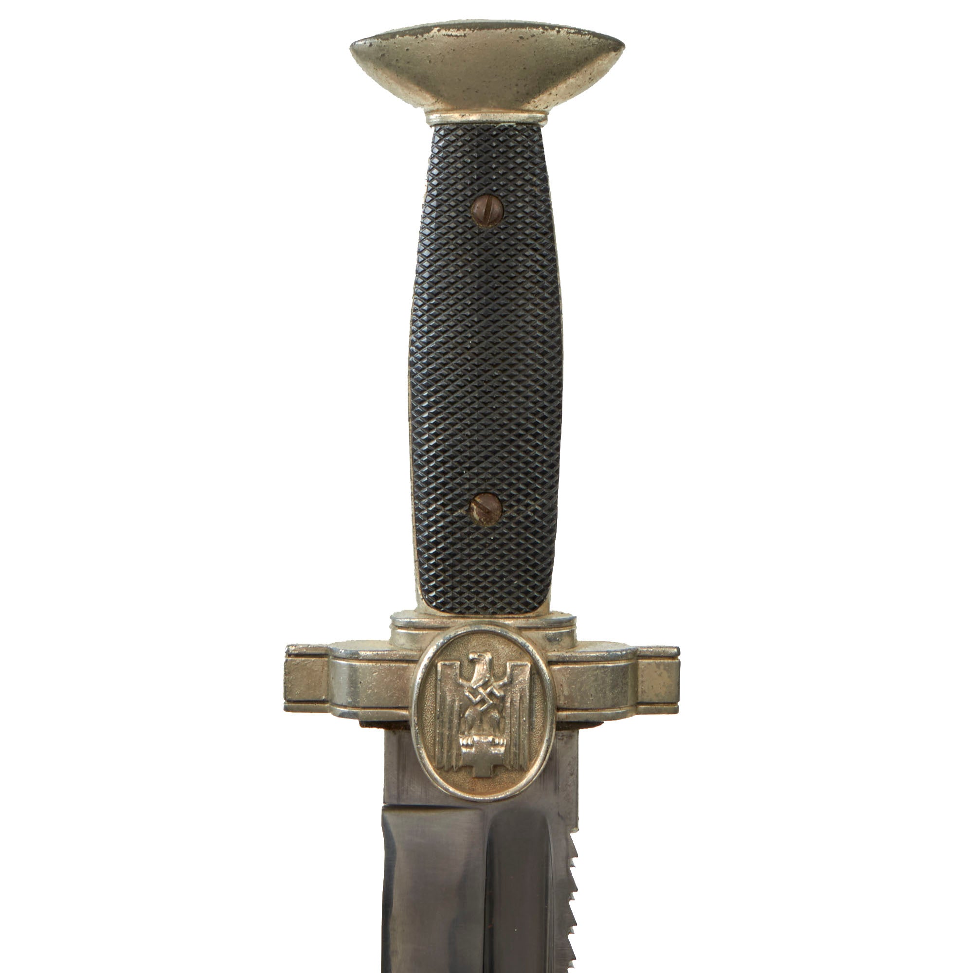 The crossguard features an oval boss on each side, with the obverse featuring an eagle with half-opened wings and a raised out mobile Swas (hook cross) on his breast. The bird clutches a "Geneva cross" in his talons. The grip plates are bakelite, with the top plate being checkered, and the bottom plate being smooth and having a small chunk missing. They are retained by the original screws and steel slotted bolts, which show some oxidation. The crossguard still has the original leather buffer washer around the blade.