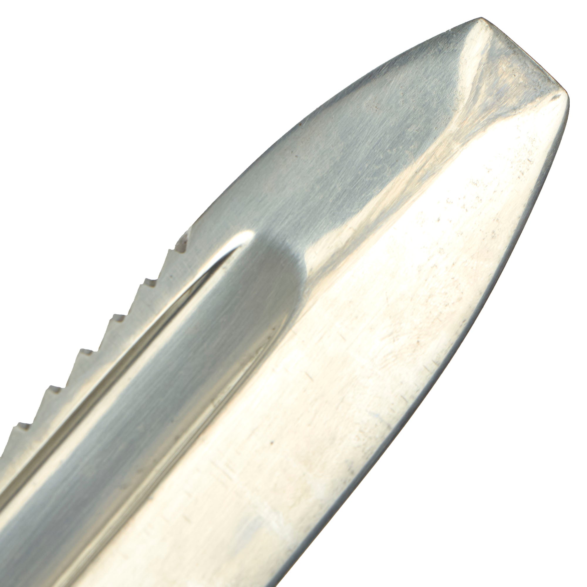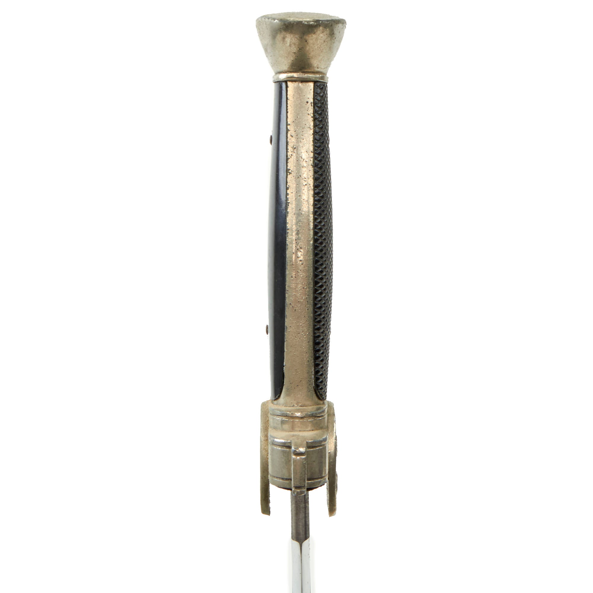The alloy hilt mounts retain much of the original nickel-plating, however there is definitely some flaking and bubbling from long term oxidation, most likely suffered during storage. There is a bit of wear through to the non-magnetic base metal around the end of the pommel, probably from storage, and the grip shows signs of only light use.