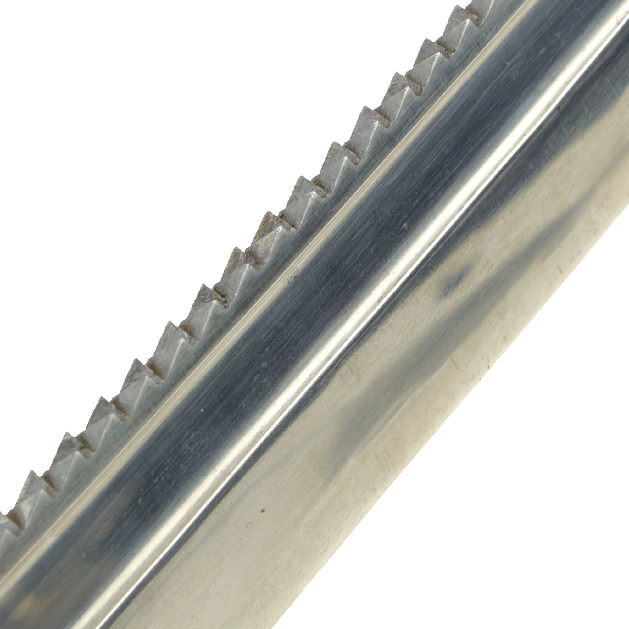 The blade of this hewer is the classic saw back type, and is in very good condition, with little to no oxidation present. It however definitely was sharpened and polished in the past, as indicated by the edge irregularity near the ricasso. It looks to have been done long ago, probably to remove surface oxidation, and there are now swirl marks on top of the new polish. Under the cross guard the blade is marked GES. / GESCHÜTZT, for Gesetzlich Geschützt (Protected By Law), indicating that this knife was a trademarked design.