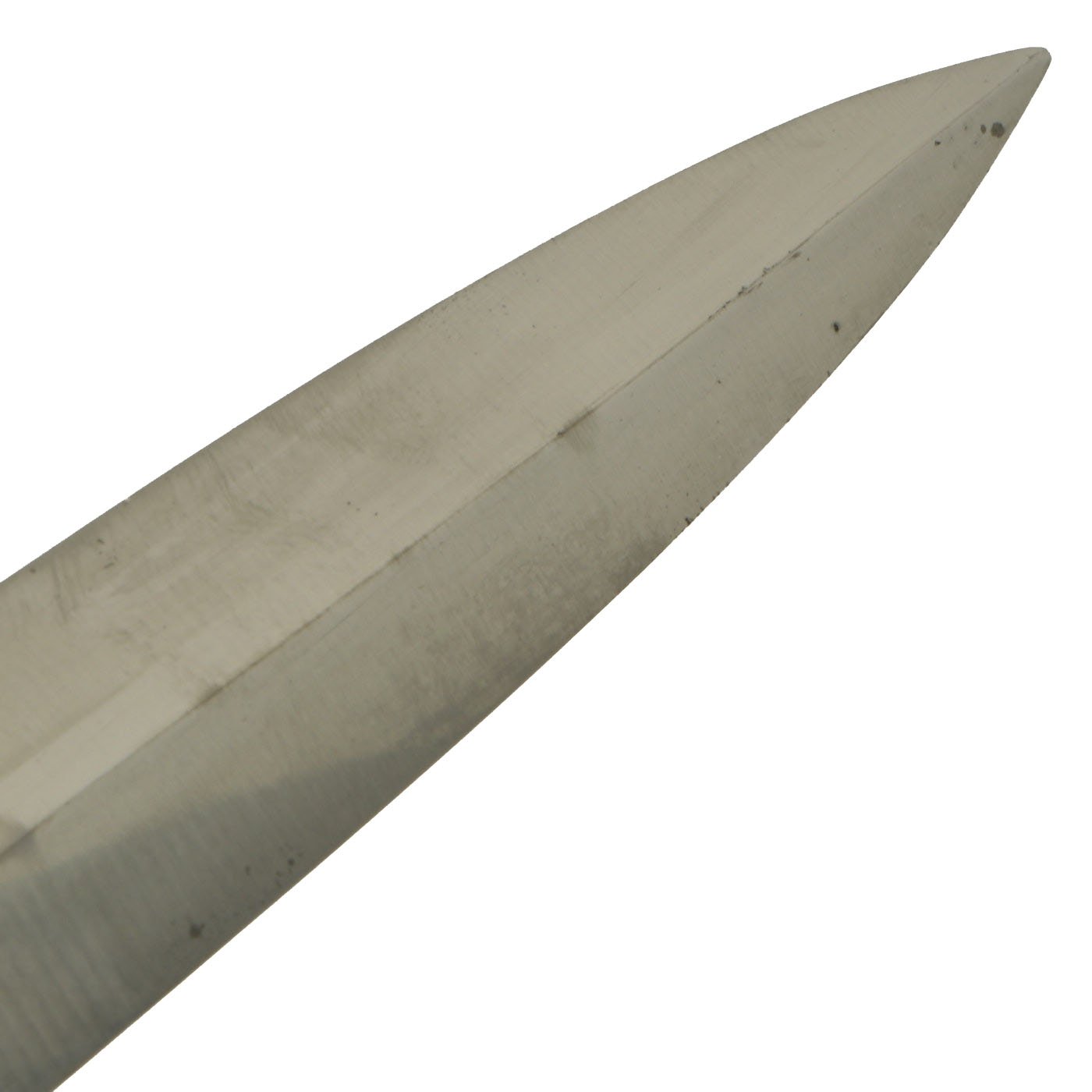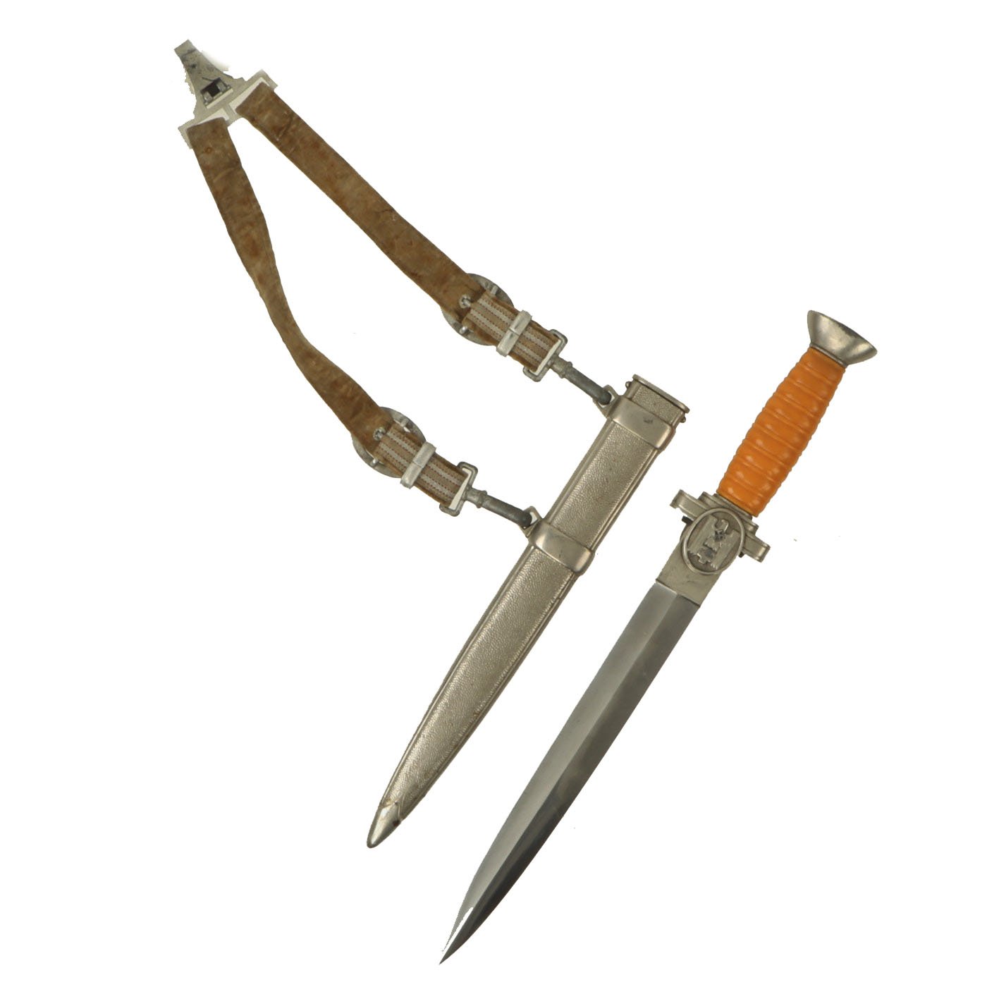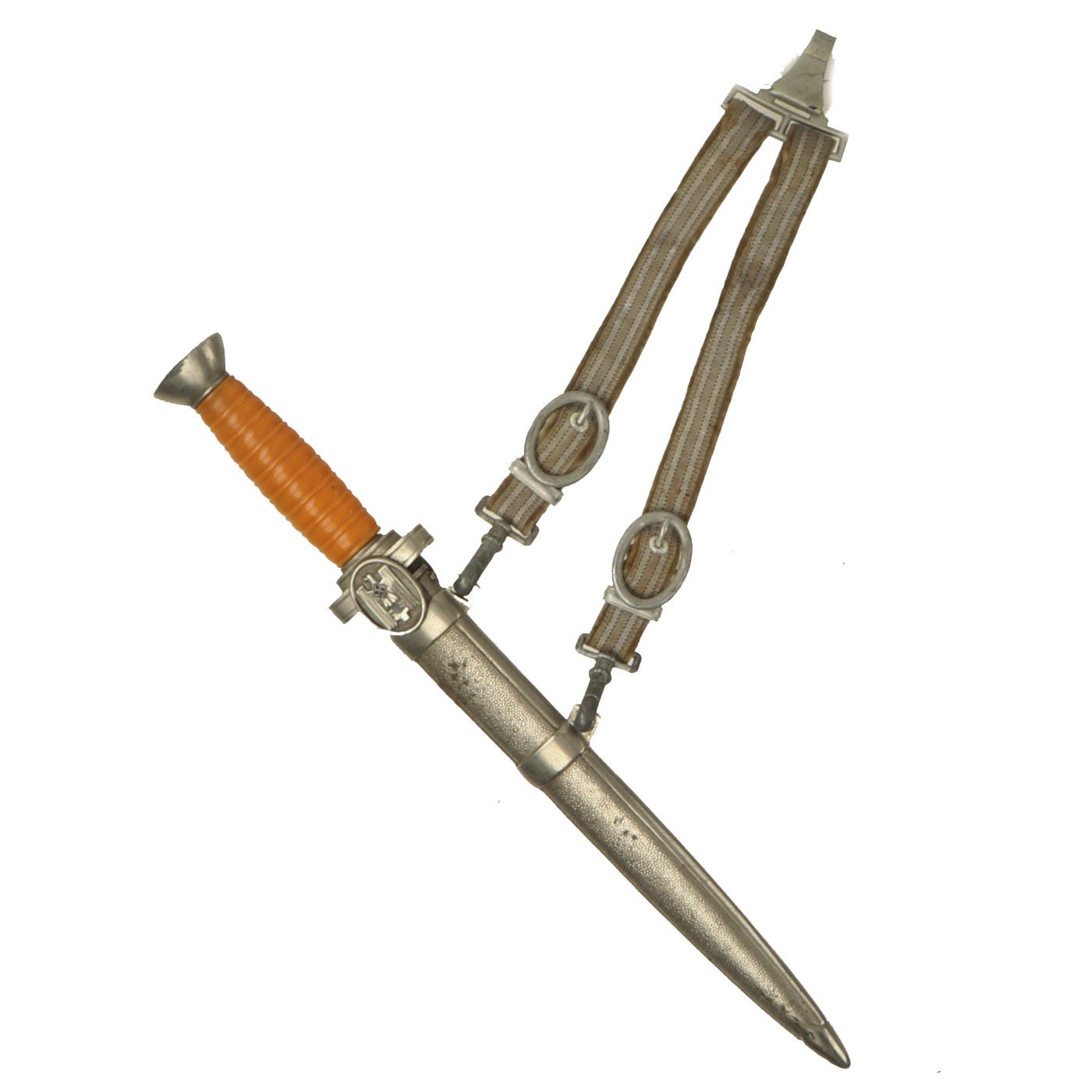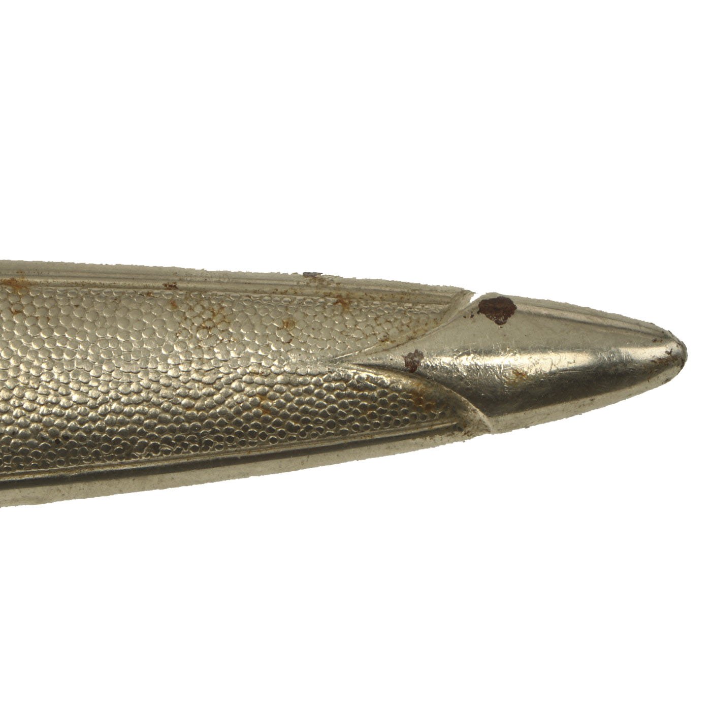 Original Item: Only One Available. This is an excellent example of a very rare German Red Cross (DRK) Officer's Dagger, complete with its nickel plated scabbard and portepee. Unlike the more commonly found EM/NCO Hewer, these daggers have a double edged spear point blade, which is actually fairly sharp near the tip. These were worn by officer's, and not intended for the utility use of the hewer, so they utilize more standard German WWII Dagger construction, with a tang fully enclosed in the grip.
