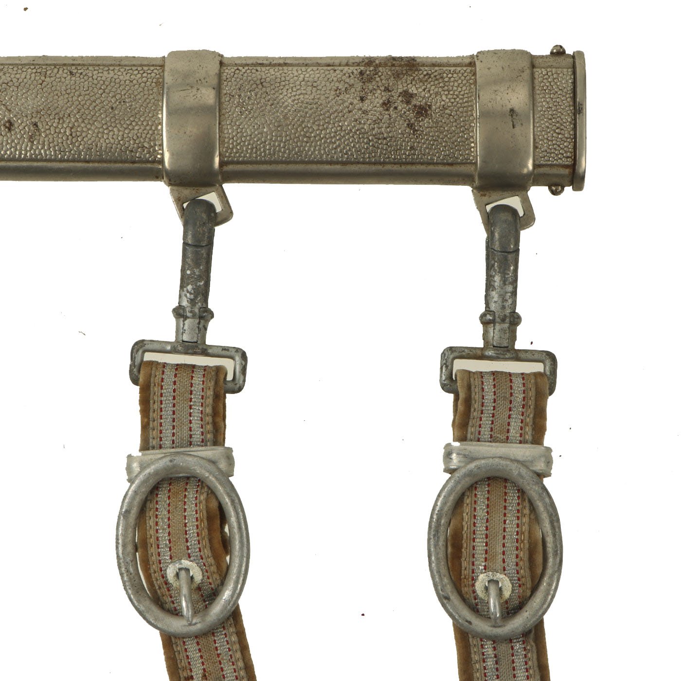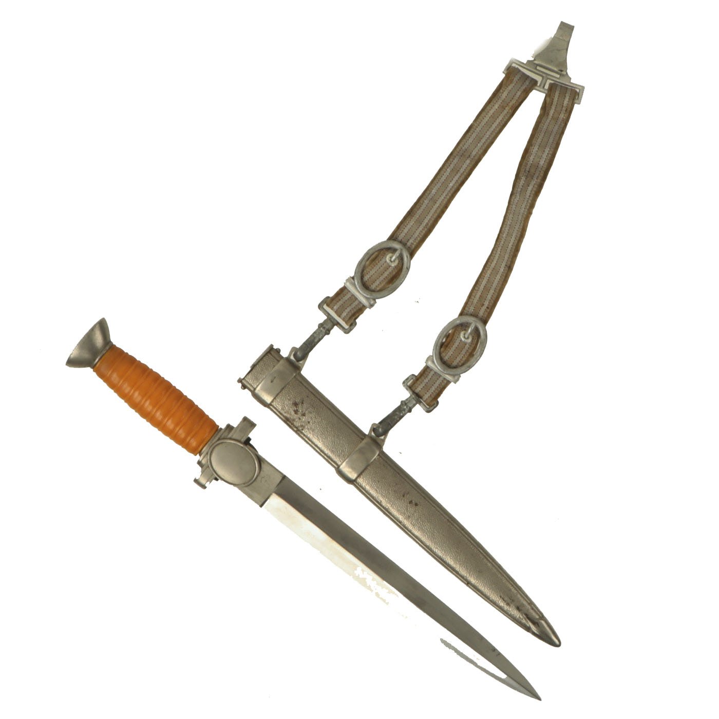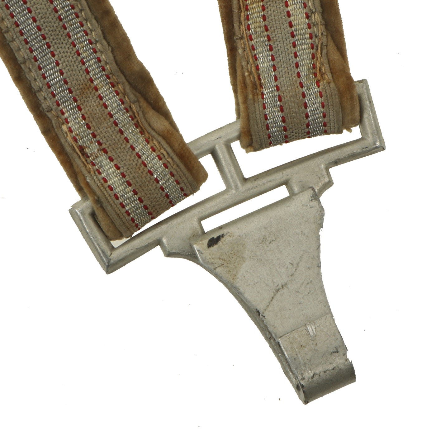 Attached to the scabbard is a very good condition belt hanger, with functional pebbled spring clips with a great patina. The buckles and keepers are plain, as is correct for the DRK dagger, and have lovely red and silver stripping on the outside. The tan velvet backing is in very good shape, though there is wear and staining. The aluminum belt clip for attaching to the belt loop is still fully functional.