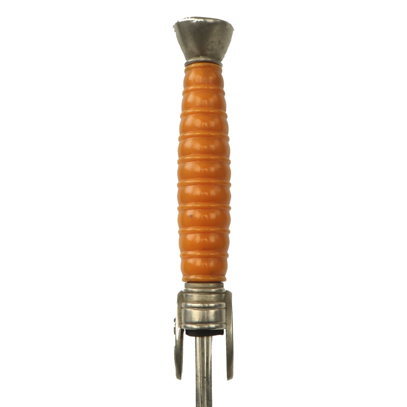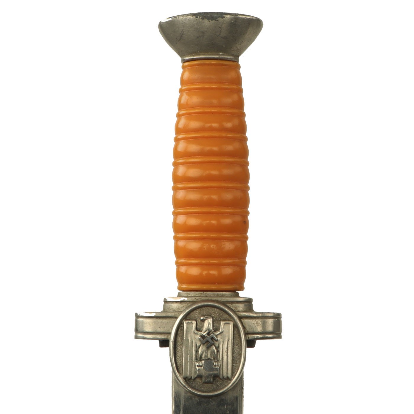 The crossguard features an oval boss on each side, with the obverse featuring an eagle with half-opened wings and a raised out mobile swas (hook cross) on his breast. The bird clutches a Geneva cross in his talons. The celluloid grip of this example has faded to a very nice amber color. The end nut does show some wear, probably from tightening. As it is, the grip and crossguard are slightly loose on the tang, due to shrinking from age.