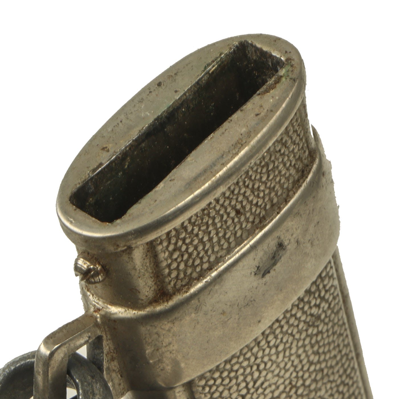 The scabbard is in very good condition, with almost fully intact nickel plating, and minimal oxidation and wear. It features very nice pebble-grained panels, and a throat retained at both sides by small dome headed screws. They show no evidence of ever having been removed.