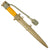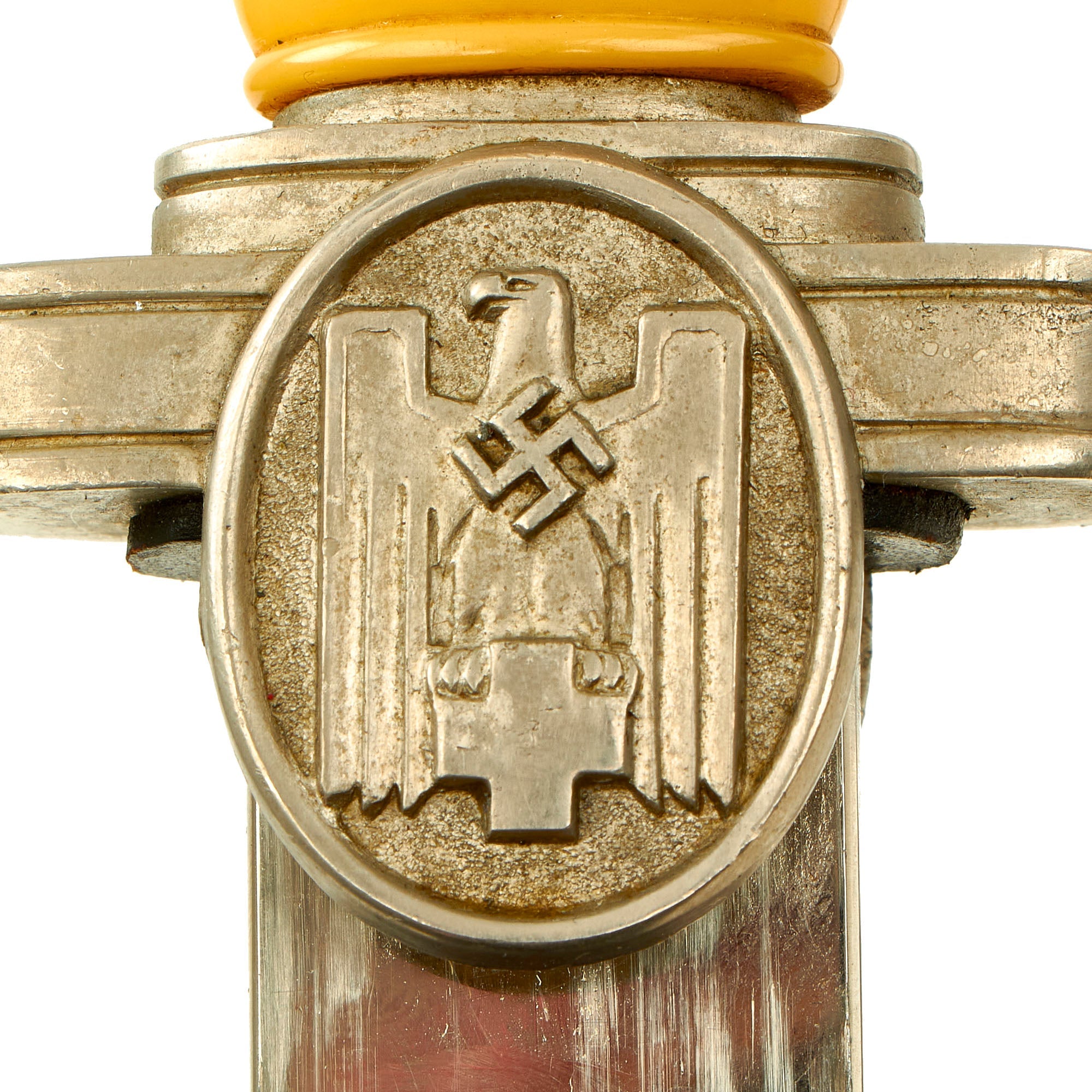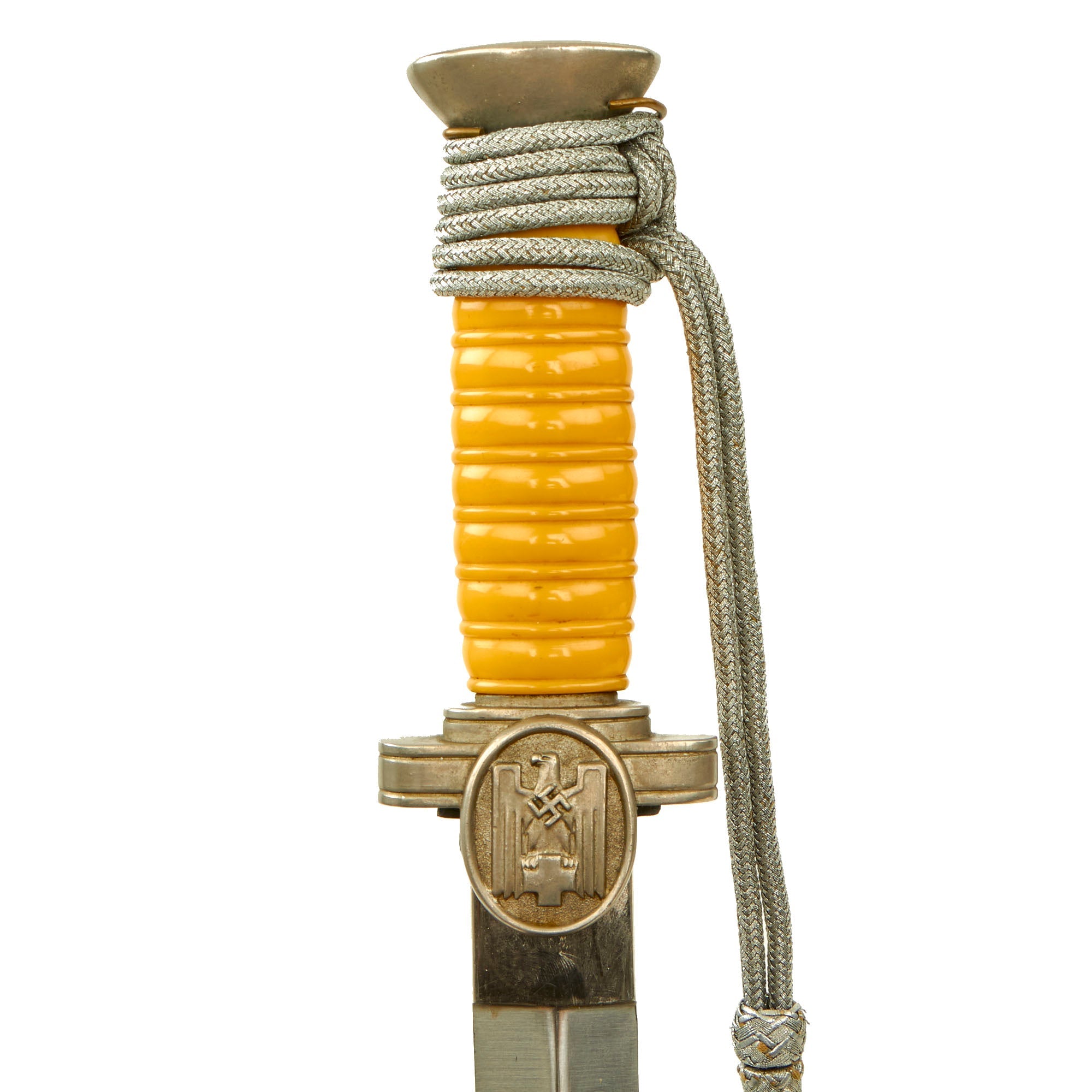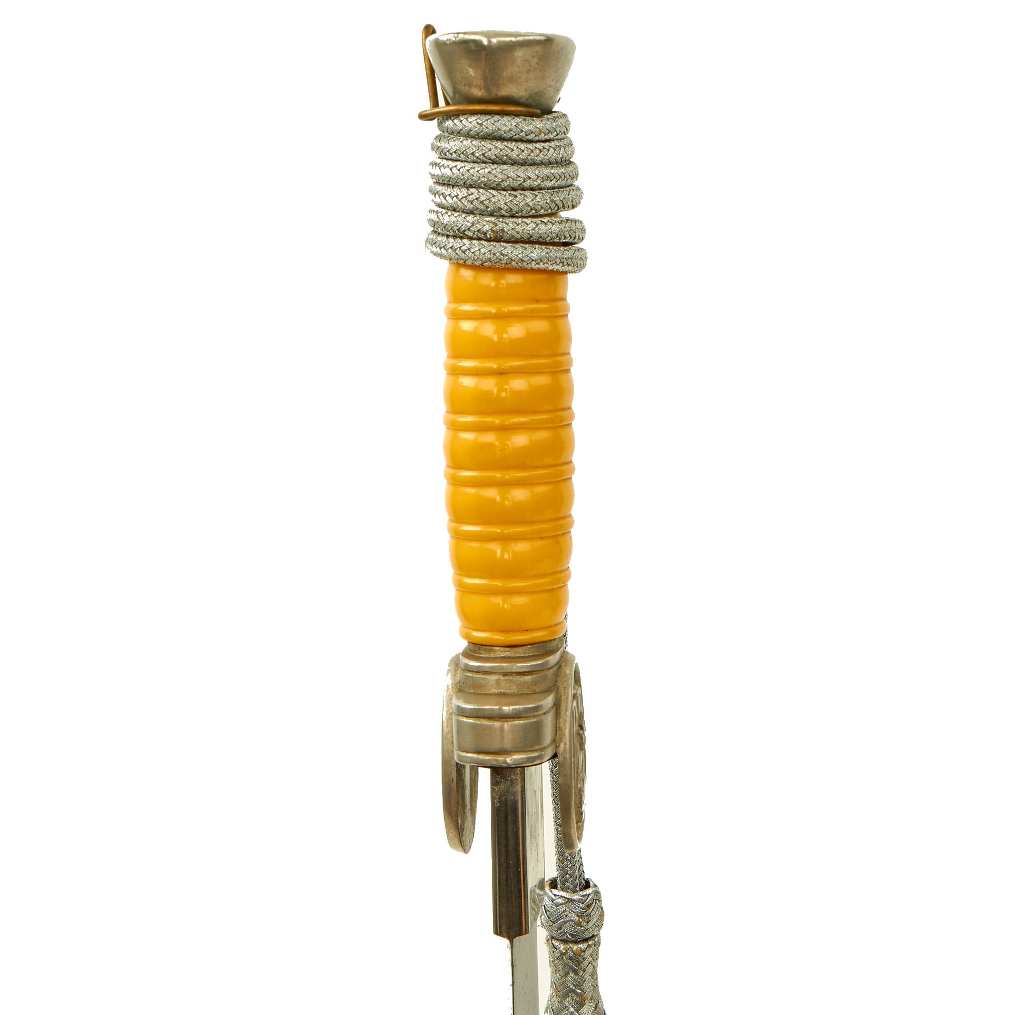 The crossguard features an oval boss on each side, with the obverse featuring an eagle with half-opened wings and a raised out mobile swas (hook cross) on his breast. The bird clutches a Geneva cross in his talons, the emblem of the DRK. The celluloid grip of this example has faded to a very nice lemon yellow color. It is in very good condition showing little use and/or staining, though there is a stress crack running about an inch inward from the pommel on the reverse. The end nut does show some minor wear, probably from tightening. As it is, the grip and crossguard are just a tiny bit loose on the tang, due to shrinking from age. Tied around the end of the grip is a very nice aluminum bullion portepee knot, which shows just a bit of light wear and oxidation.