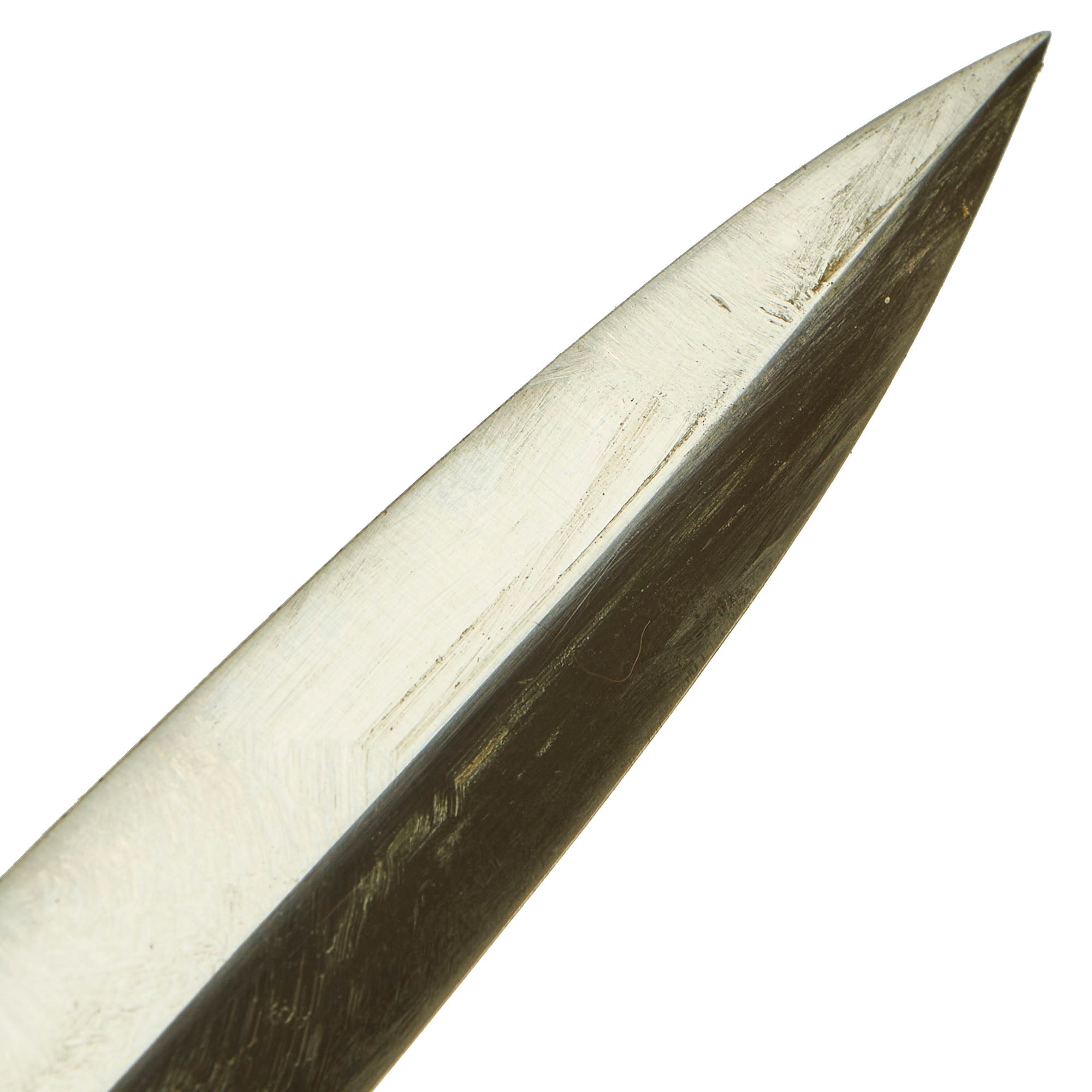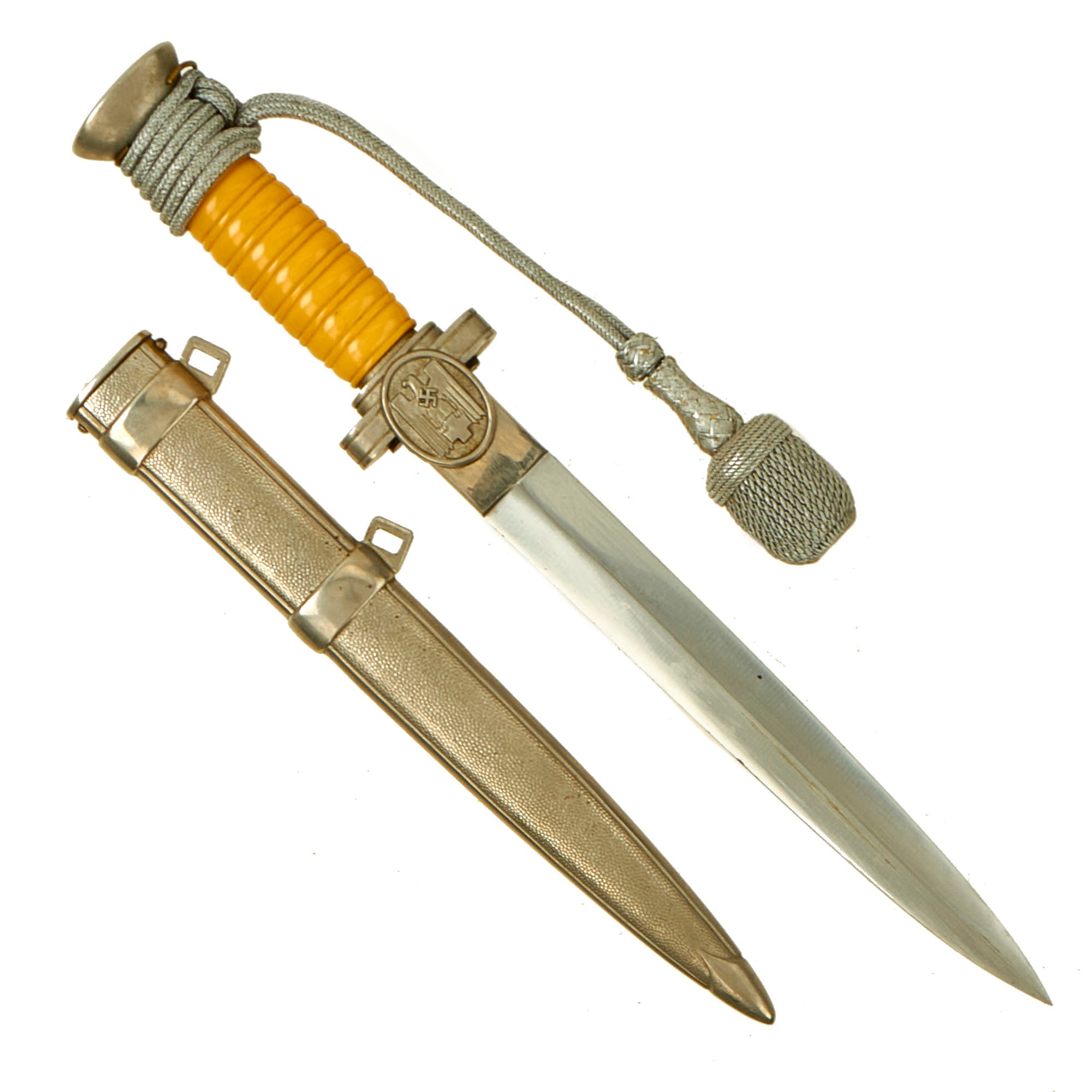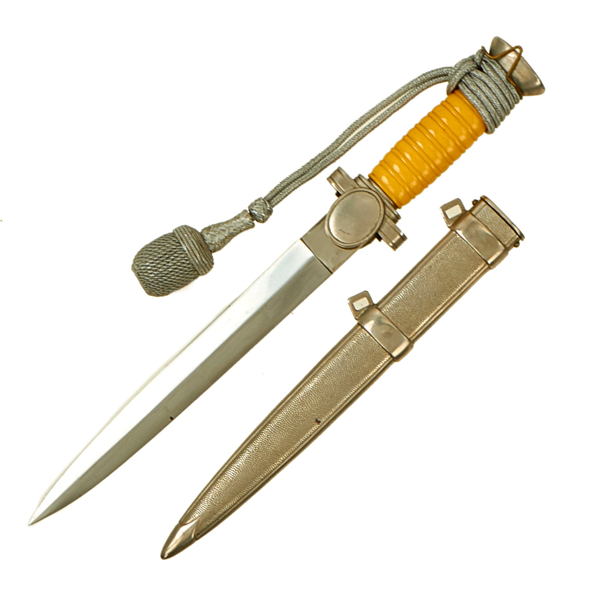 Original Item: Only One Available. This is a great example of a very rare German Red Cross (DRK) Officer's Dagger, complete with its nickel plated scabbard and portepee knot. Unlike the more commonly found EM/NCO Hewer, these daggers have a double edged spear point blade, which is actually fairly sharp near the tip. These were worn by officer's, and not intended for the utility use of the hewer, so they utilize more standard German WWII Dagger construction, with a tang fully enclosed in the grip.