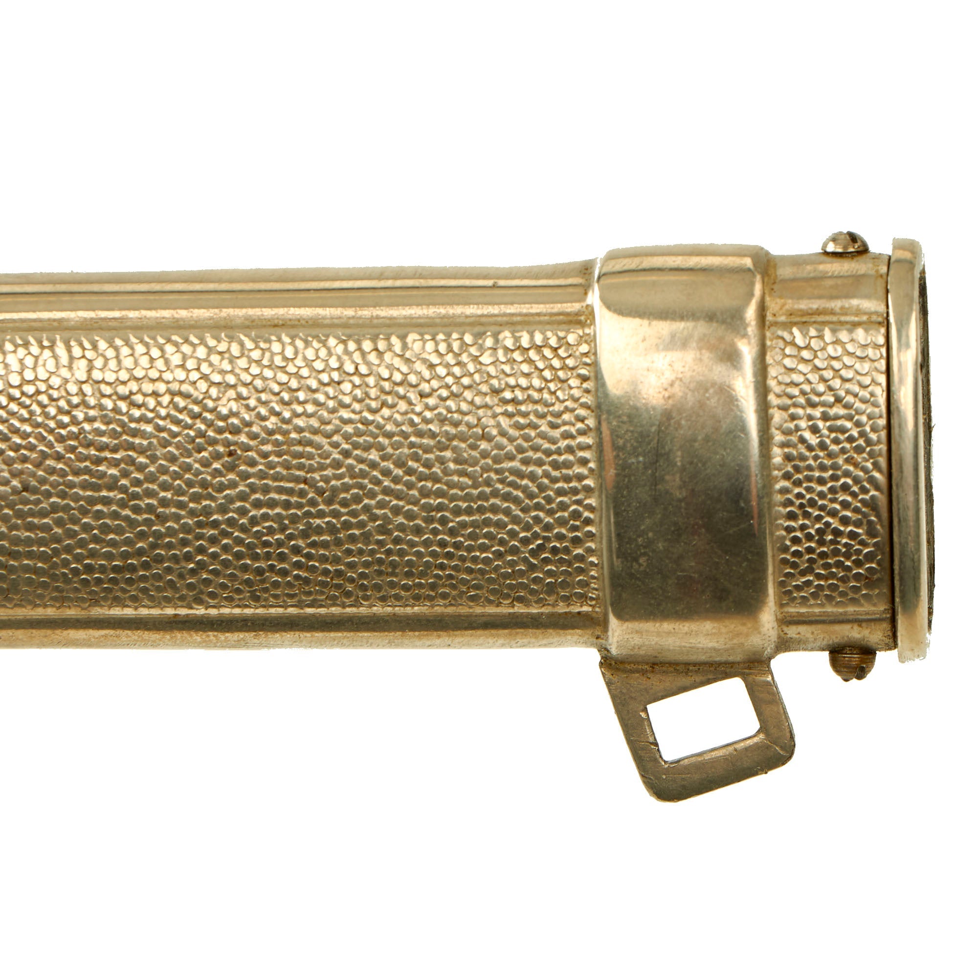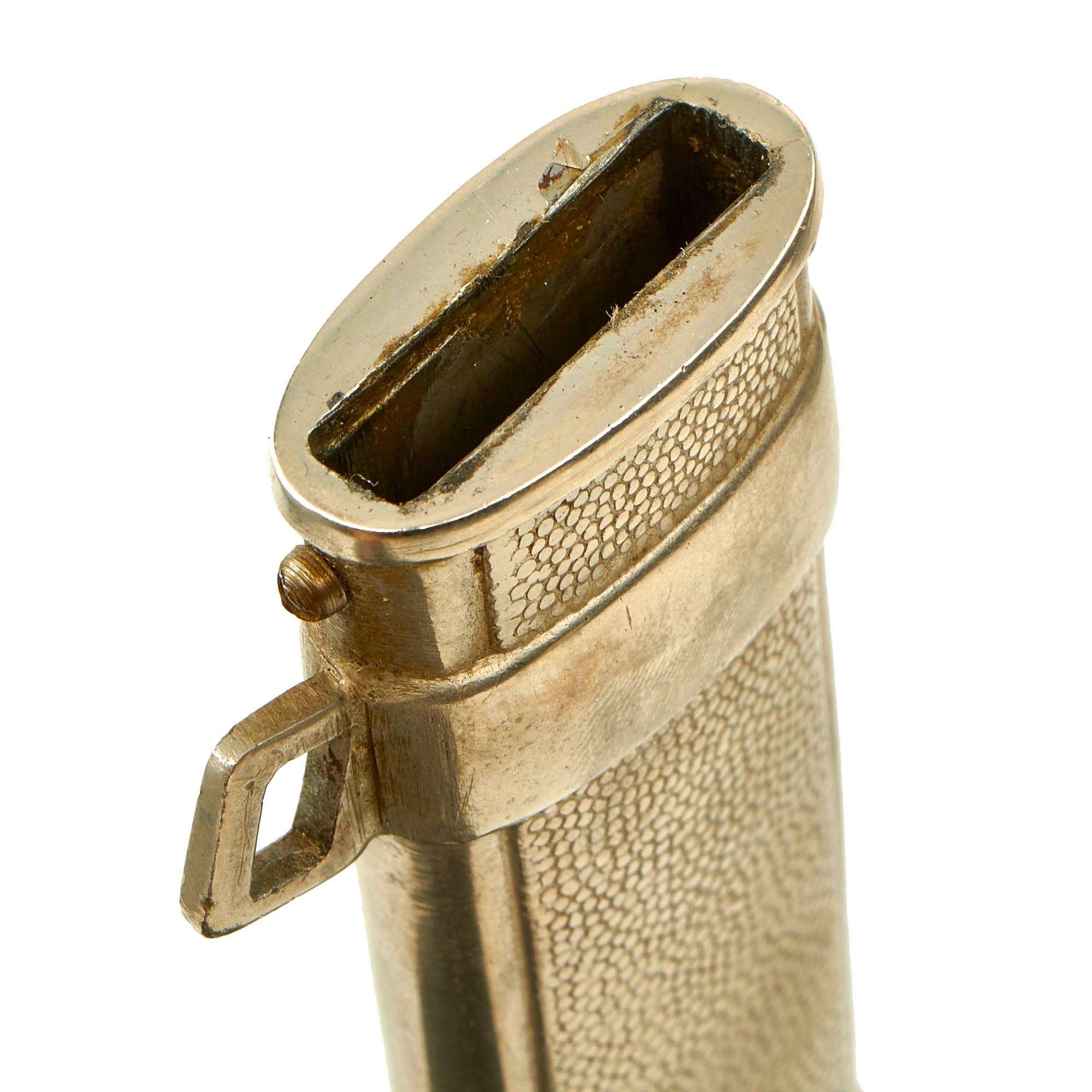The scabbard is in very good condition, with almost fully intact nickel plating, and minimal oxidation and wear. It features very nice pebble-grained panels, and a throat retained at both sides by small dome headed screws. They show no evidence of ever having been removed. Really a fantast example.