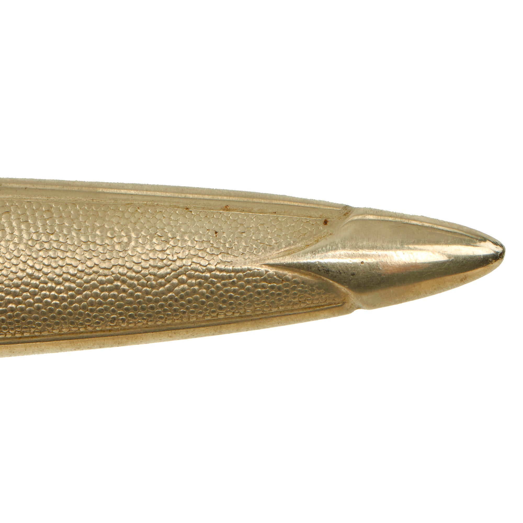 The blade of this dagger is in excellent near mint condition! It has full factory final grind crossgrain, with just two spots of oxidation on the blade's reverse. This texture is iconic, and is the definitive identifying characteristic for a real WWII German Blade. There is some minor runner wear on the blade center ridge, to be expected. There is no evidence of post factory sharpening, and the original tip is intact and unbent. The blade is unmarked, as almost all DRK Officer Daggers will be. These were contract purchased and awarded directly by the DRK, so maker makers were not used. The original blade buffer is present, and looks to possibly be bakelite, or just very stiff leather.
