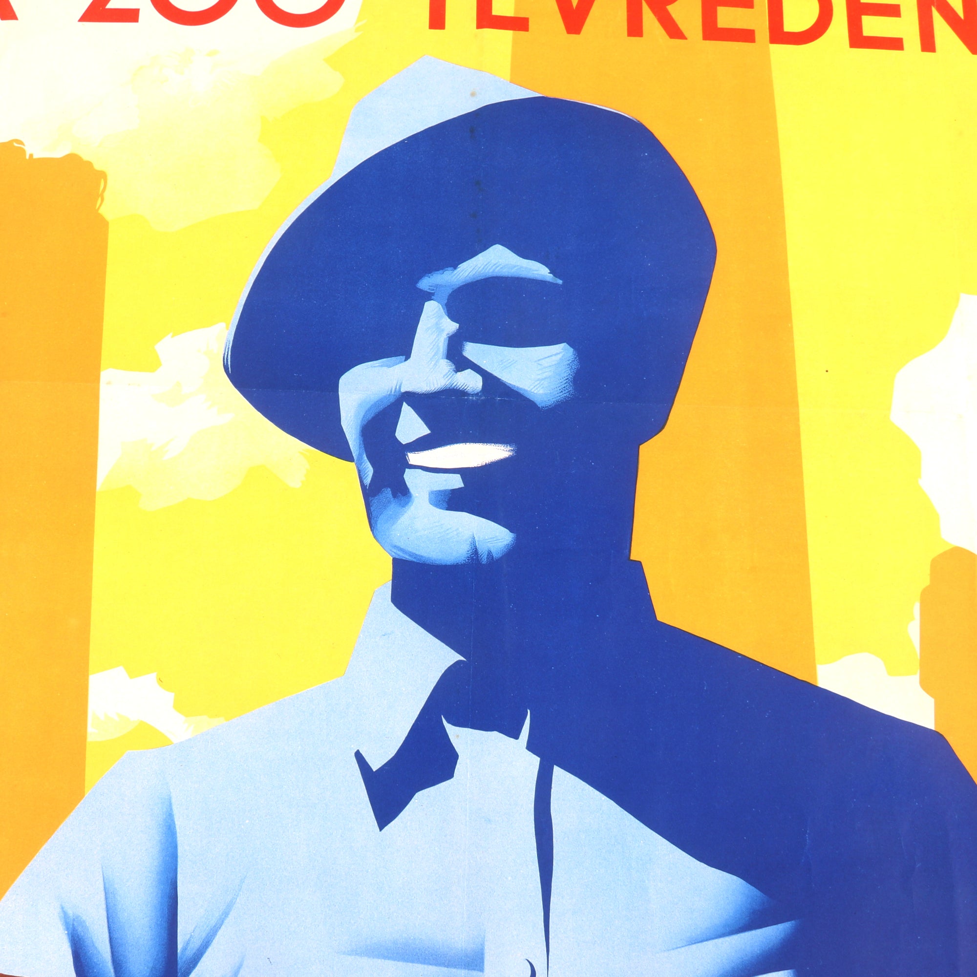 Original Item. Only One Available. This is a rare large size propaganda poster from the German-Occupied Netherlands dating around July 1943. The poster features a smiling worker in shades of blue and white walking towards the viewer in front of a bright yellow and orange shaded industrial background with smoke rising from factory chimneys, the bold stylised lettering above and below. The poster is meant to convince Dutch men to work in Germany, featuring some of the benefits of doing so, such as being happy when the entire country was in a state of disarray due to the occupation.