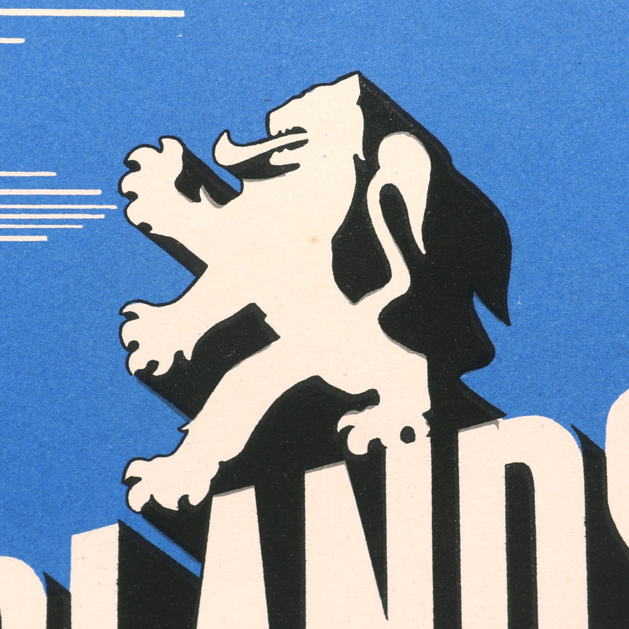 The second poster for the Dutch Union depicts the words NEDERLANDSCHE UNIE standing tall with a Dutch lion on top, with the phrase THE BUILDING OF THE DUTCH PEOPLE underneath. This could be for a union of workers or for an anti-German occupation organization. Measures 11 ⅝” x 17 ½”. Great shape with no tears.