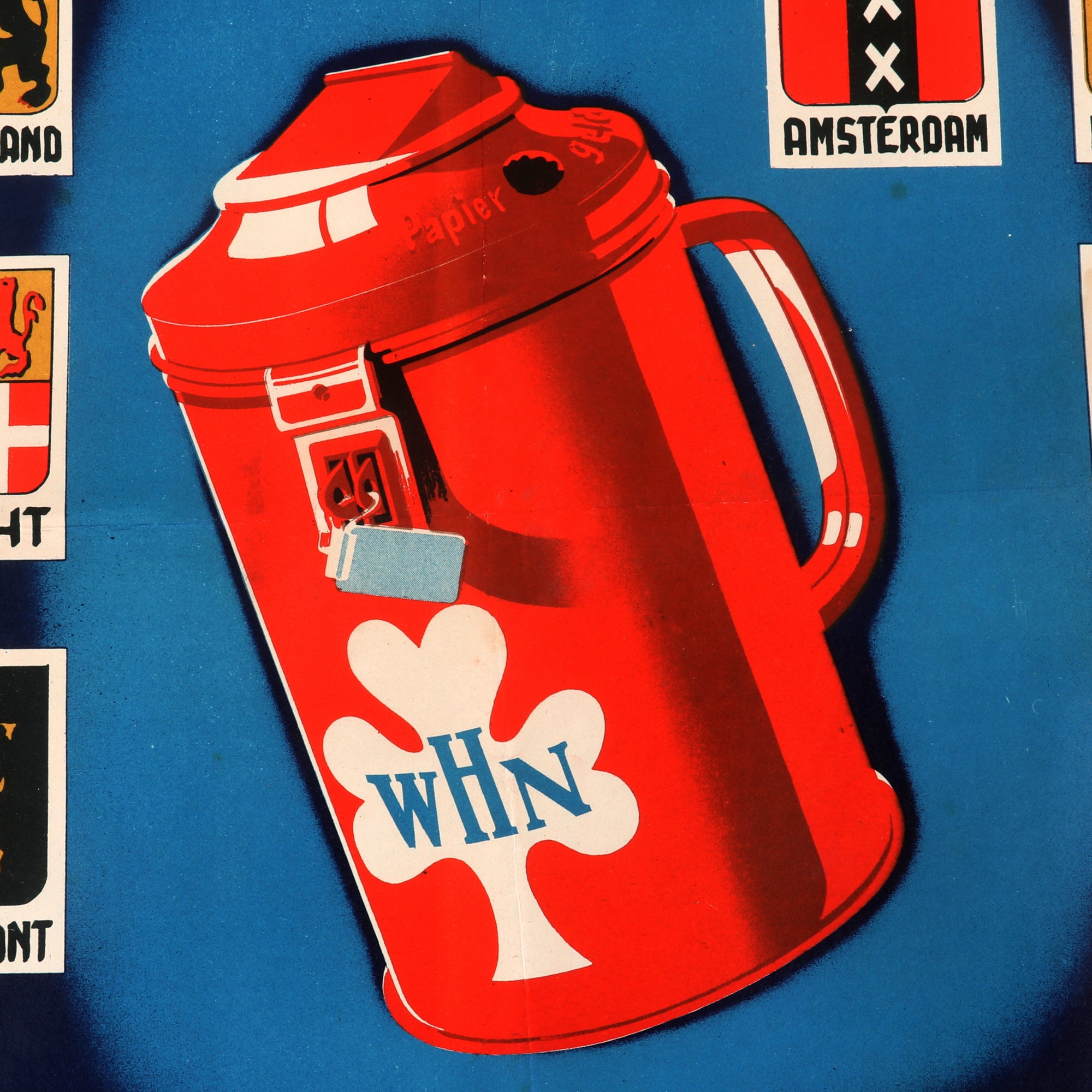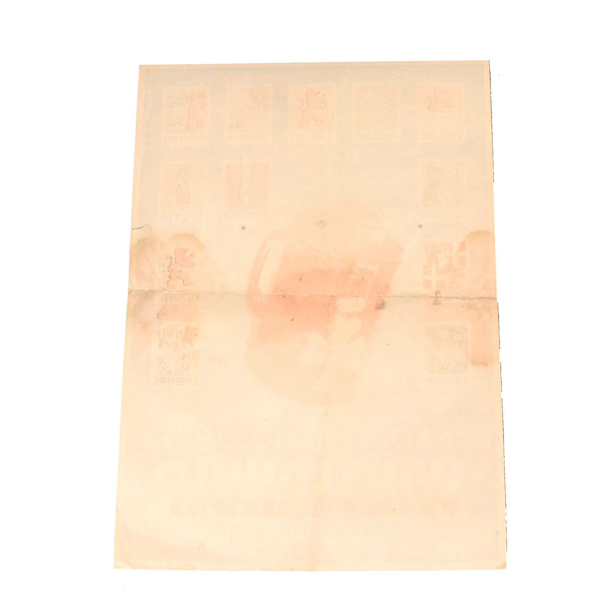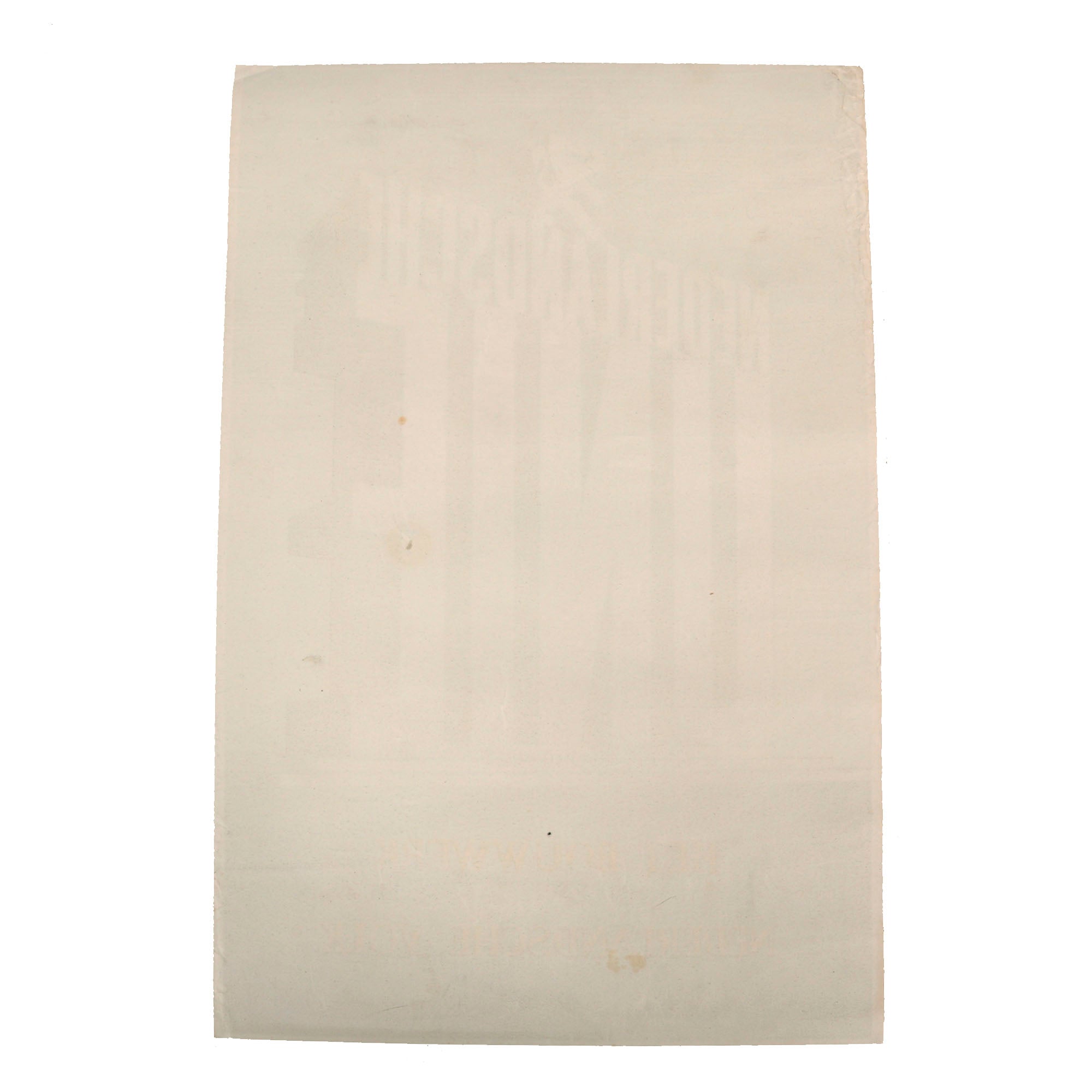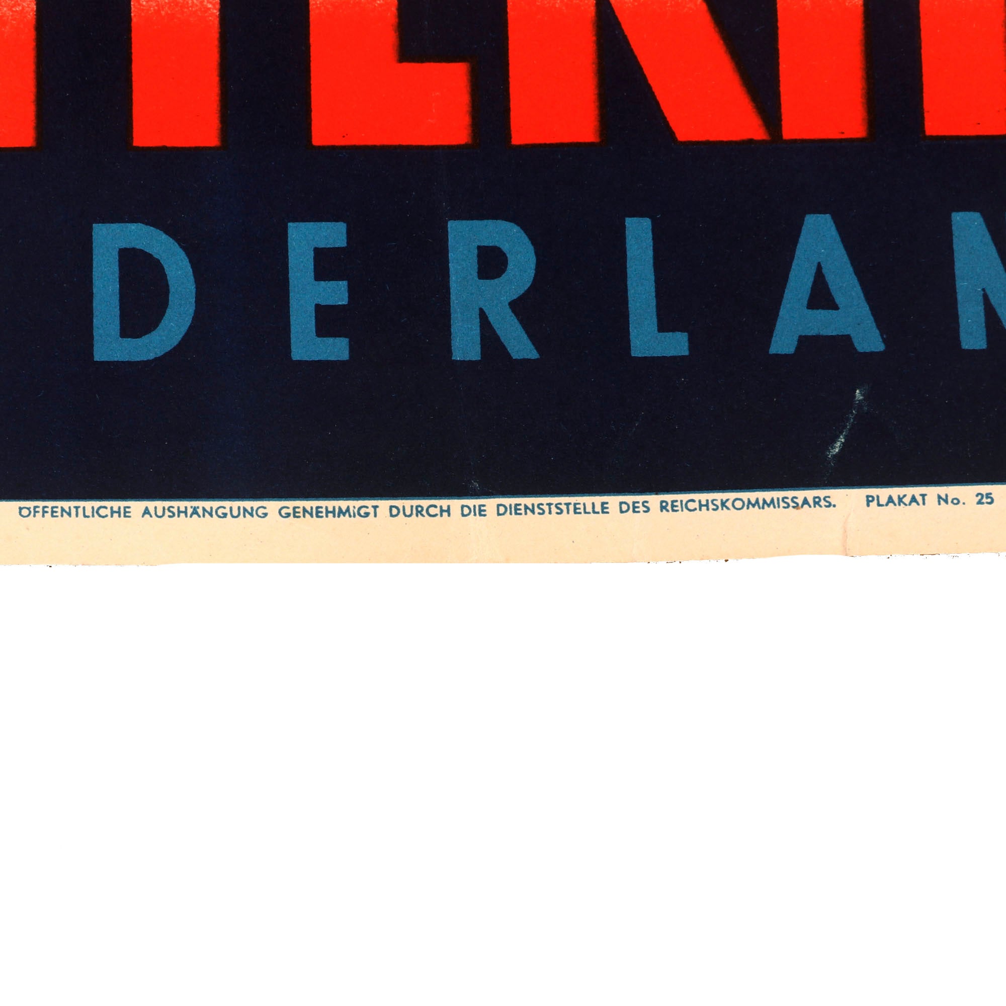 The first poster is for the German Occupied Netherlands announcing a fundraiser for the WHN, an organization that provided help and support to the needy and weak during WWII, often by raising money through lotteries and collections. This aid organization, founded in October 1940 following the example of the German Winterhilfe, was also used as a National Socialist propaganda institute. The poster features a WHN Can surrounded by different Dutch cities and crests to announce the cities where the fundraiser will be taking place, on October 17-18th. The poster has been folded and has one small tear on the right side and a couple at the bottom. Great piece overall. The poster measures 15” x 20 ⅞”.