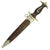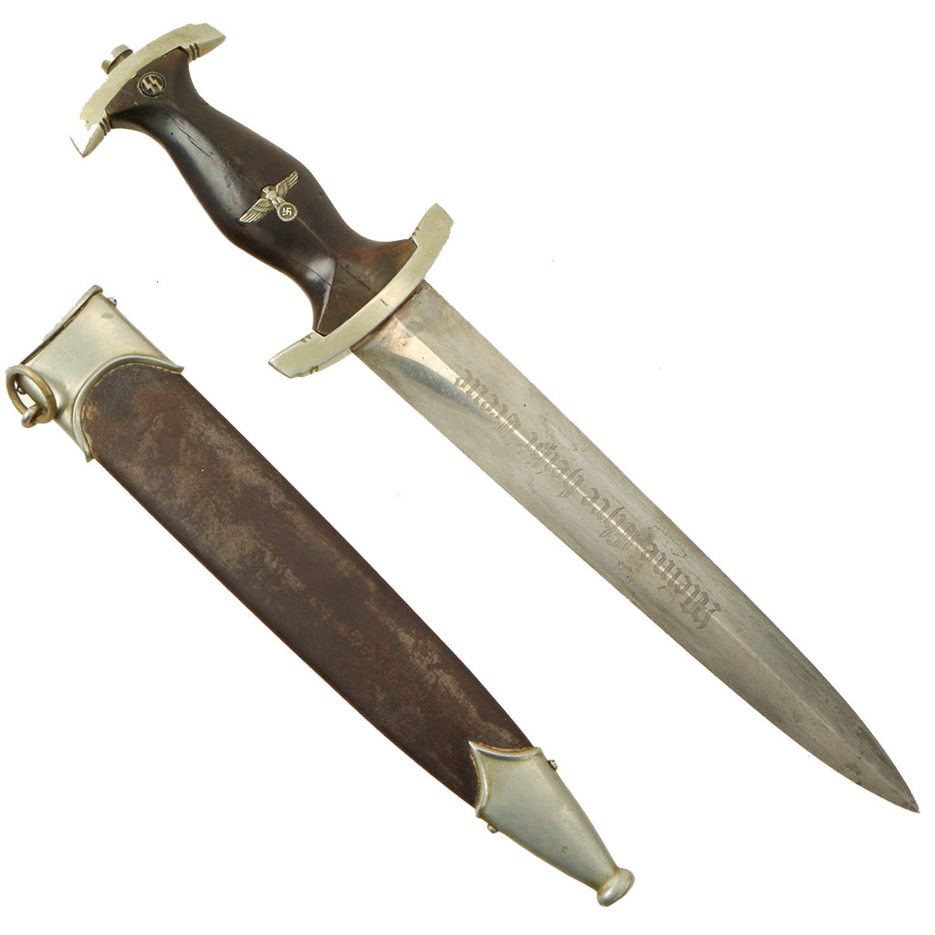 The SS Dagger was originally equipped with nickel crossguards with an ebony wood grip. The black grip contained a National eagle with swas insignia recessed in the center area and an SS doppelte Siegrune (Double Sig/Victory Rune) (ᛋᛋ) button inset at the top. On early examples the scabbard shell surface was factory blackened using a metal bluing process. The scabbard had nickel mounts. The SS blade was a polished type containing the SS motto, Meine Ehre Heisst Treue (My Honor is Loyalty). Early examples were mostly hand-fit. Production of later examples was more standardized, using cheaper, nickel-plated fittings with black painted scabbard shells. They could be held with a standard belt hanger, or a much rarer vertical hanger.
