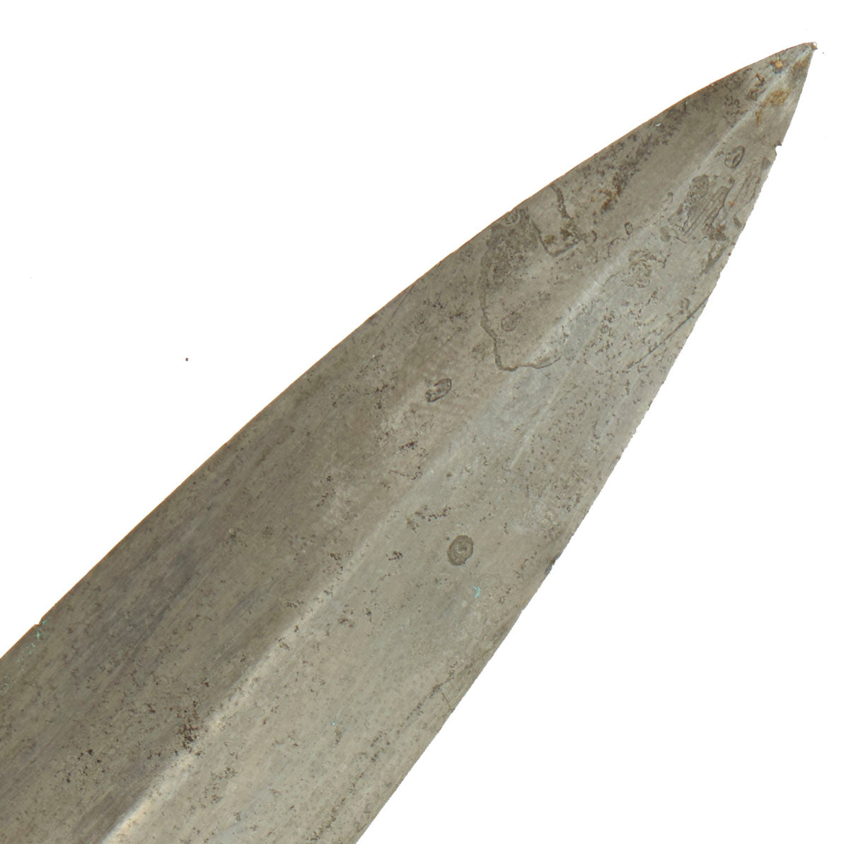 The crossguards of this dagger and tang nut are in very good condition throughout, and are of the earliest solid nickel silver construction. They have matured to a lovely oxidized patina. They are worn in places, showing that they are definitely solid nickel alloy. The front of the cross guard is marked in the center with SS District number I. The guards and grip are loose on the tang, due to the grip shrinking and the end nut bottoming out.
