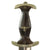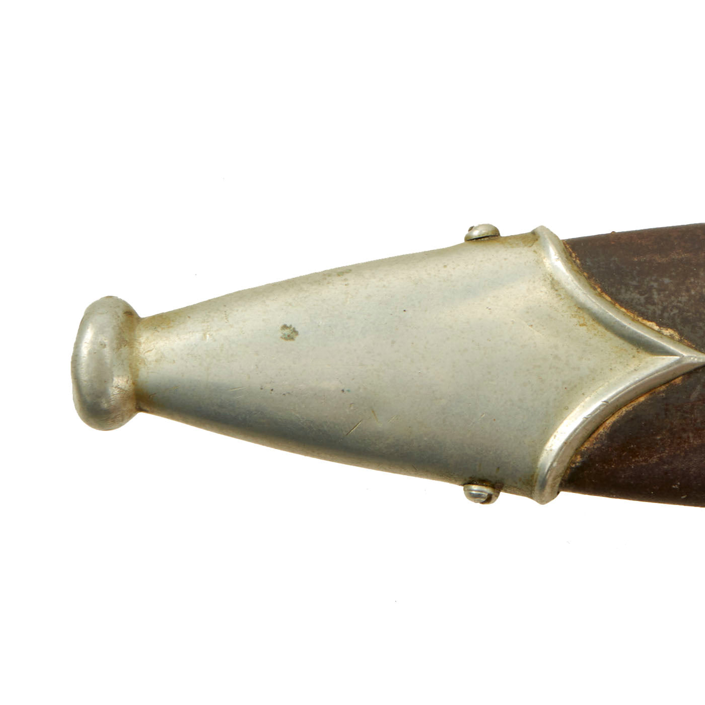 The scabbard shell is a solid example being straight as an arrow with a few tiny dents. The original black "anodized" finish however is all but gone, except for very close to the fittings. The rest of the steel shell now bears a lovely oxidized patina. The matching solid nickel silver scabbard mounts are in good condition. The lower ball is dented in fairly far, though it is not split. The weaker nickel alloy used in early models (later ones used steel) is unfortunately prone to denting. All four dome-headed screws are still present and in good shape.