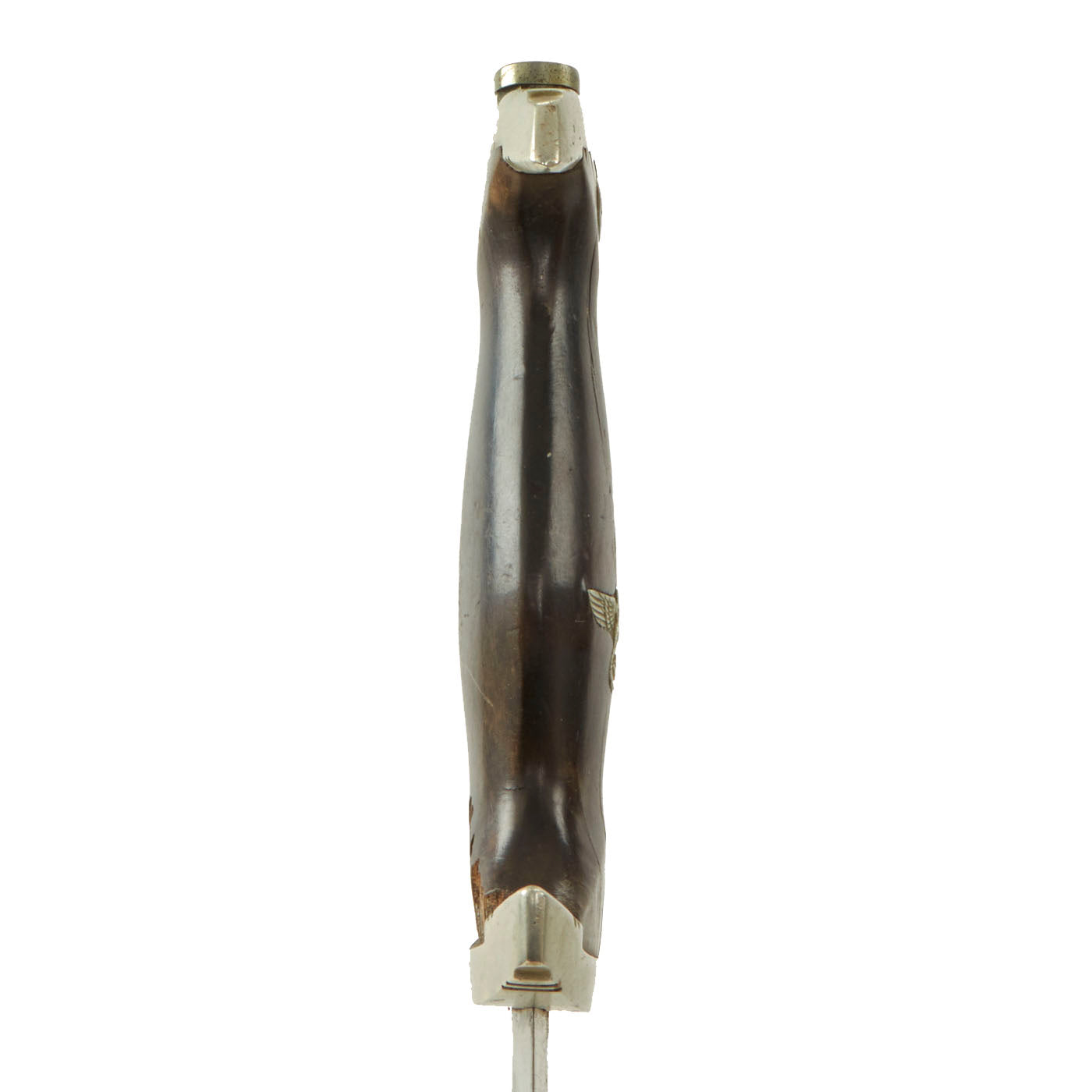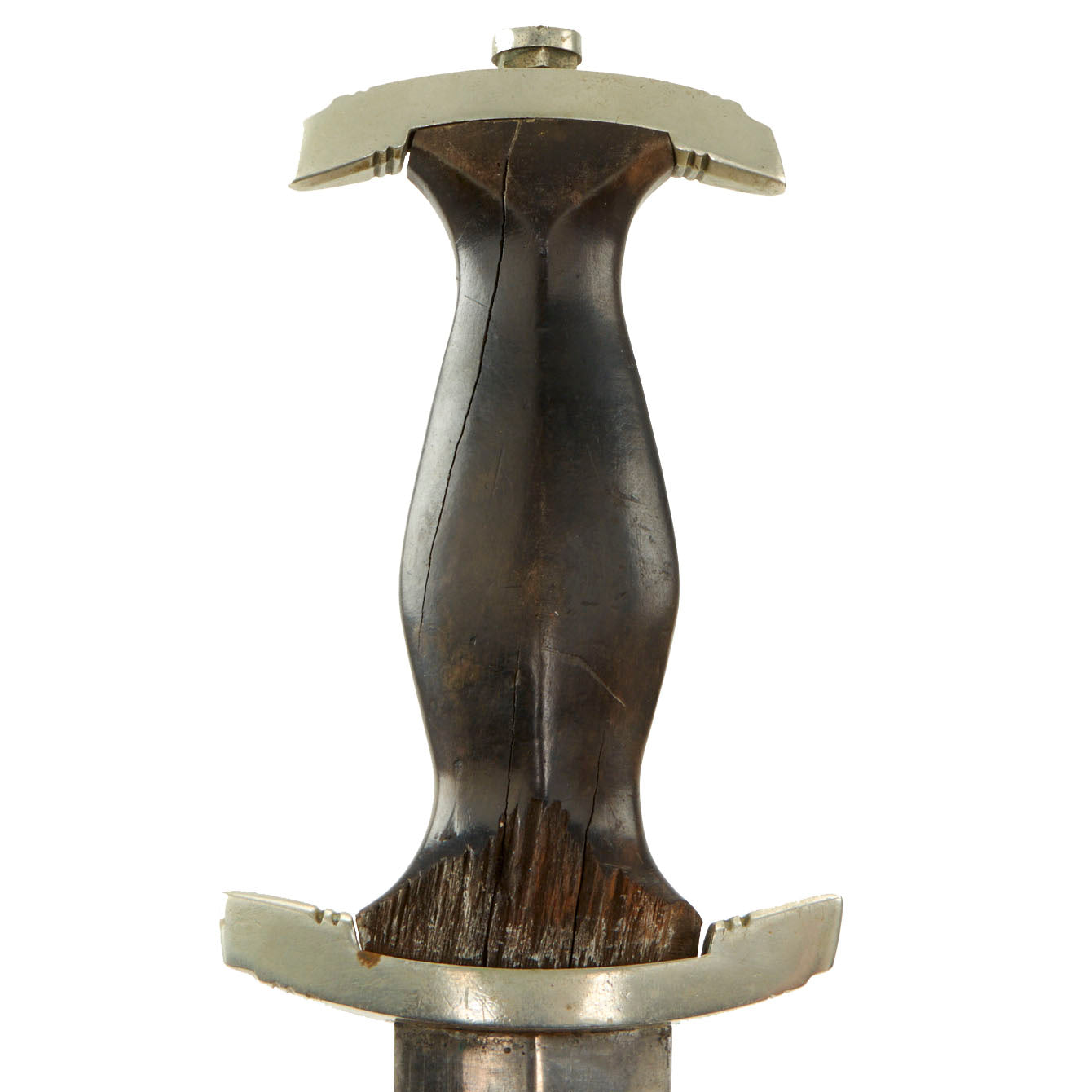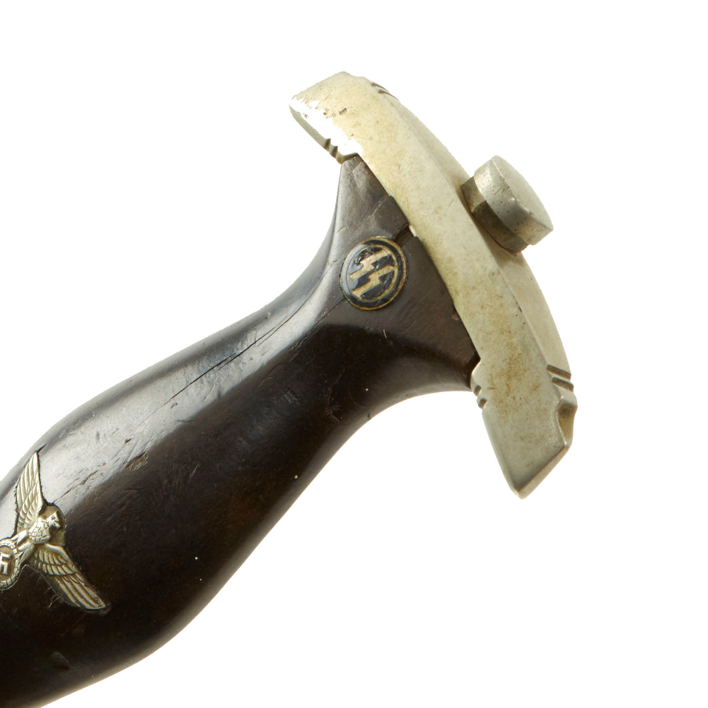 The ebony grip is present, but as with many we have see, has suffered significant damage over the years. The black dyeing process for the grips unfortunately causes the wood to become brittle, so this is unfortunately common. There are cracks running through the wood on both sides, and wood has chipped and fallen away on the rear of the grip near the crossguard. The runes button is positioned well and the enamel surfaces are intact. The silvered ᛋᛋ and double circles around them have a nice matching patina with the nickel still intact. Of particular note is that the runes meet the inner circle, which is a characteristic of the "120" maker, confirming that the grip has not been swapped out. The nickel grip eagle is the "high-necked" type with the beak pointing slightly up. It remains in good condition, showing very little wear, just a bit of light scratching and a few dents.